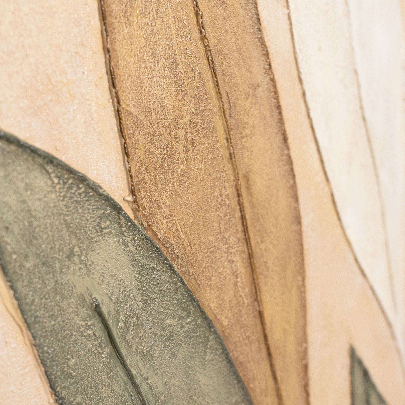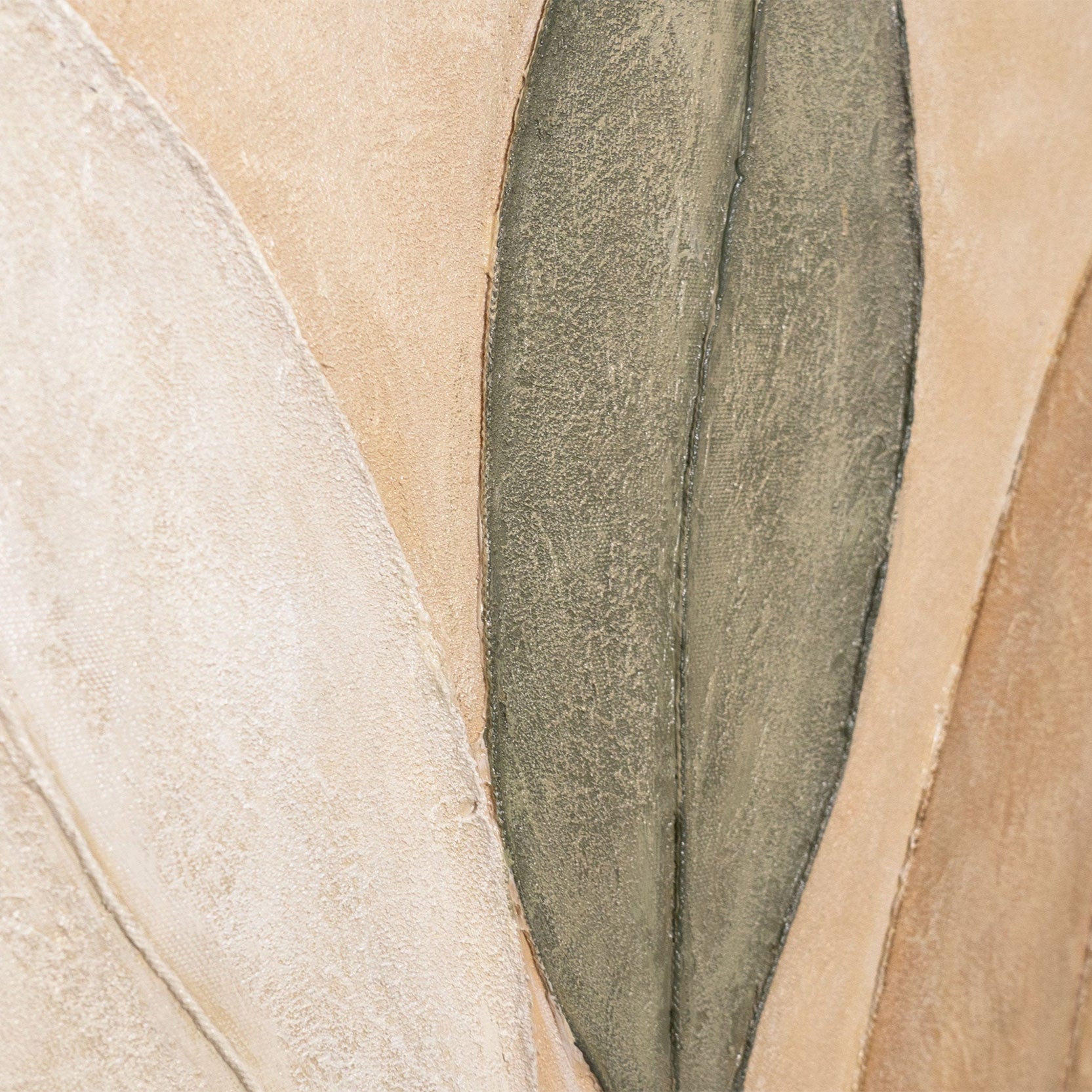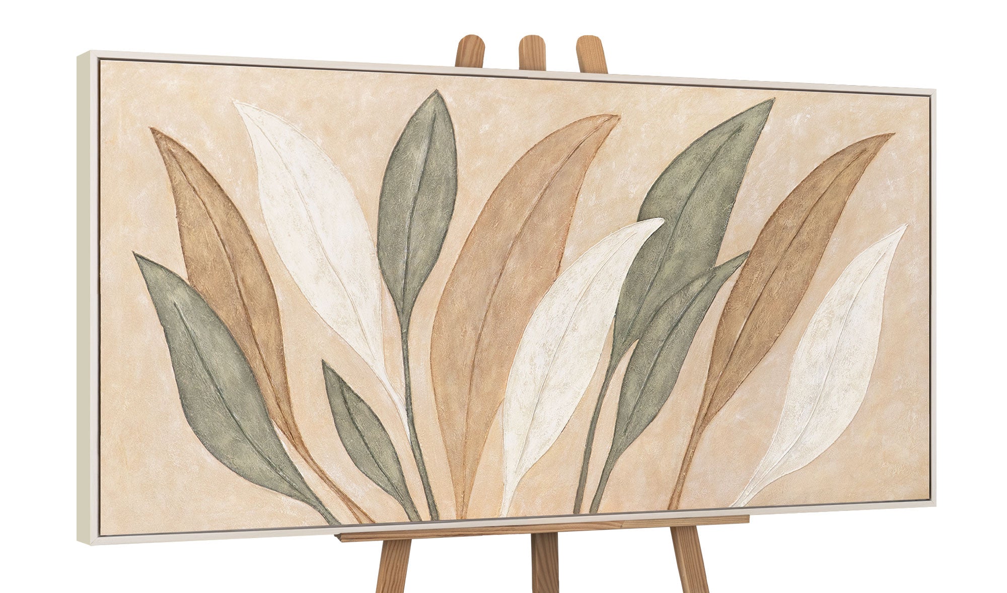 Bring naturens skønhed ind i dit hjem med det håndmalede lærredsmaleri "Bladenes dans". Bløde jordfarver i beige, brun og grøn smelter harmonisk sammen med klare linjer og en struktureret overflade. Den elegante komposition udstråler ro og naturlighed, mens de organiske bladmønstre tilfører en tidløs lethed.