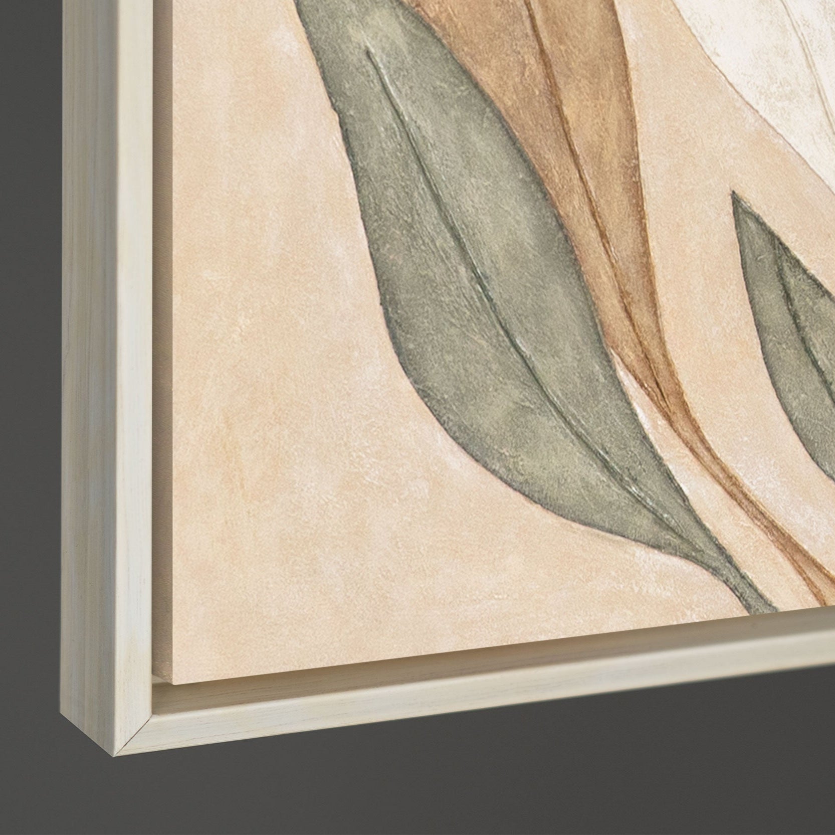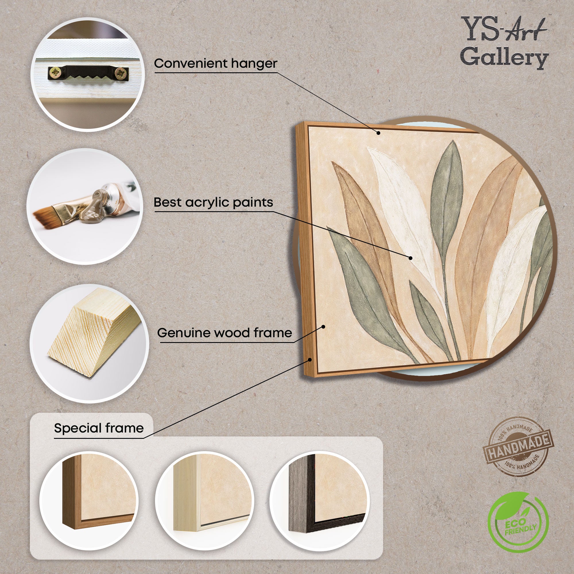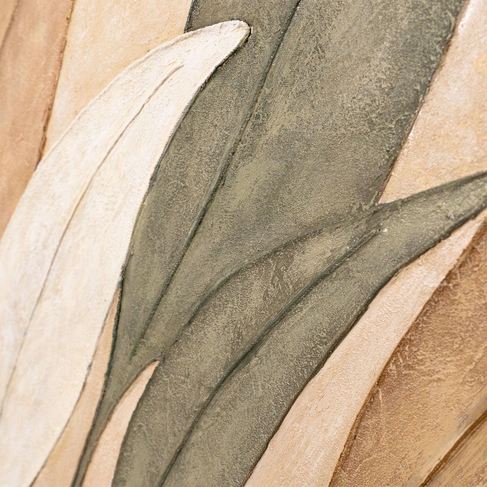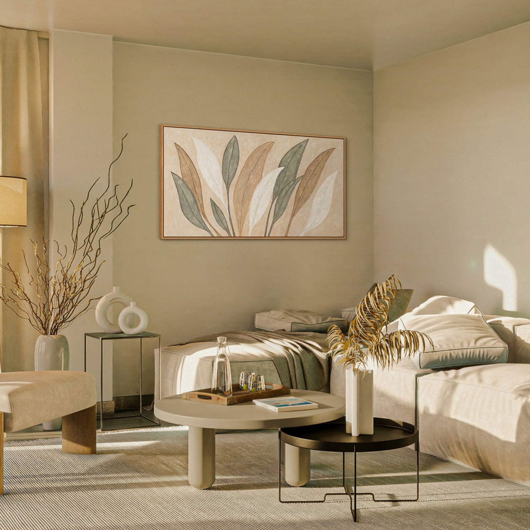 Bring naturens skønhed ind i dit hjem med det håndmalede lærredsmaleri "Bladenes dans". Bløde jordfarver i beige, brun og grøn smelter harmonisk sammen med klare linjer og en struktureret overflade. Den elegante komposition udstråler ro og naturlighed, mens de organiske bladmønstre tilfører en tidløs lethed.