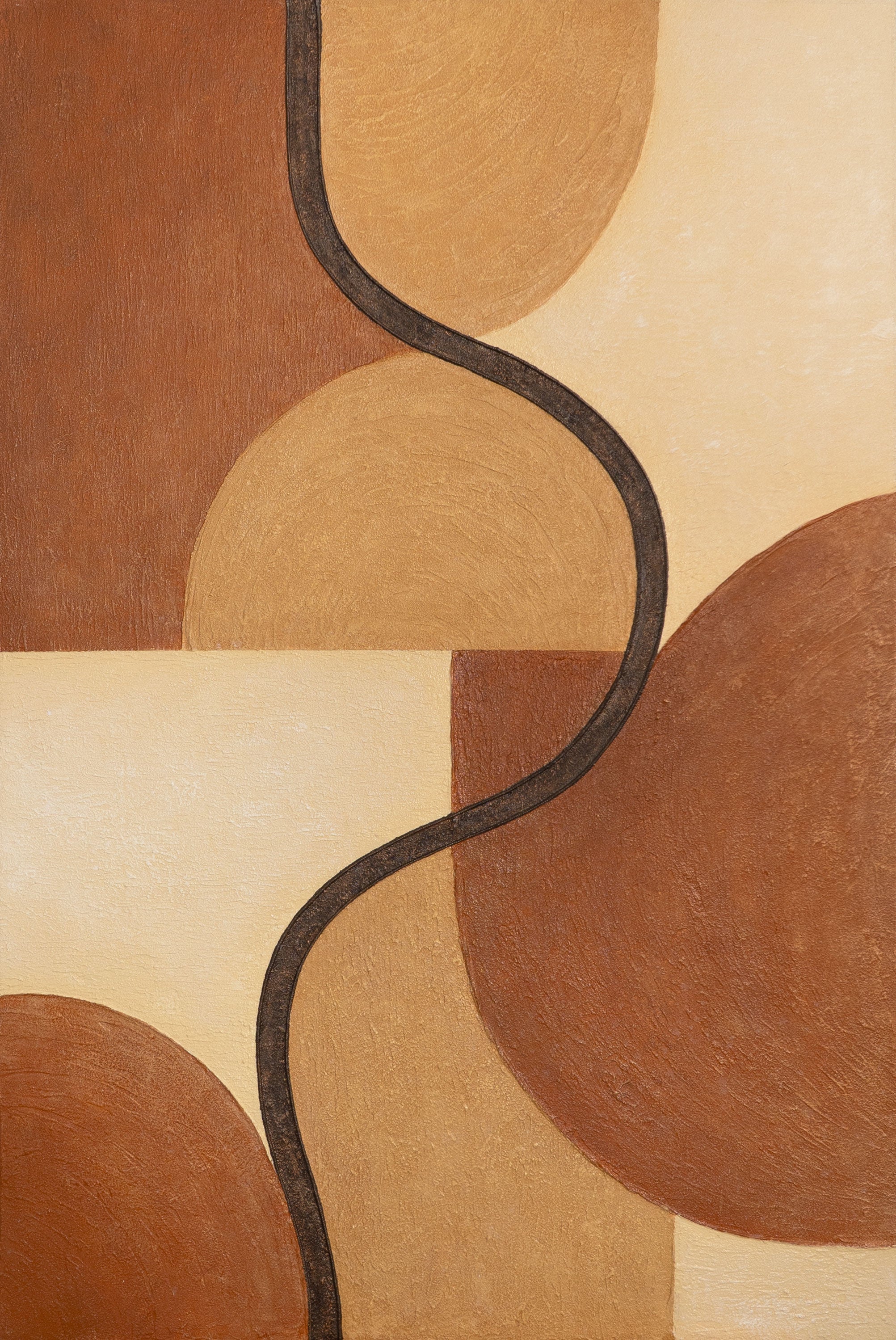 "Forbindelse af former" er et håndmalet acrylmaleri, der imponerer med sin harmoniske kombination af linjer og flader. Kompositionen i varme nuancer af brun, beige og okker skaber naturlig dybde og en følelse af bevægelse. Den strukturerede overflade giver de geometriske former dynamik og en moderne, taktil udstråling.