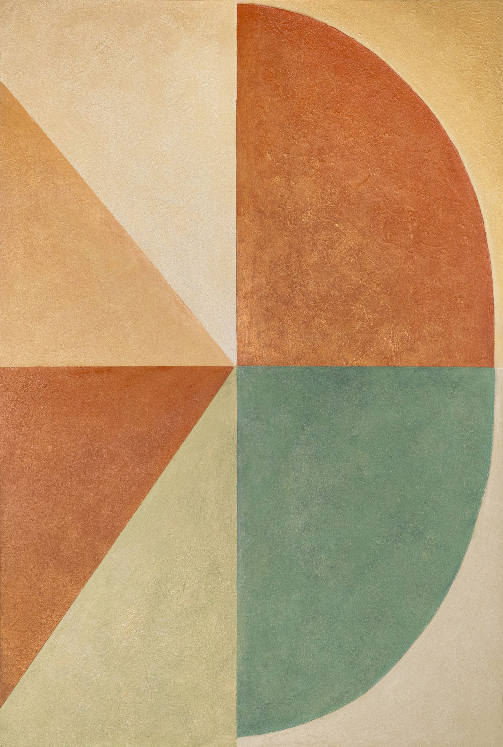 "Former i balance" er et håndmalet acrylmaleri på lærred, der imponerer med sine geometriske flader og harmoniske farveopdelinger. Varme orange- og beigenuancer møder køligt grønt og blødt creme, hvilket skaber en afbalanceret komposition, der udstråler ro og harmoni. Den strukturerede overflade giver værket dybde og fremhæver det kunstneriske håndværk.