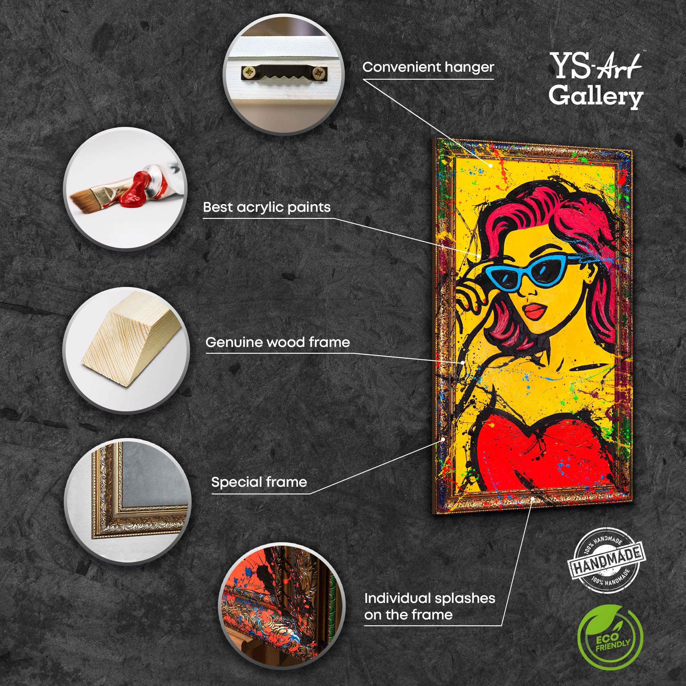 Denne moderne vægdekoration kombinerer abstrakt kunst med pop-art livsstil og gør enhver stue, kontor eller loft til et kreativt højdepunkt. Hvert detalje er håndlavet – et unikt kunstværk fuld af udtrykskraft.