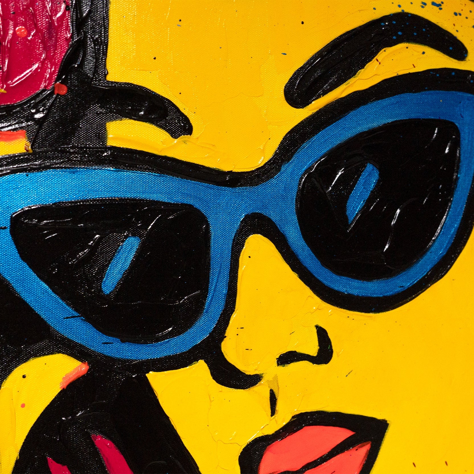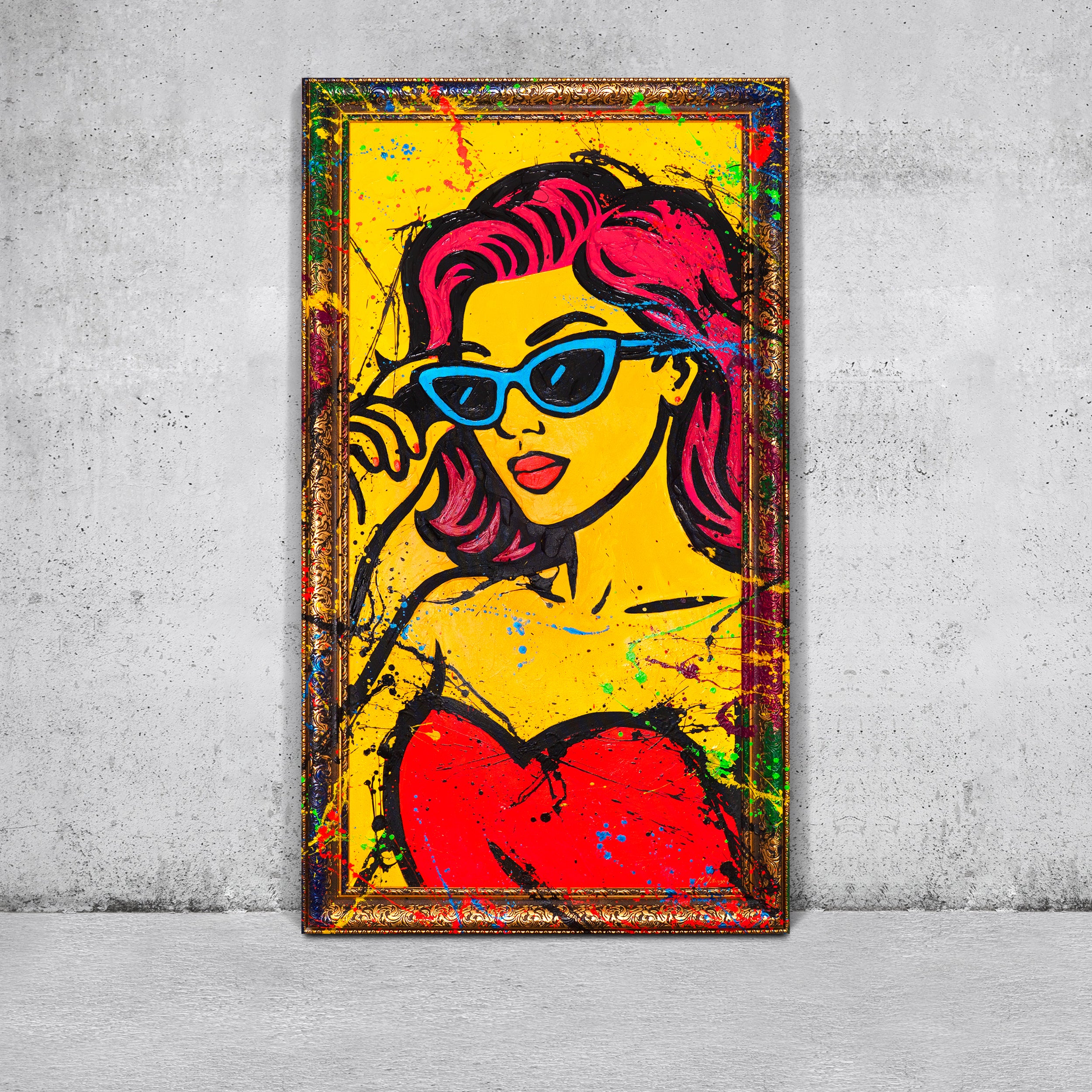 Det håndmalede lærredsbillede „Miss WOW“ er et ægte blikfang: En kvinde i pop-art tegneseriestil med lyse gule og røde farver, fremhævet af kraftige linjer og urban energi.