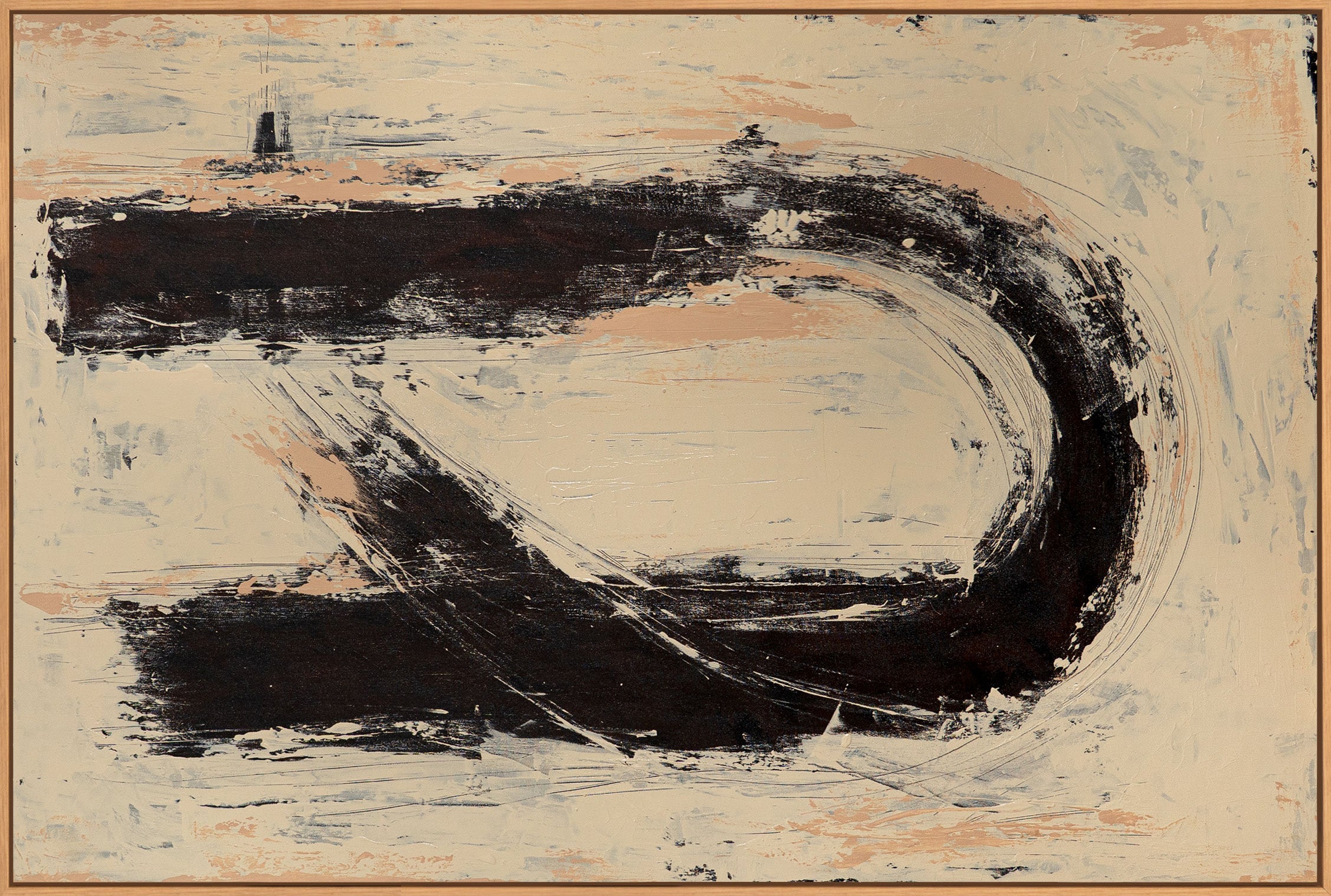 "Silence in Between" er et minimalistisk abstrakt akrylmaleri, der skaber en fængslende balance gennem dristige sorte penselstrøg og rolige, lyse områder. De flydende linjer fremstår spontane, men kontrollerede, mens de bløde beige og cremefarvede toner giver værket dybde og visuel ro. Den teksturerede overflade understreger akrylmaleriets håndmalede karakter.