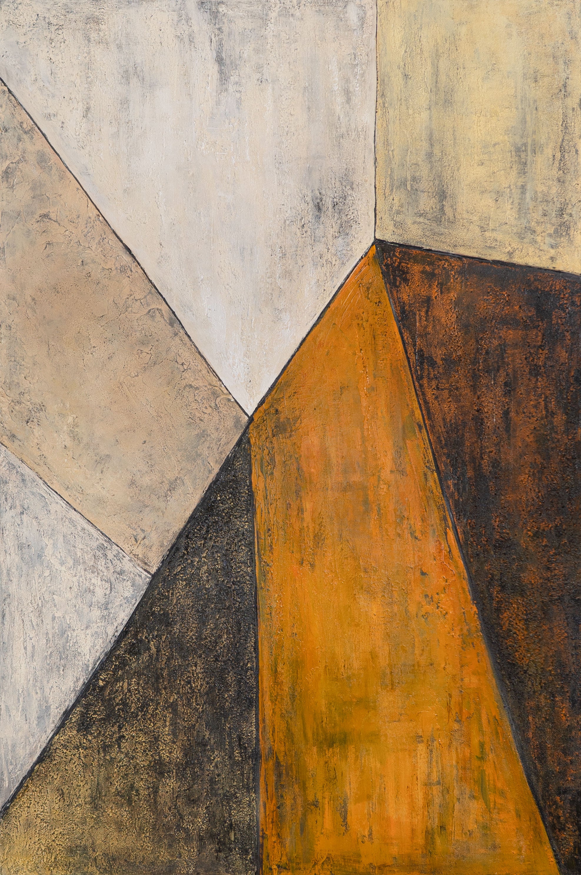 "Mødet mellem planerne" er et håndmalet acrylmaleri, der forener geometriske flader og blid struktur i harmonisk balance. Den kontrastfulde farvepalet af varm orange, afdæmpet sort og lys beige giver værket dybde og dynamik. Den strukturerede overflade fanger lyset på subtil vis og skaber et spil af form, farve og tekstur.