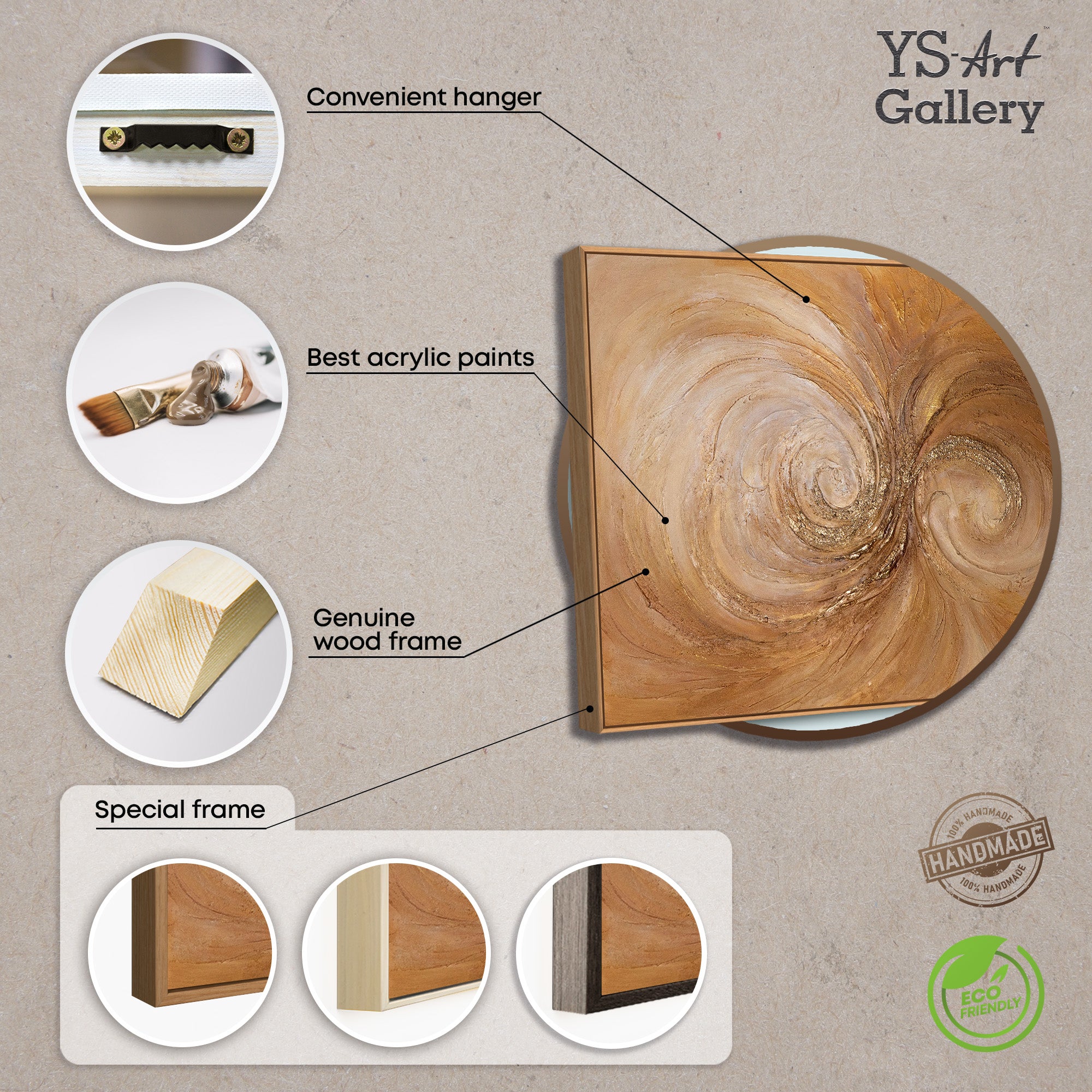 • Abstraktes Kunstbild mit kreisförmigem Wirbel in Gold- und Sandfarben, Detailansicht