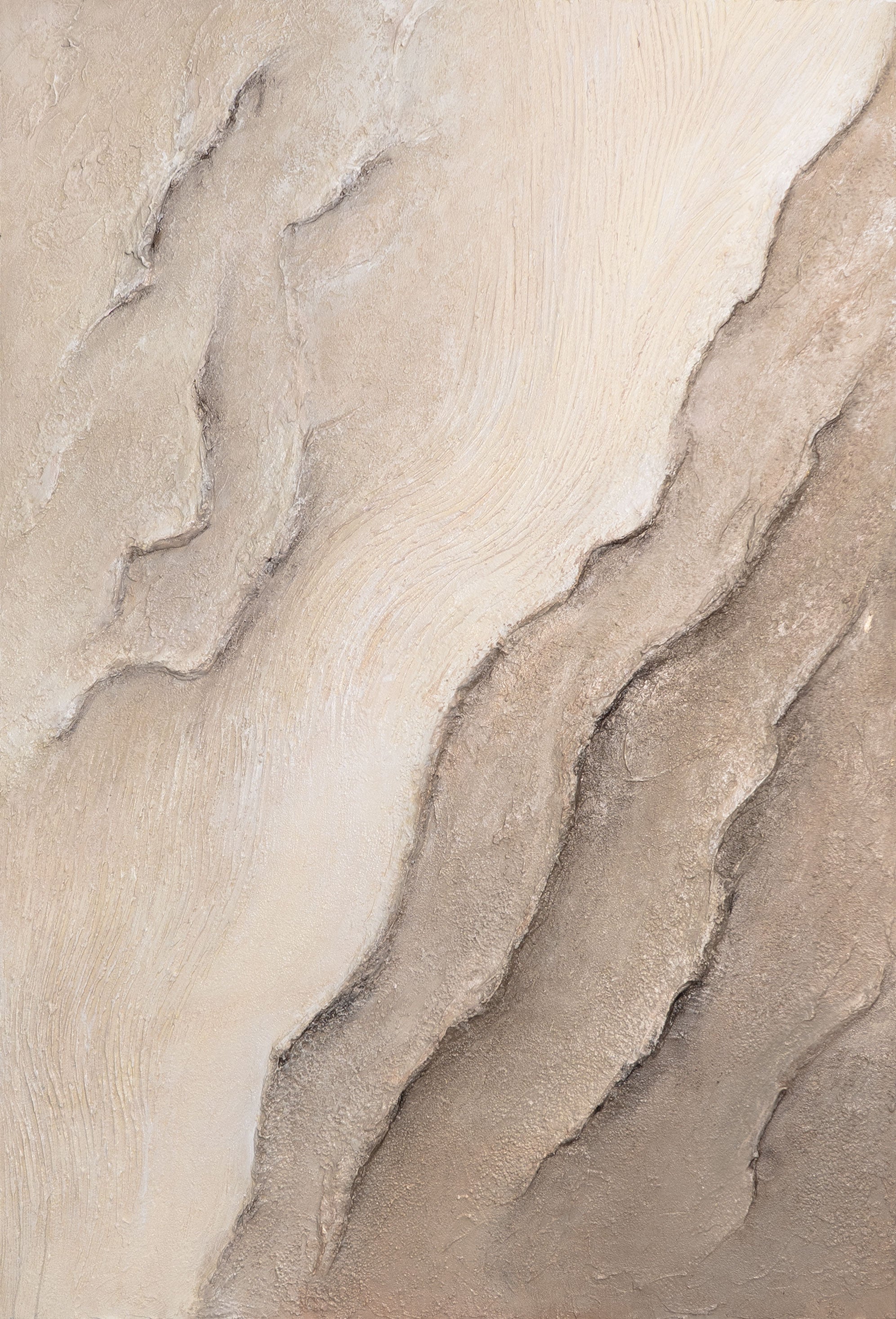 "Tidens Spor" er et håndmalet acrylmaleri, der imponerer med sine bløde linjer og harmoniske strukturer. Farvepaletten i beige-, sand- og naturtoner udstråler ro og tidløshed, mens den reliefagtige struktur tilfører værket dybde og naturlighed. Hver fine linje minder om geologiske lag og skaber en organisk, næsten meditativ virkning.