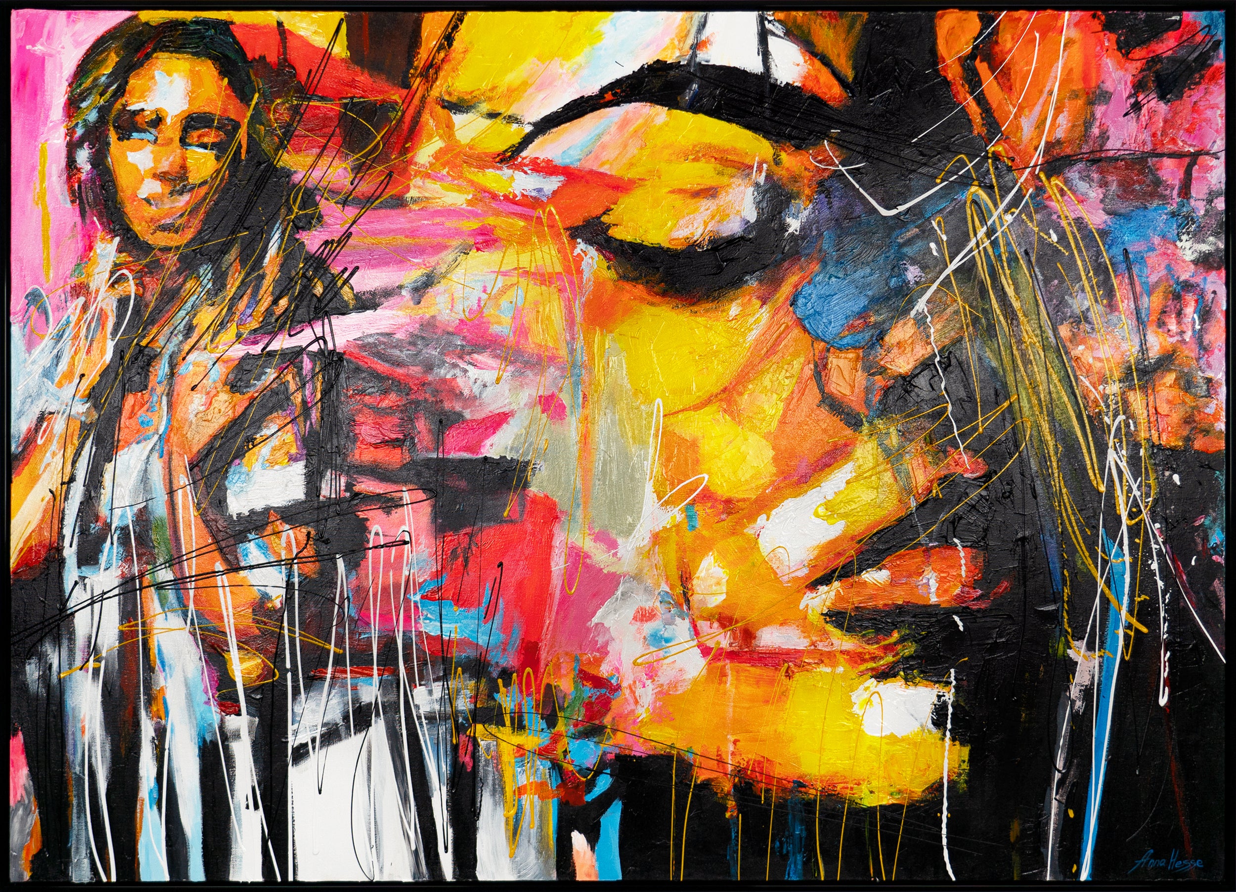 Berig dit hjem eller kontor med dette farverige, abstrakte kunstværk, der med levende røde, gule og pink nuancer skaber en dynamisk og moderne komposition. Billedet imponerer med stærke kontraster og ekspressive penselstrøg. Det er 100% håndmalet og fremhæves af en elegant ramme.