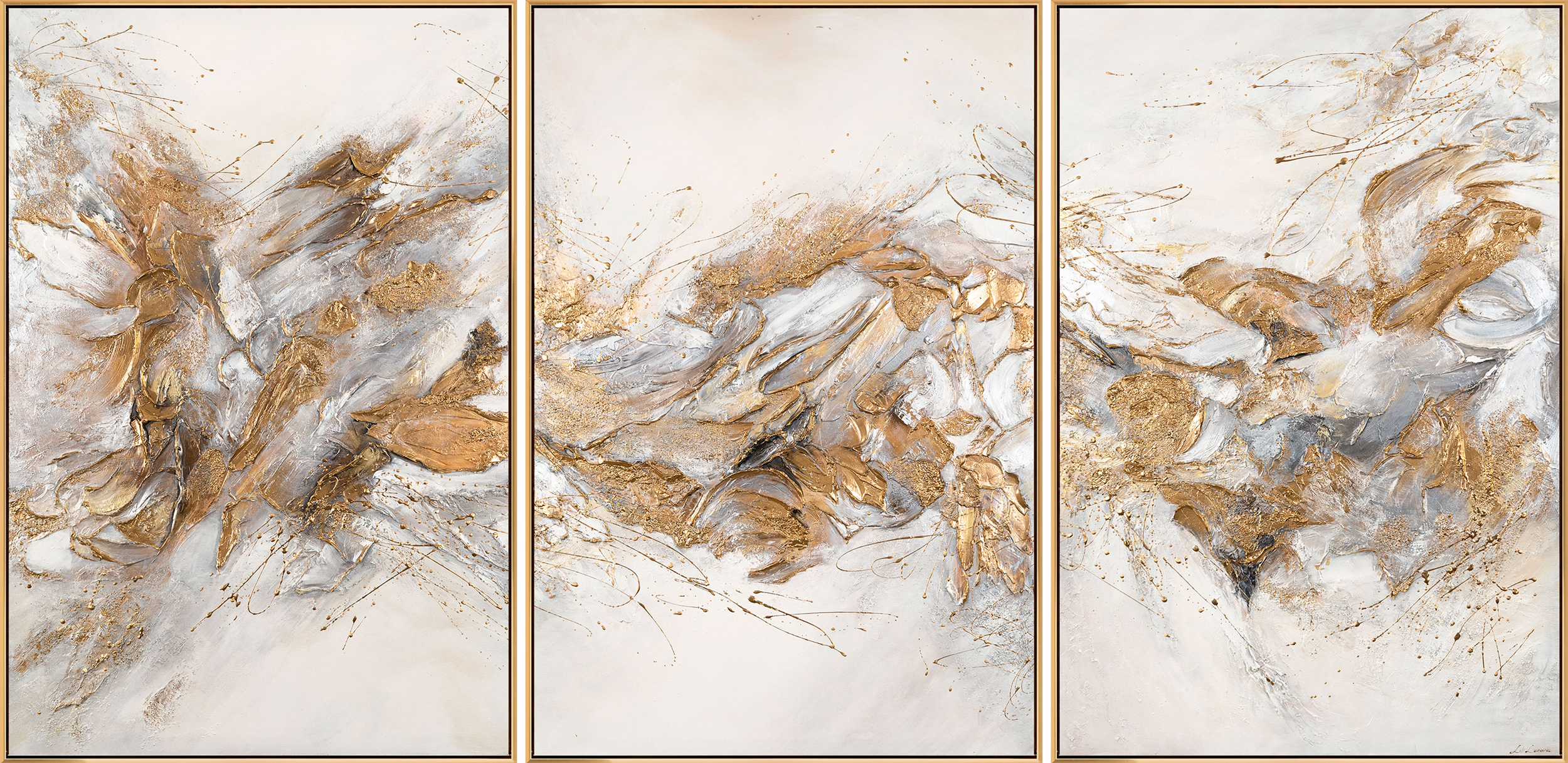 Berig dit hjem eller kontor med dette elegante, abstrakte triptykon, der med gyldne og hvide toner skaber en harmonisk komposition. Værket imponerer med kraftige farvenuancer og ekspressive penselstrøg. Det er 100% håndmalet og præsenteres i moderne, guldfarvede rammer.