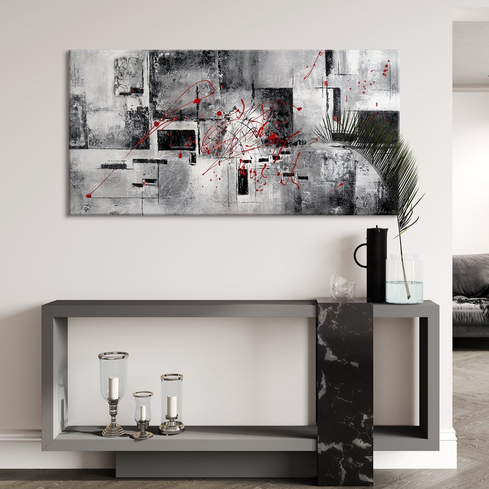Et flerfarvet billede i gråtoner med rødt accent passer perfekt ind i en bylejlighed eller et sommerhus, i stuen eller arbejdsrummet.