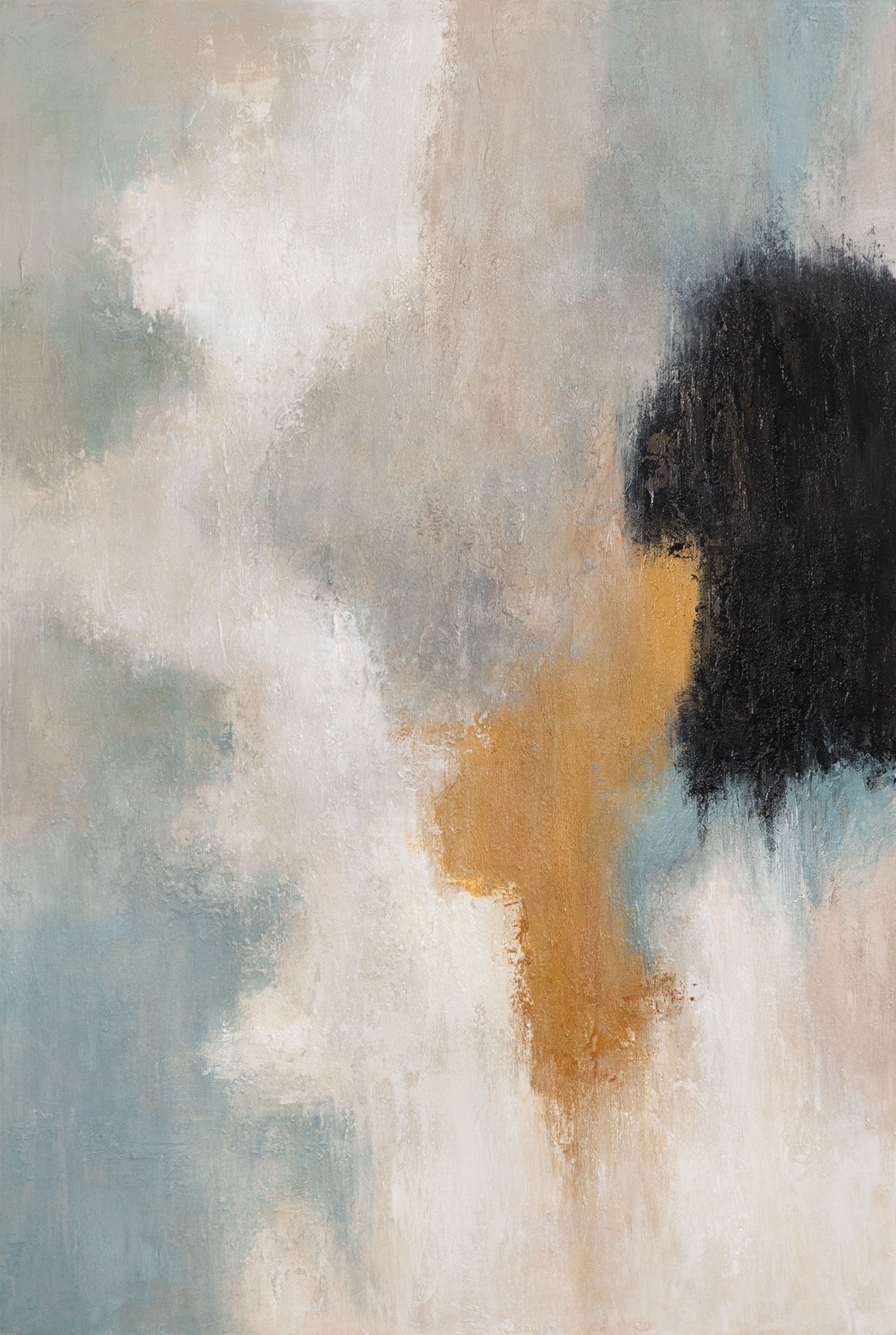 "Lysovergange" er et moderne, håndmalet akrylmaleri, der fascinerer med sin harmoniske kombination af lyse beige, bløde blå og dybe sorte toner. Varme guldakcenter giver maleriet en særlig glød, mens den reliefagtige struktur understreger dybde og bevægelse.