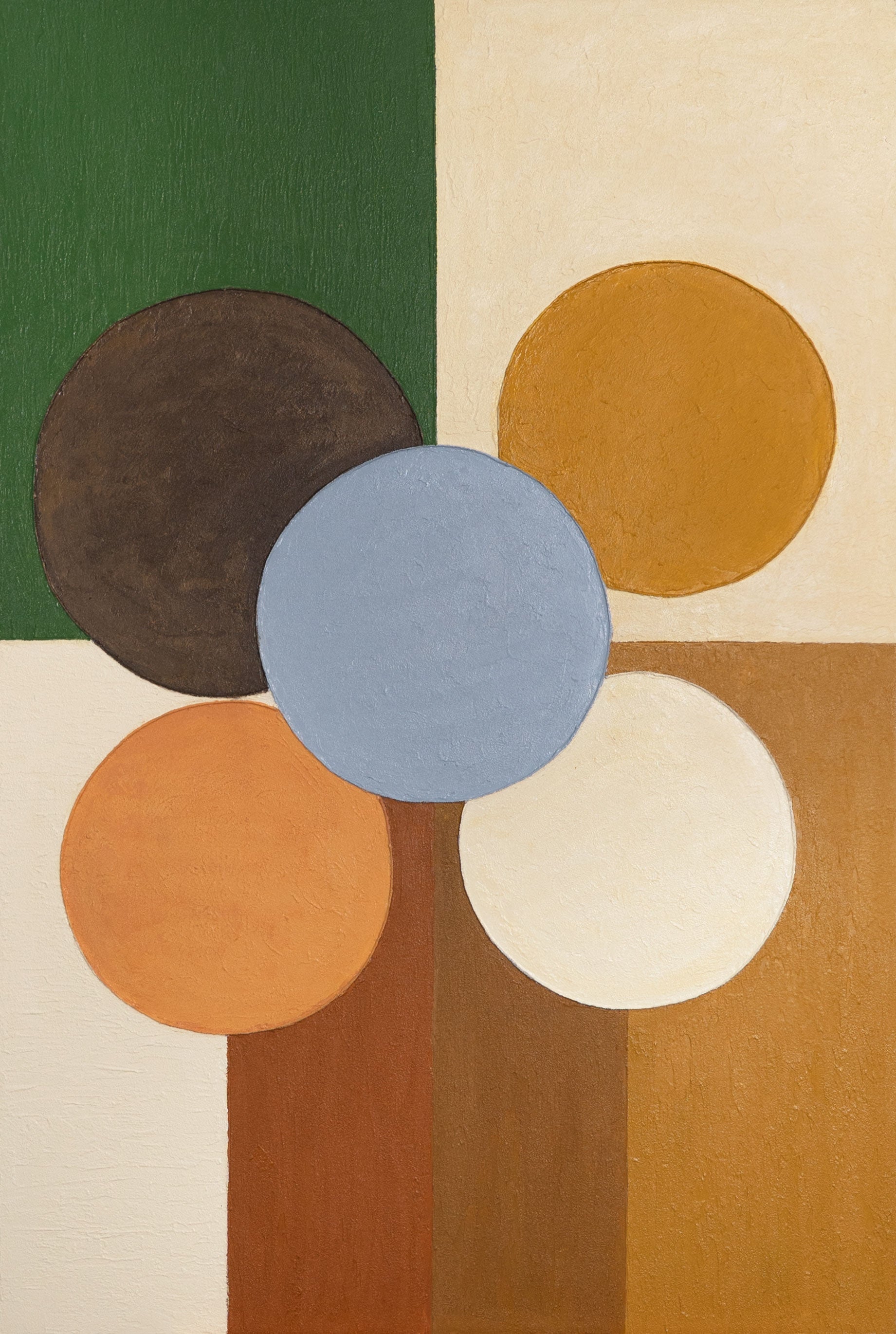 "Sfære af balance" er et moderne, håndmalet acrylmaleri på lærred, der fascinerer med sine klare geometriske former og harmoniske farvefelter. Jordnære brune og beige toner forenes med blidt grønt, strålende orange og køligt blå, hvilket skaber en komposition, der udstråler ro og balance. Den strukturerede overflade giver værket dybde og en unik taktil oplevelse.