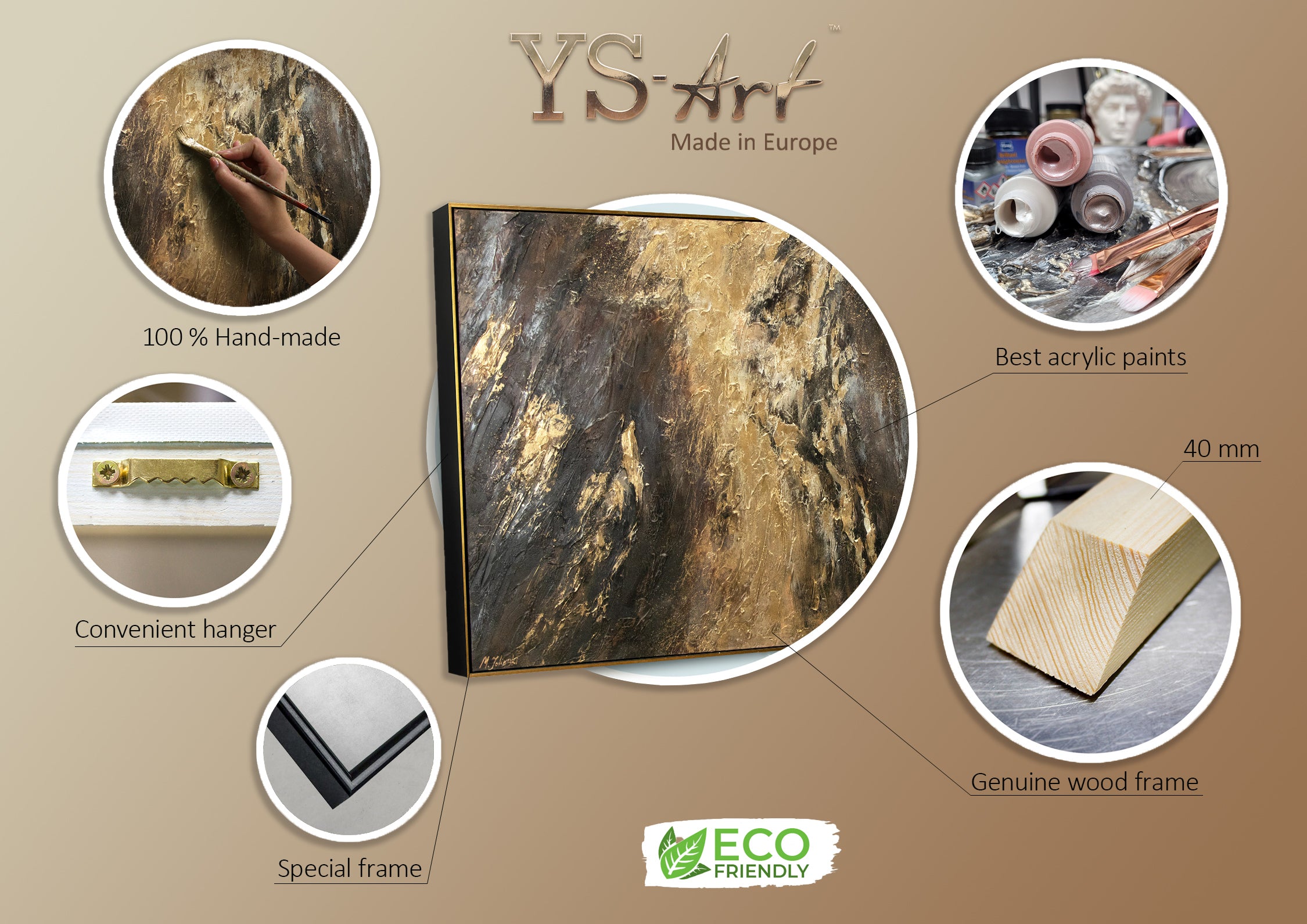 Hvert moderne kunst billede på lærred fra vores YS Art Delux-serie er signeret af kunstneren, og der medfølger et ægthedscertifikat. Hos os bliver alt stadig lavet i hånden – fra fremstilling af en kilekant, opstramning af det kvalitetsrige lærred, til maleriet og naturligvis den sikre emballering.