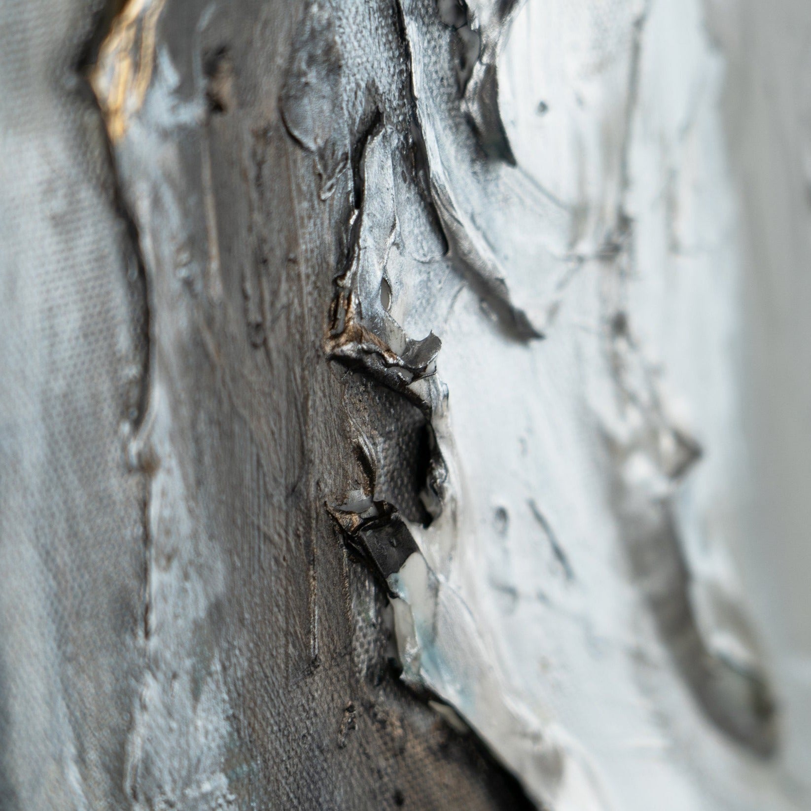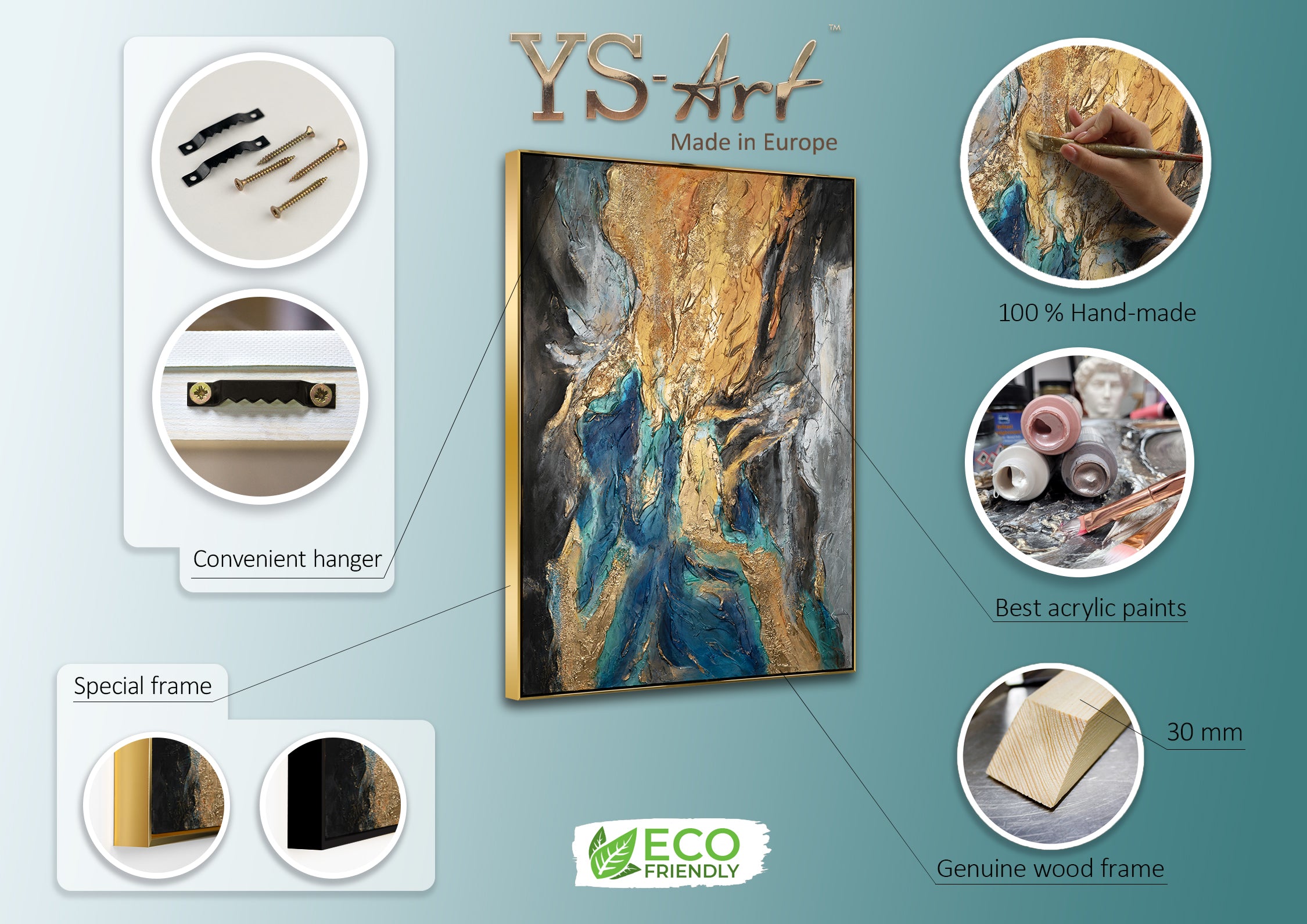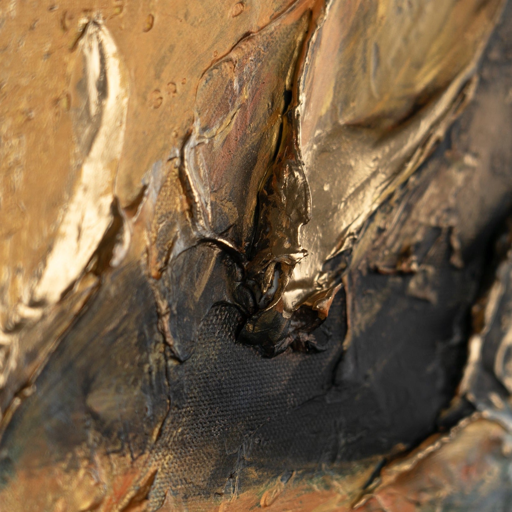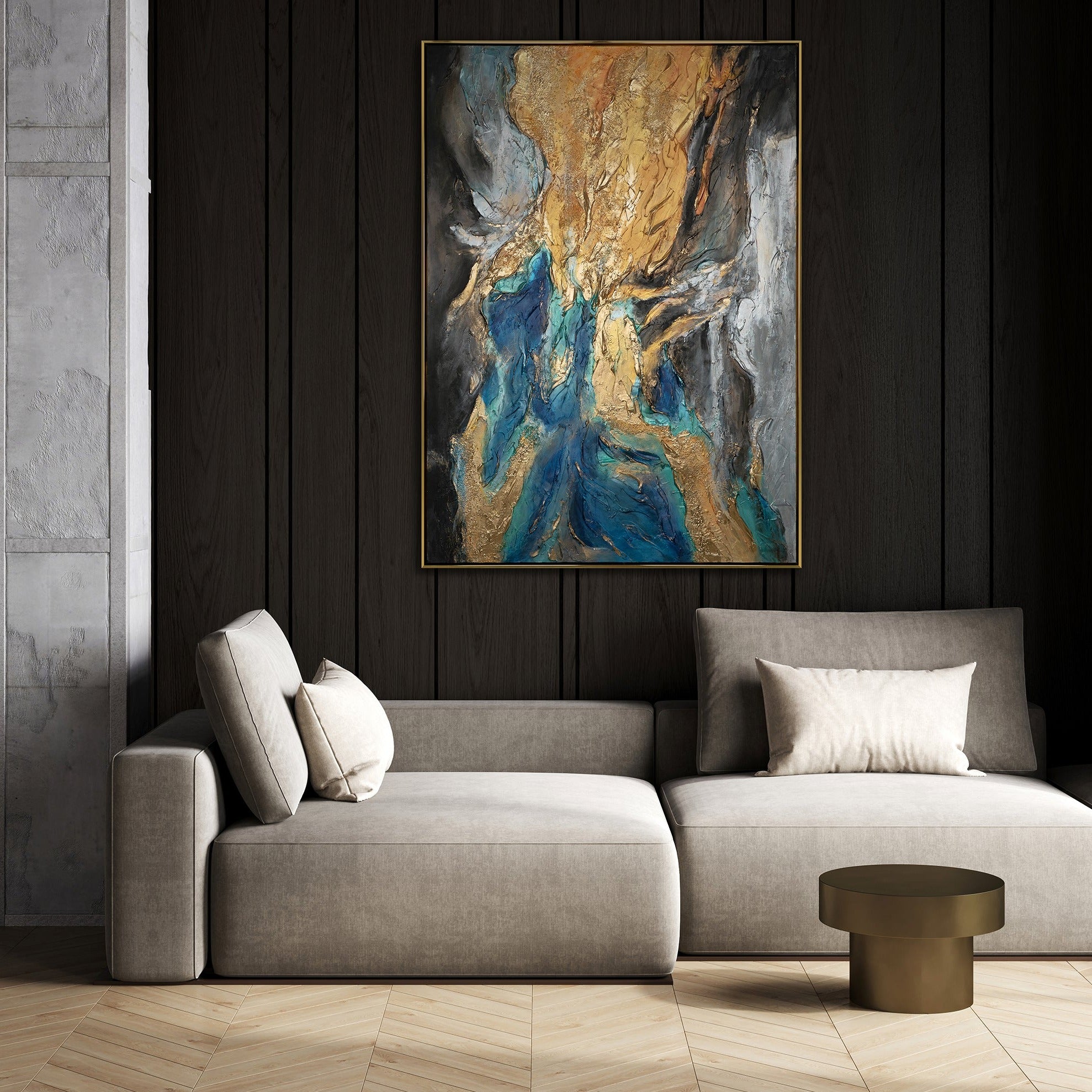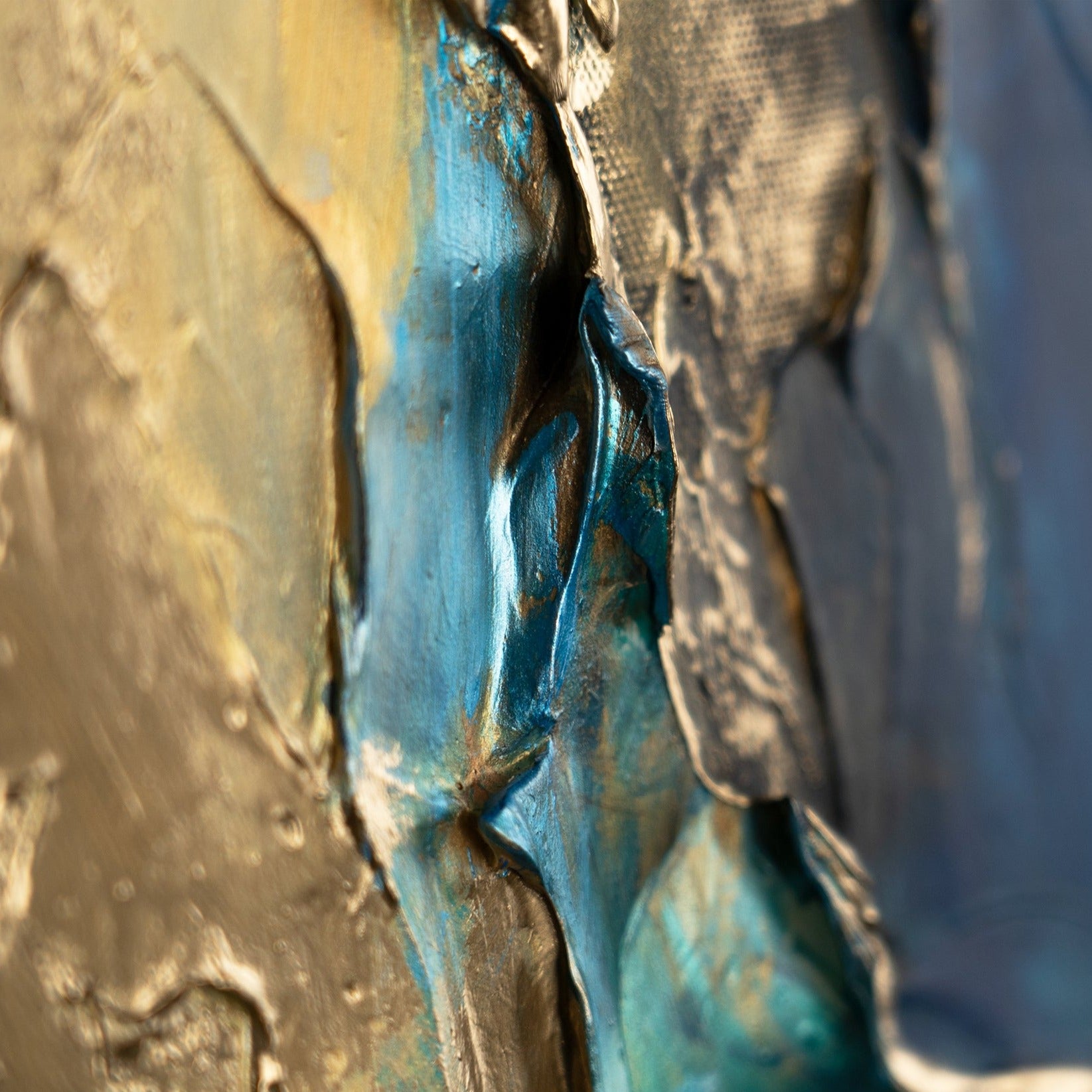 Oplev elegance og bevægelse gennem "Abstrakt symfoni" – et betagende håndmalet akrylmaleri med struktureret overflade og intense farver i blå, guld og sort. Det dramatiske udtryk skaber dybde og liv, hvilket gør det ideelt som moderne vægkunst i stue, kontor eller soveværelse. Hvert værk er et originalt kunststykke, skabt med præcision og passion.