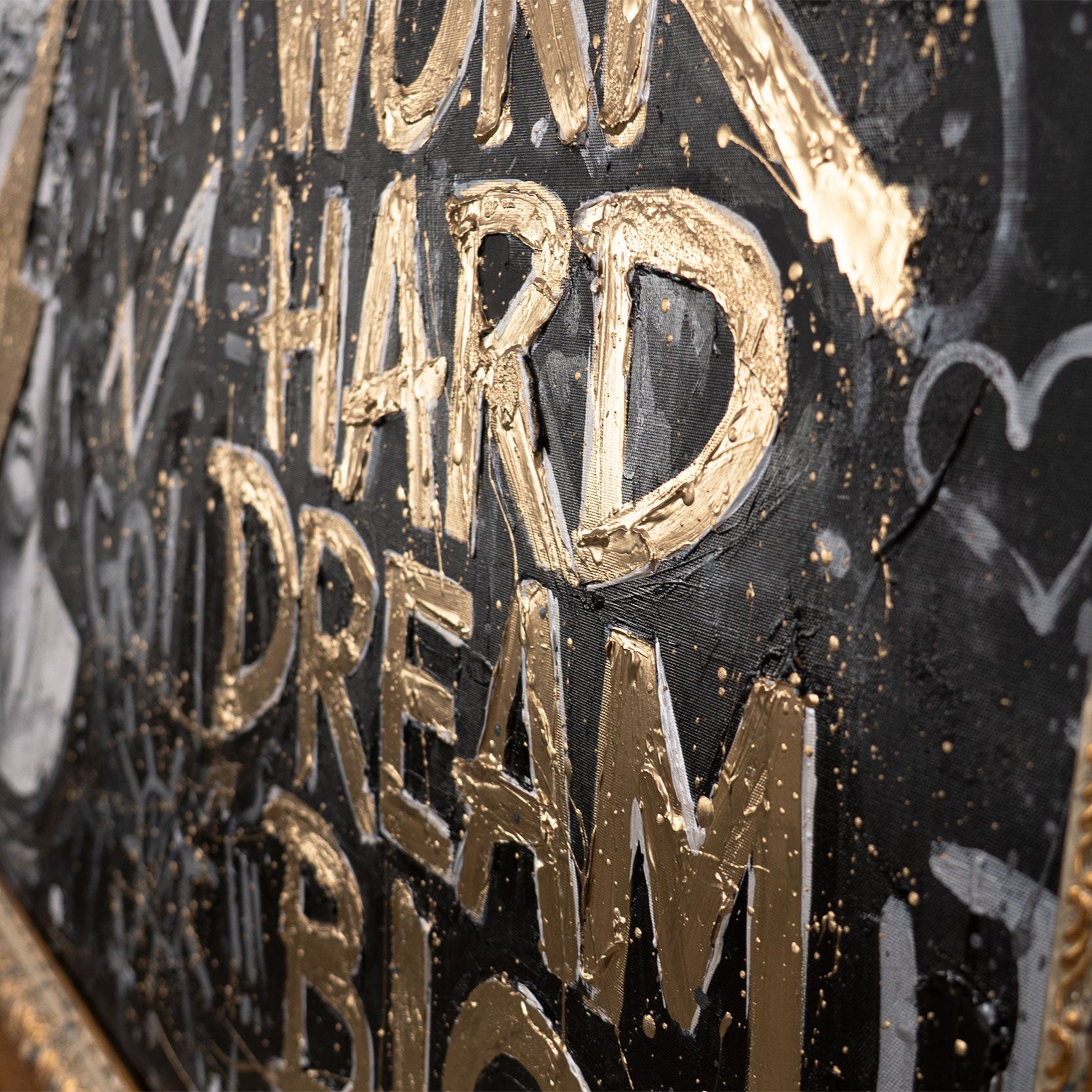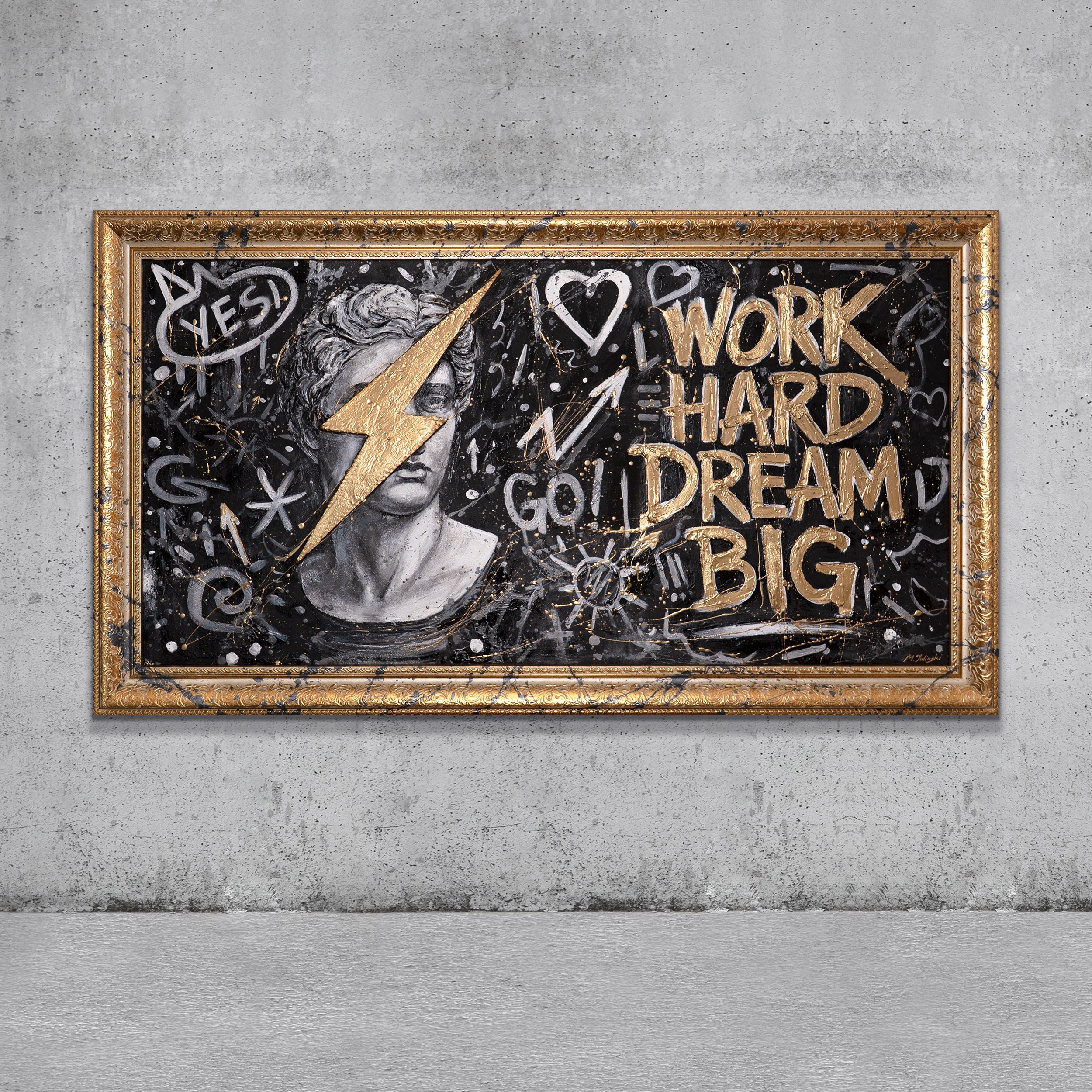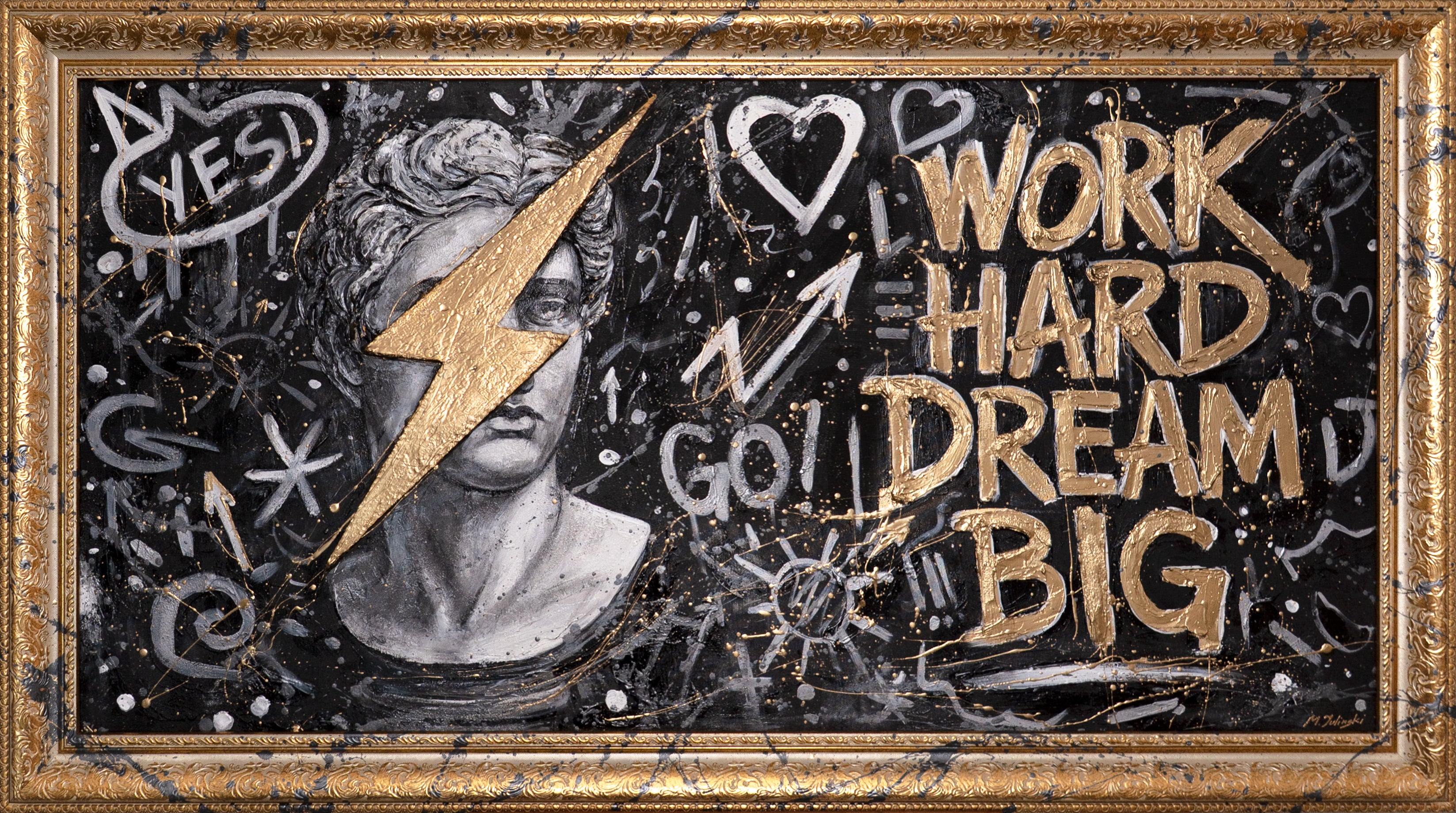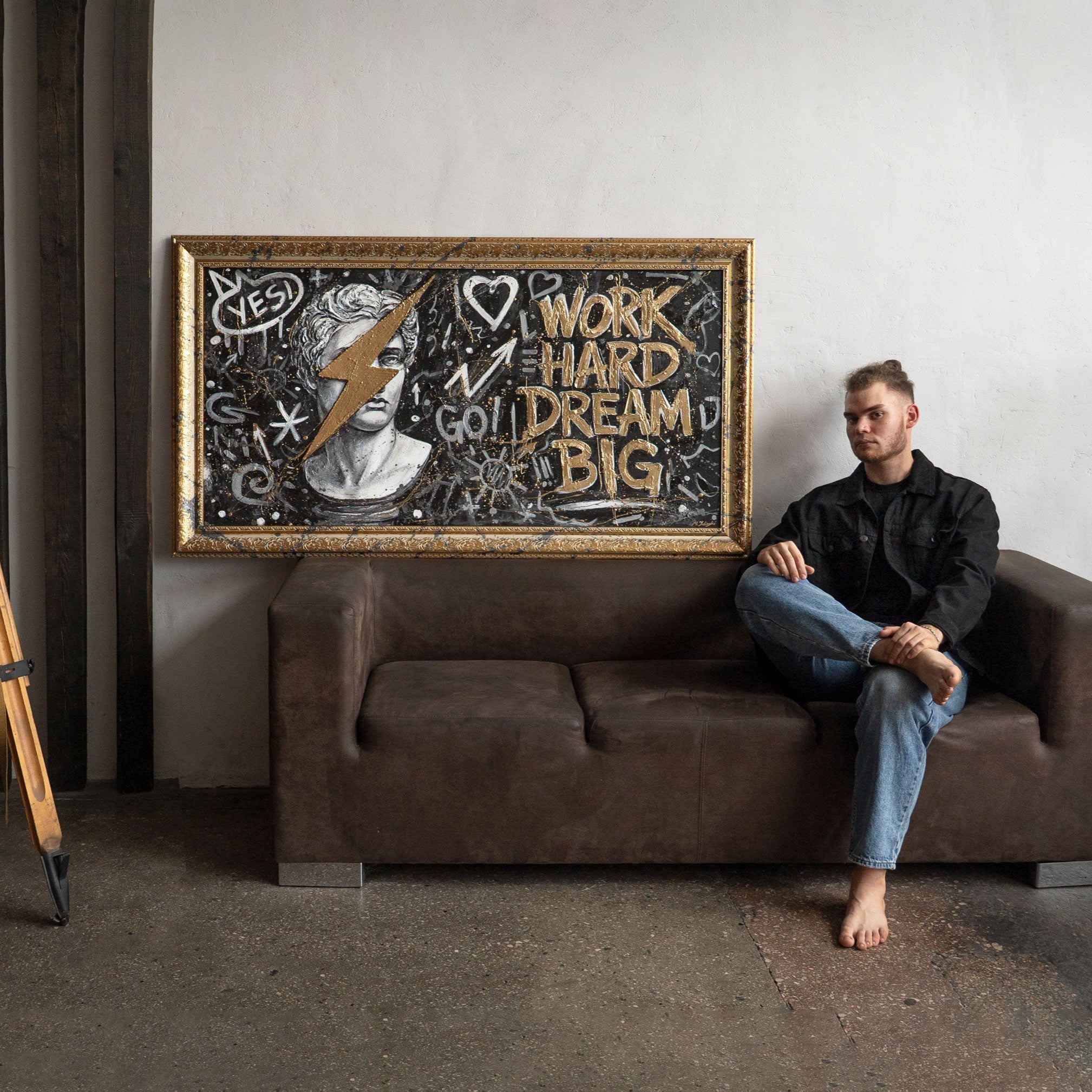 Dette håndmalede lærredsbillede „Kunst af Motivation“ kombinerer urban street art med en inspirerende besked: Work Hard, Dream Big. Det gyldne lyn, der rammer den antikke bust, omgives af udtryksfulde symboler som hjerter, pile og stjerner. Hvert penselstrøg er unikt – en fusion mellem klassisk skulptur og moderne motivkunst.