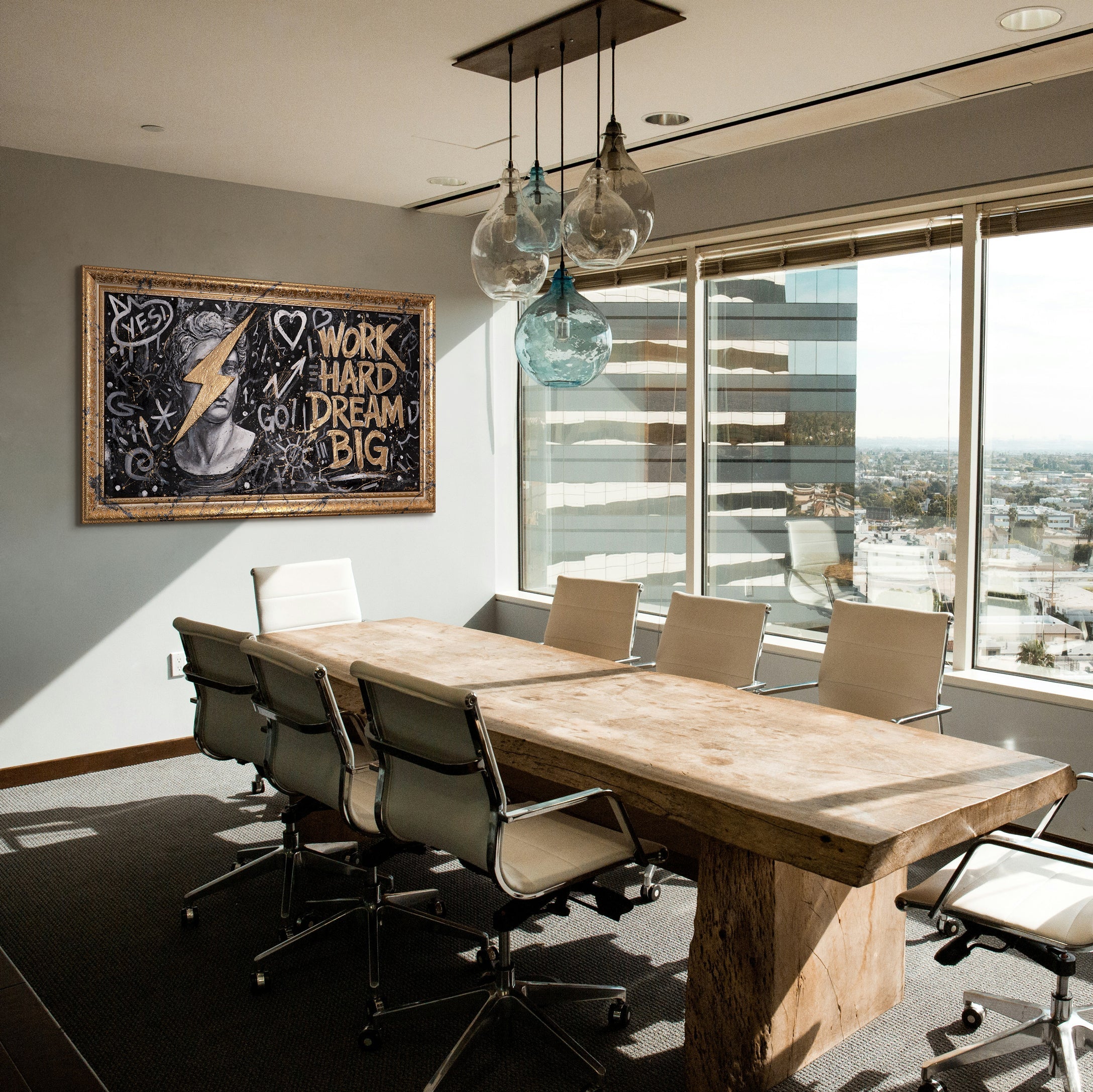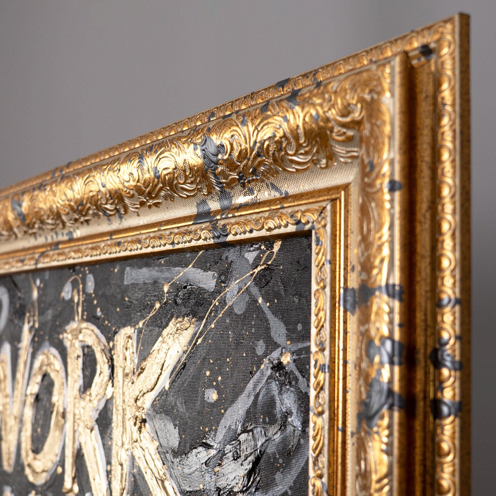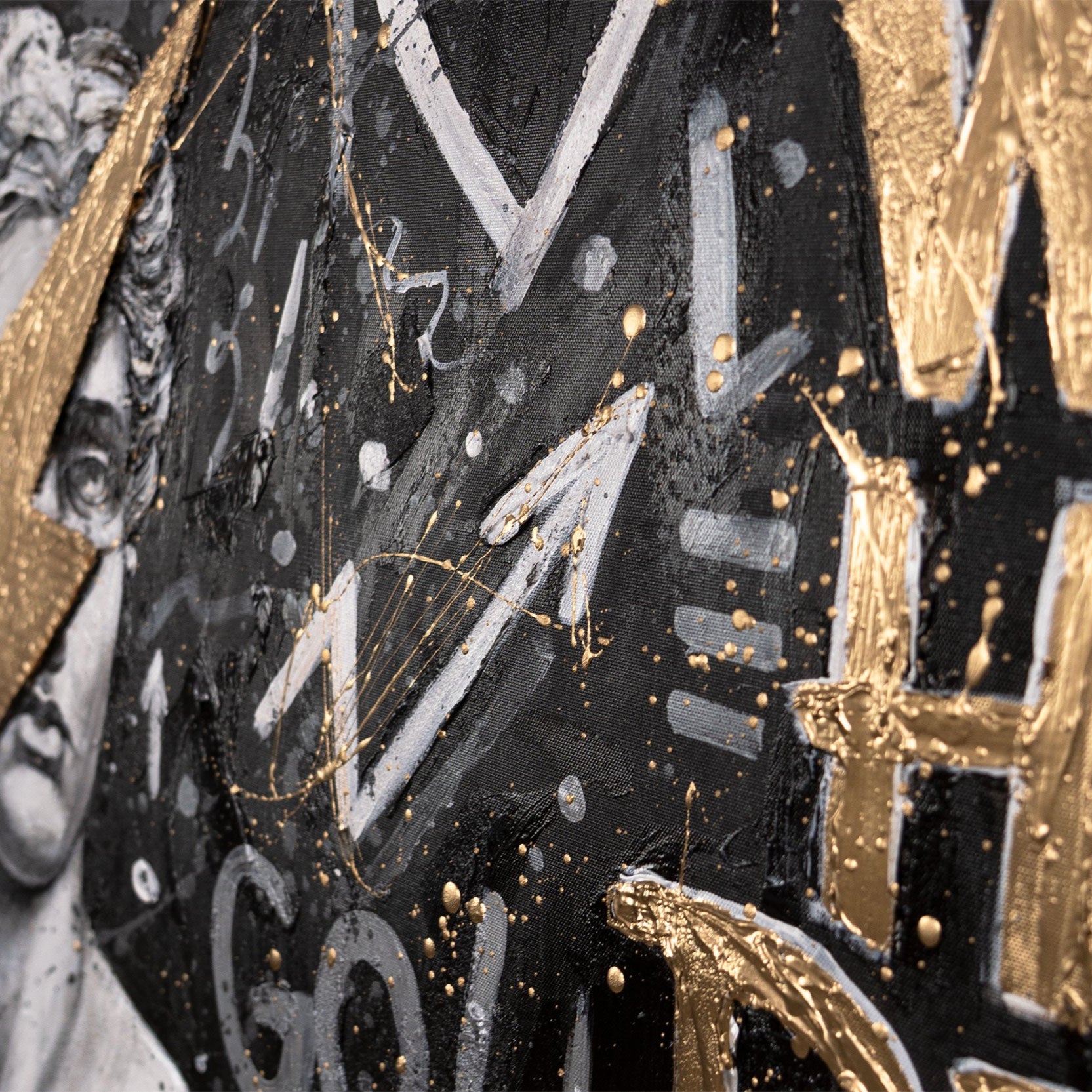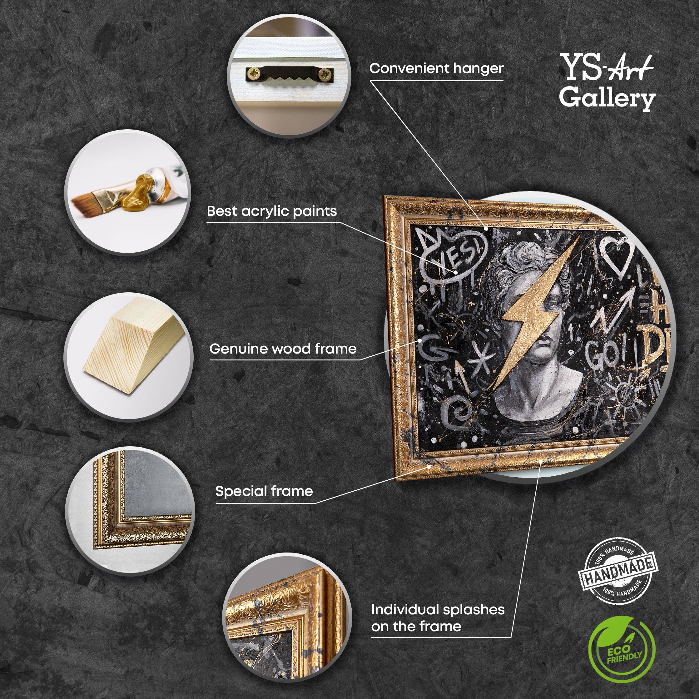Dette håndmalede lærredsbillede „Kunst af Motivation“ kombinerer urban street art med en inspirerende besked: Work Hard, Dream Big. Det gyldne lyn, der rammer den antikke bust, omgives af udtryksfulde symboler som hjerter, pile og stjerner. Hvert penselstrøg er unikt – en fusion mellem klassisk skulptur og moderne motivkunst.