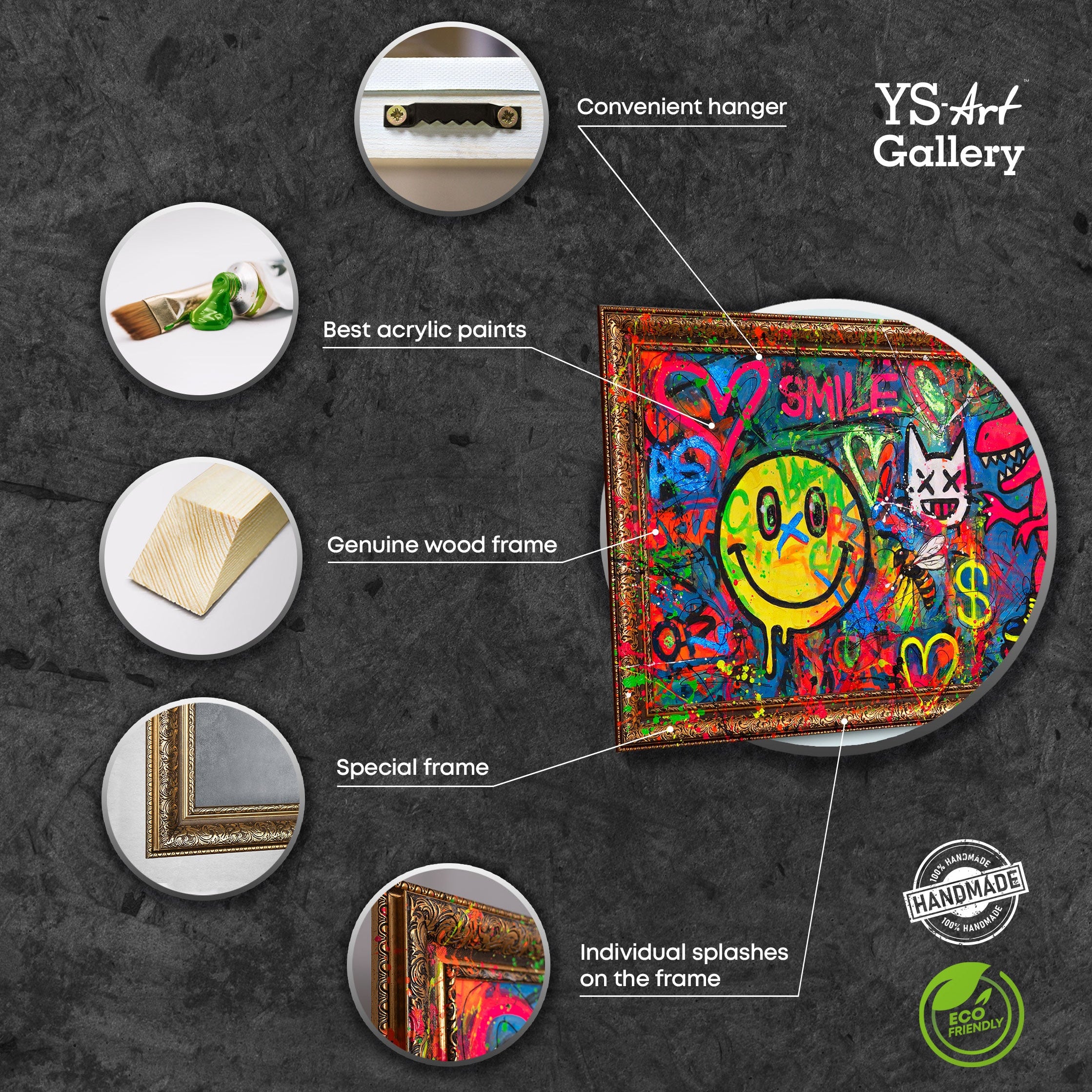 Perfekt til dig, der elsker moderne vægdekoration i stuen, iøjnefaldende street art på lærred eller graffiti-kunst. Hvert værk er 100 % håndmalet, med guldbelagt ramme og helt unik karakter – et ægte unikum, der forvandler dit hjem til et lille galleri.