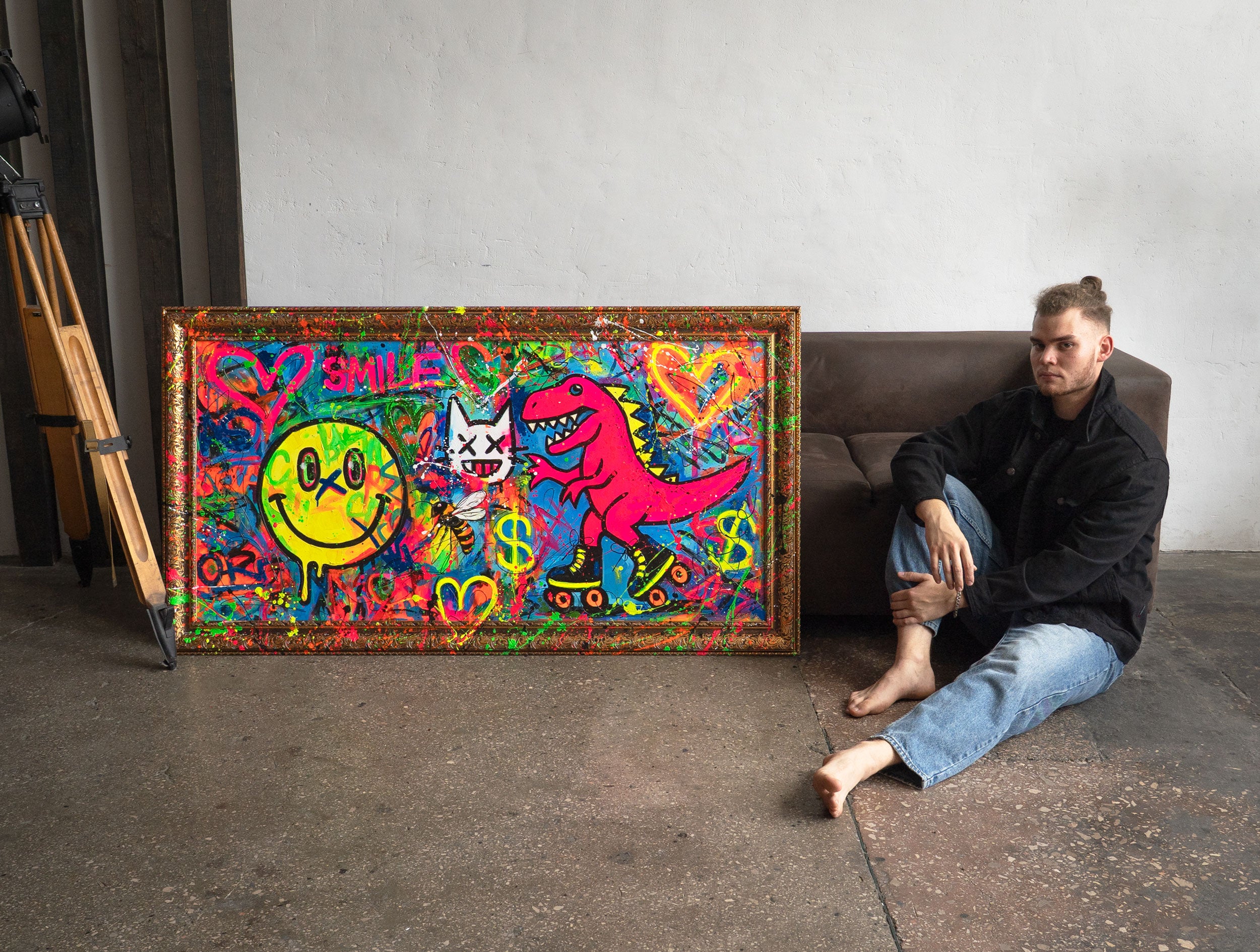 Dette graffiti Pop Art-kunstværk „Sjov“ bringer ren livsglæde ind på væggen! En pink dinosaur på rulleskøjter, smiley, kat og farverige hjerter – i stærke neonfarver, malet og sprøjtet med energi. Hvert eneste detalje udstråler frihed, glæde og urban livsstil.