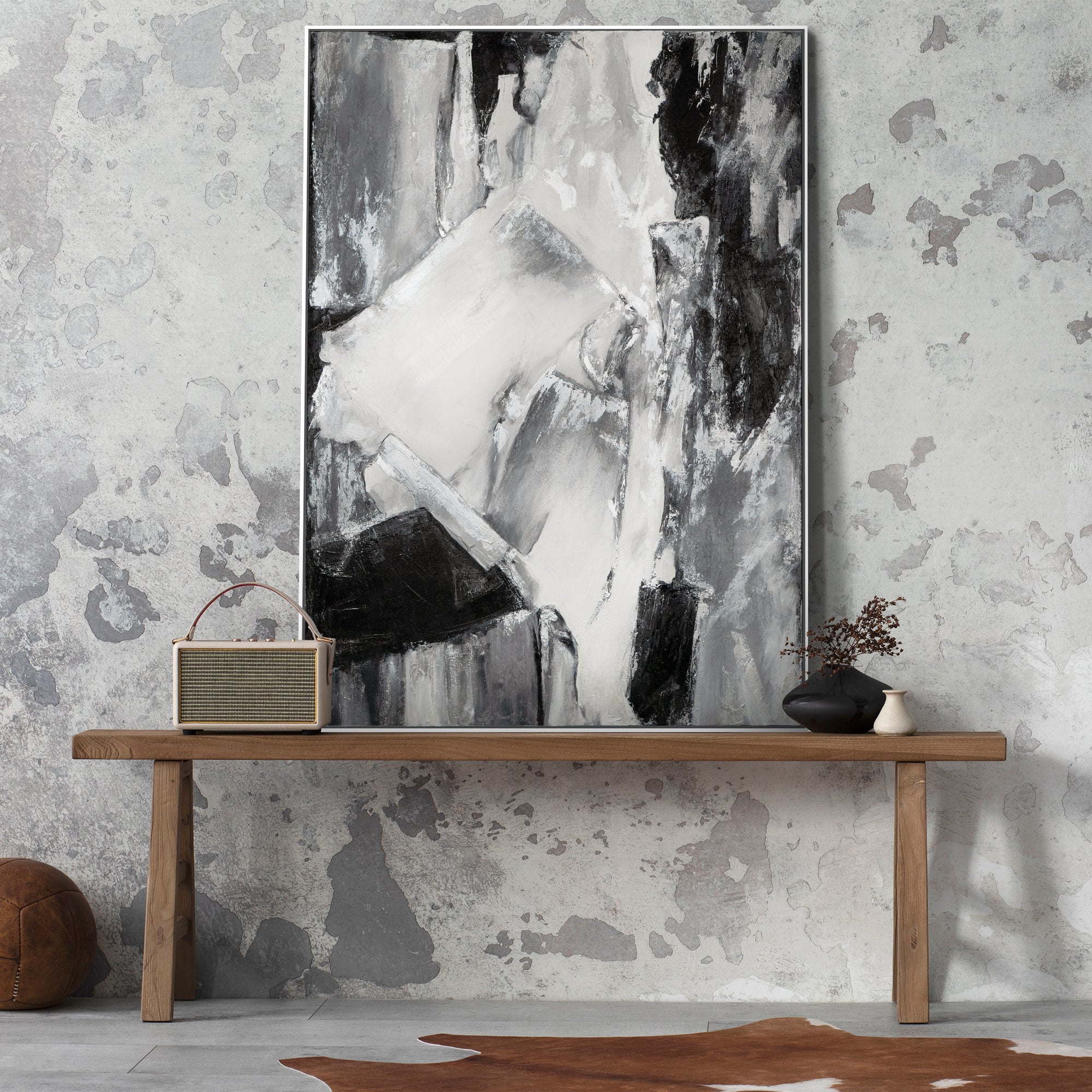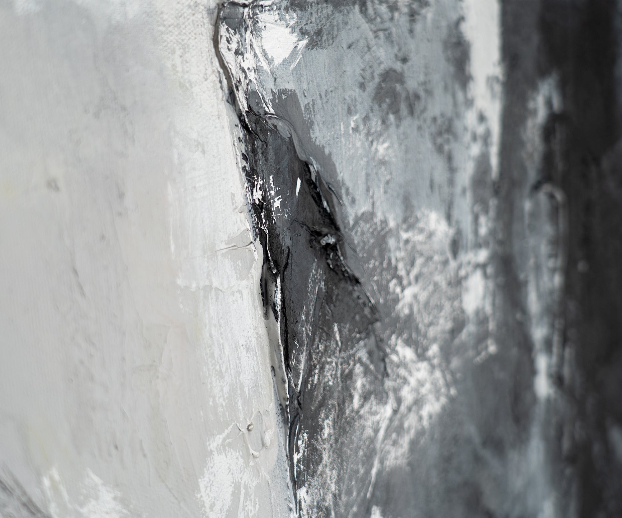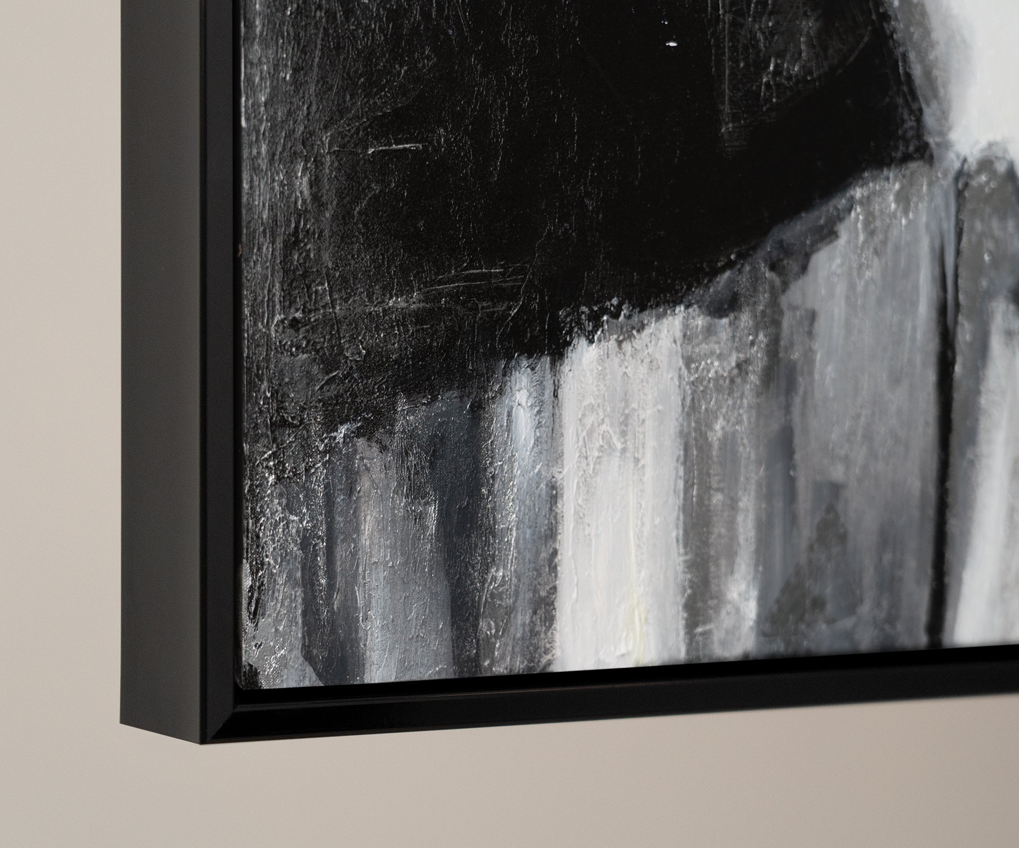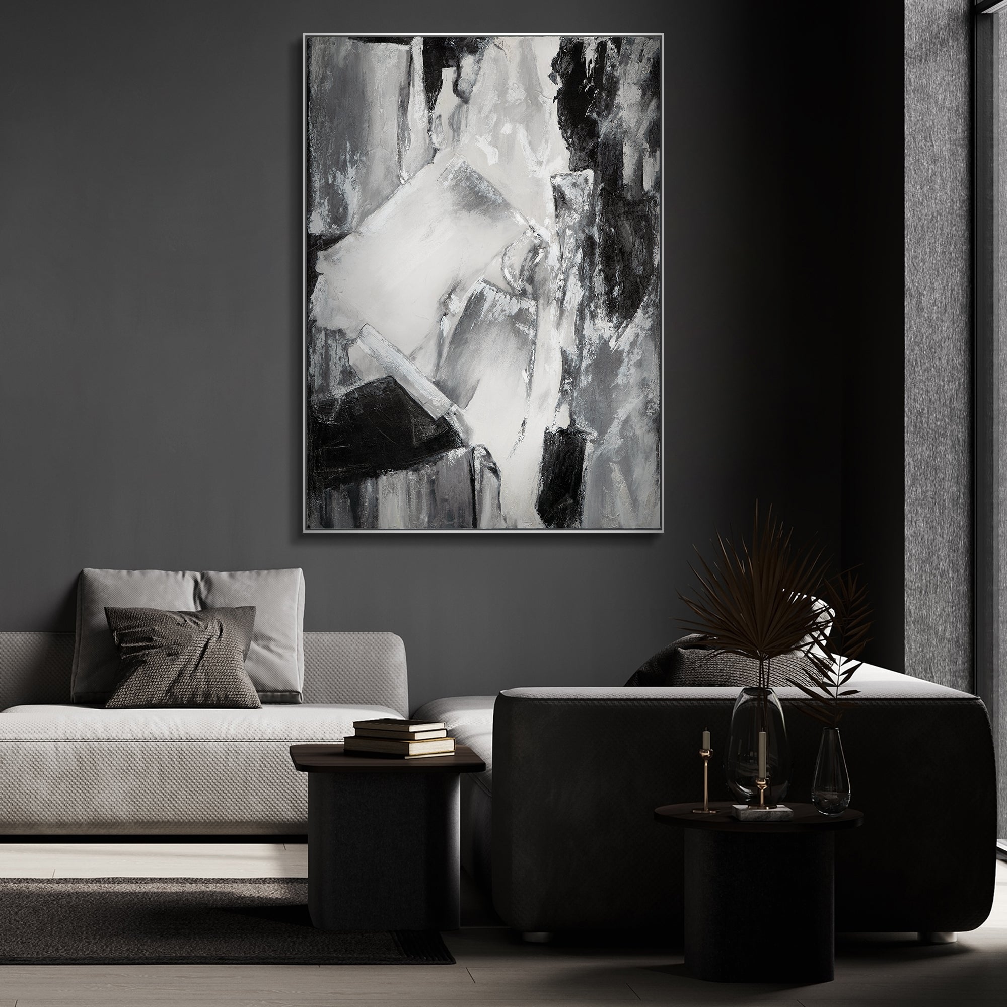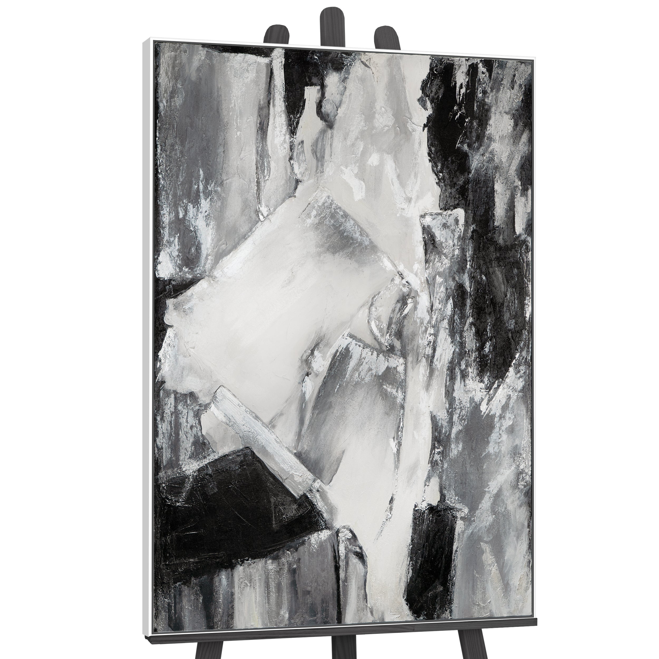 Berig dit hjem eller kontor med dette håndmalede, abstrakte kunstværk, der fremhæver en dramatisk komposition i sorte, hvide og grå toner. Billedet imponerer med stærke kontraster og markante penselstrøg. Det er 100 % håndmalet og indrammet i en moderne sort ramme.