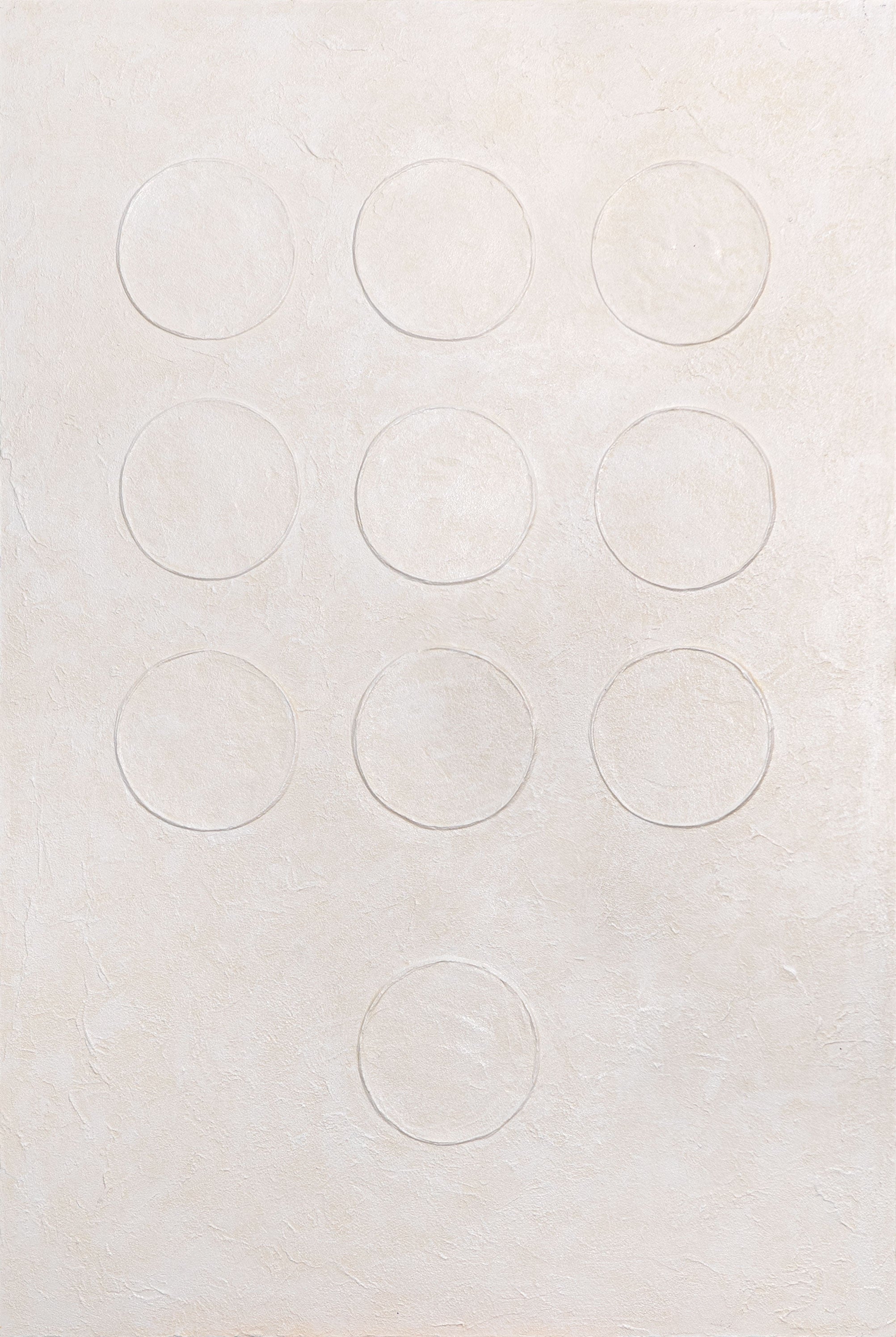 "Hvid kode" udtrykker essensen af moderne struktureret acrylmaleri. Ni cirkulære former træder blidt frem fra overfladen og skaber en perfekt balance mellem orden og bevægelse. De sarte creme- og hvide nuancer giver værket en ren og minimalistisk elegance, der passer ideelt til rolige, moderne interiører.
