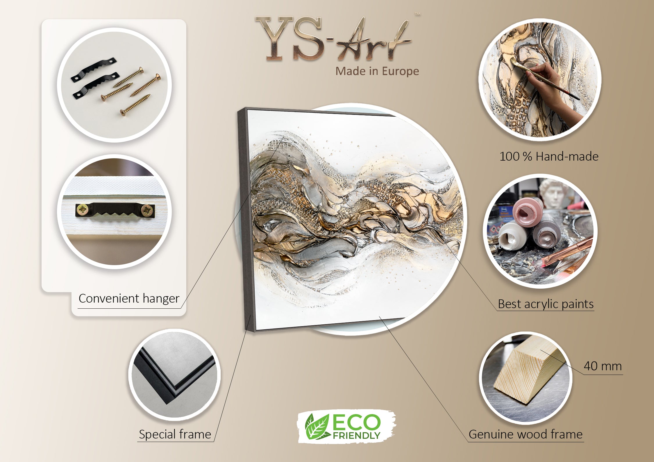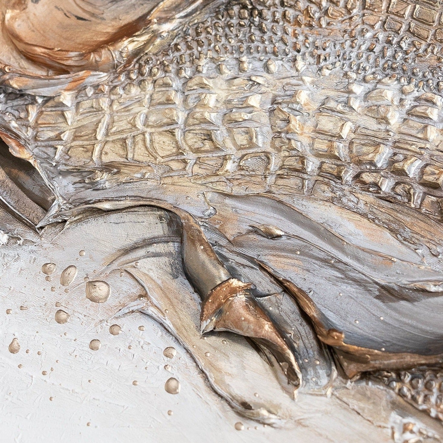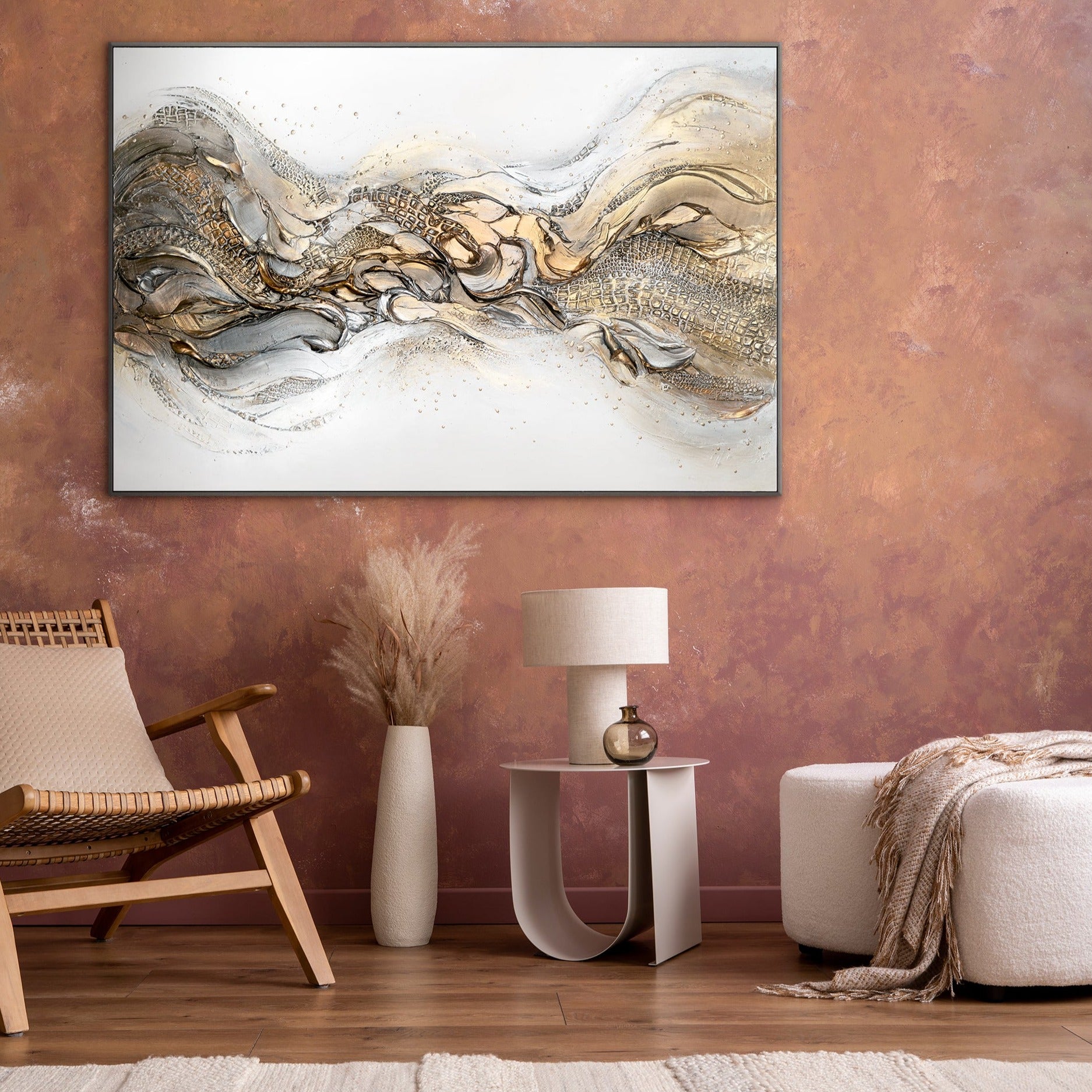 Atmosfæren i dette håndmalede maleri på lærred er fascinerende. Forskellige teksturer, bladguld og en tynd ramme tilføjer luksus og elegance. Dette kunstværk vil se fantastisk ud i både stue, soveværelse eller arbejdsværelse.