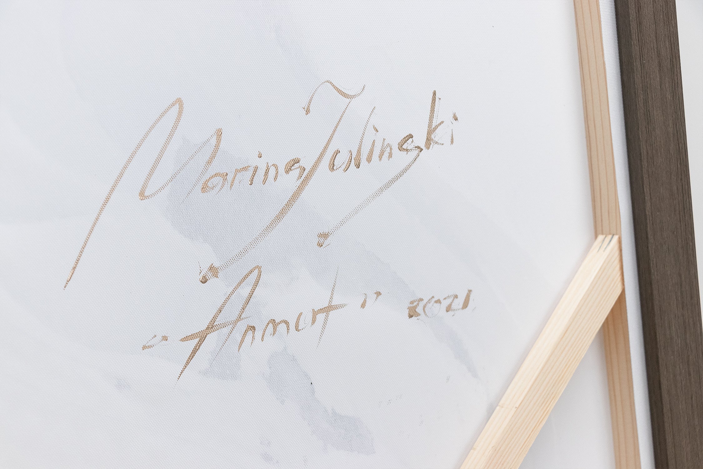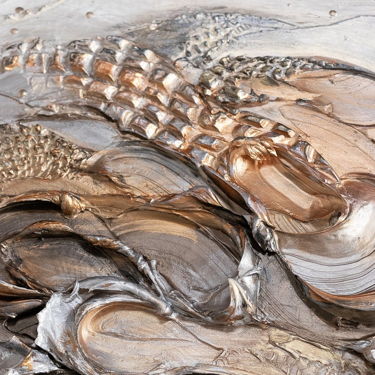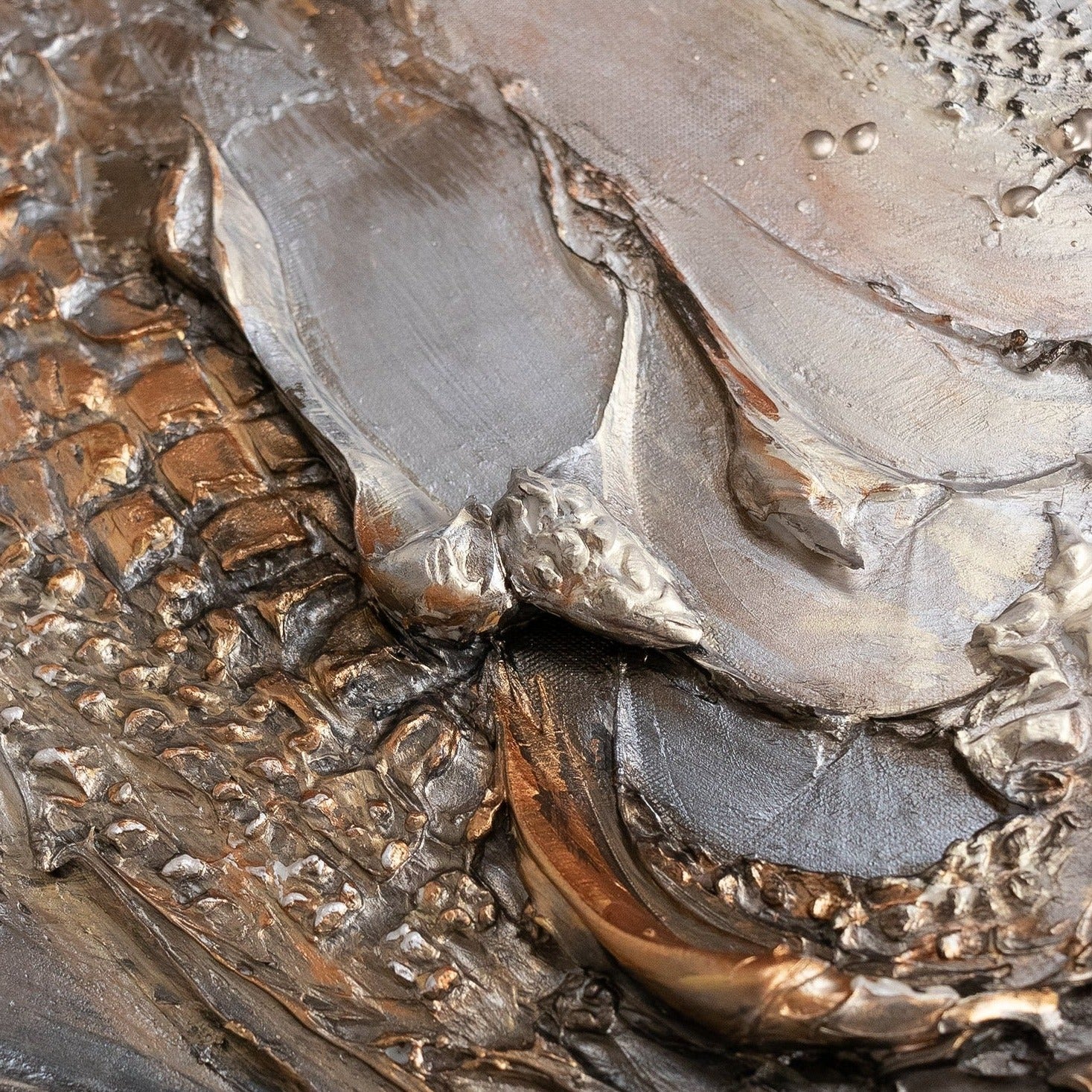 Atmosfæren i dette håndmalede maleri på lærred er fascinerende. Forskellige teksturer, bladguld og en tynd ramme tilføjer luksus og elegance. Dette kunstværk vil se fantastisk ud i både stue, soveværelse eller arbejdsværelse.