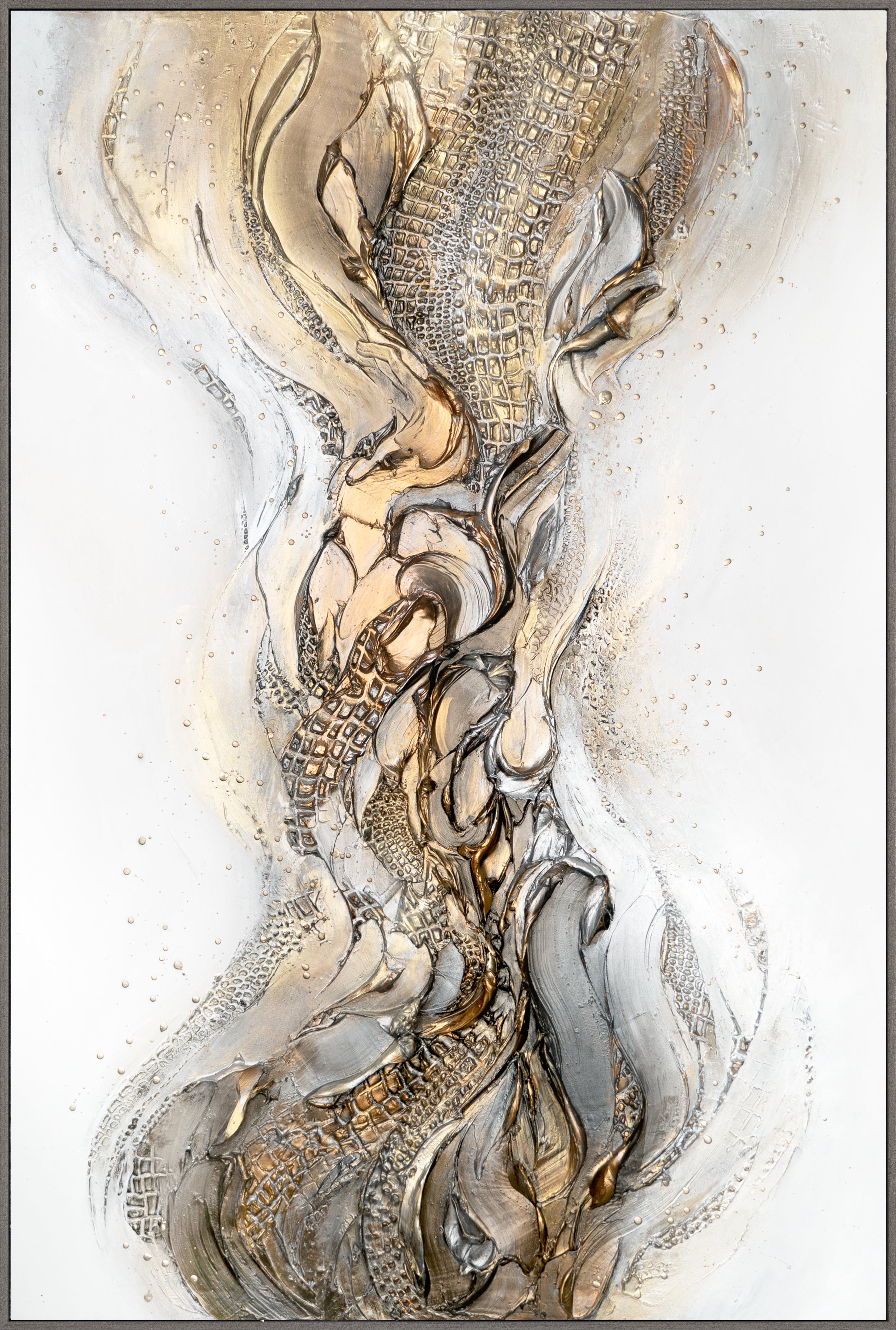 Atmosfæren i abstraktionen i dette akrylmaleri på lærred er fascinerende. Forskellige teksturer, bladguld og en tynd ramme giver luksus og elegance. Dette kunstværk vil se fantastisk ud i både stuen, soveværelset og arbejdsværelset.