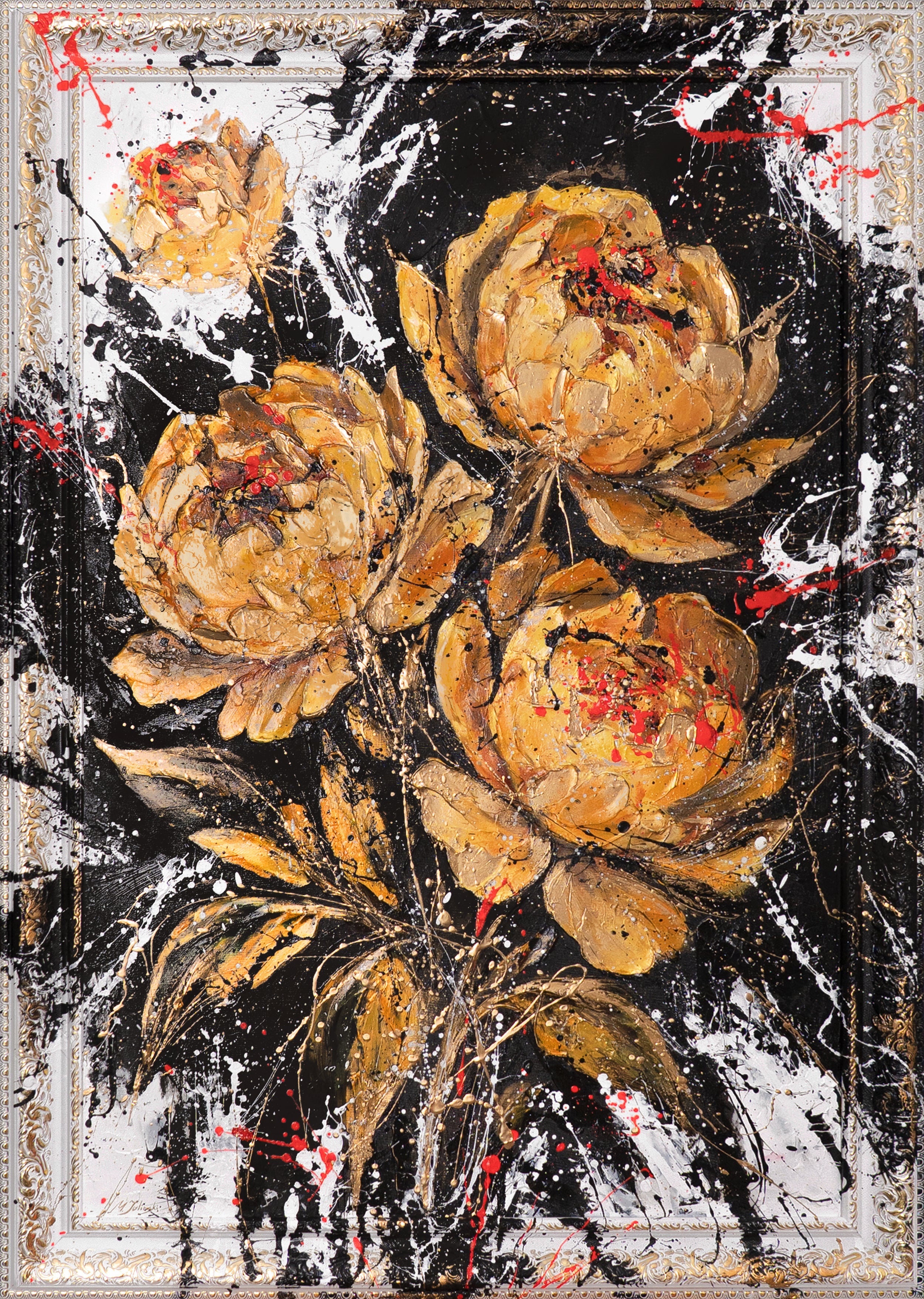 Håndmalet akrylbillede med guldblomster – Vægkunst dekoration „Fløjlsagtig Glans“