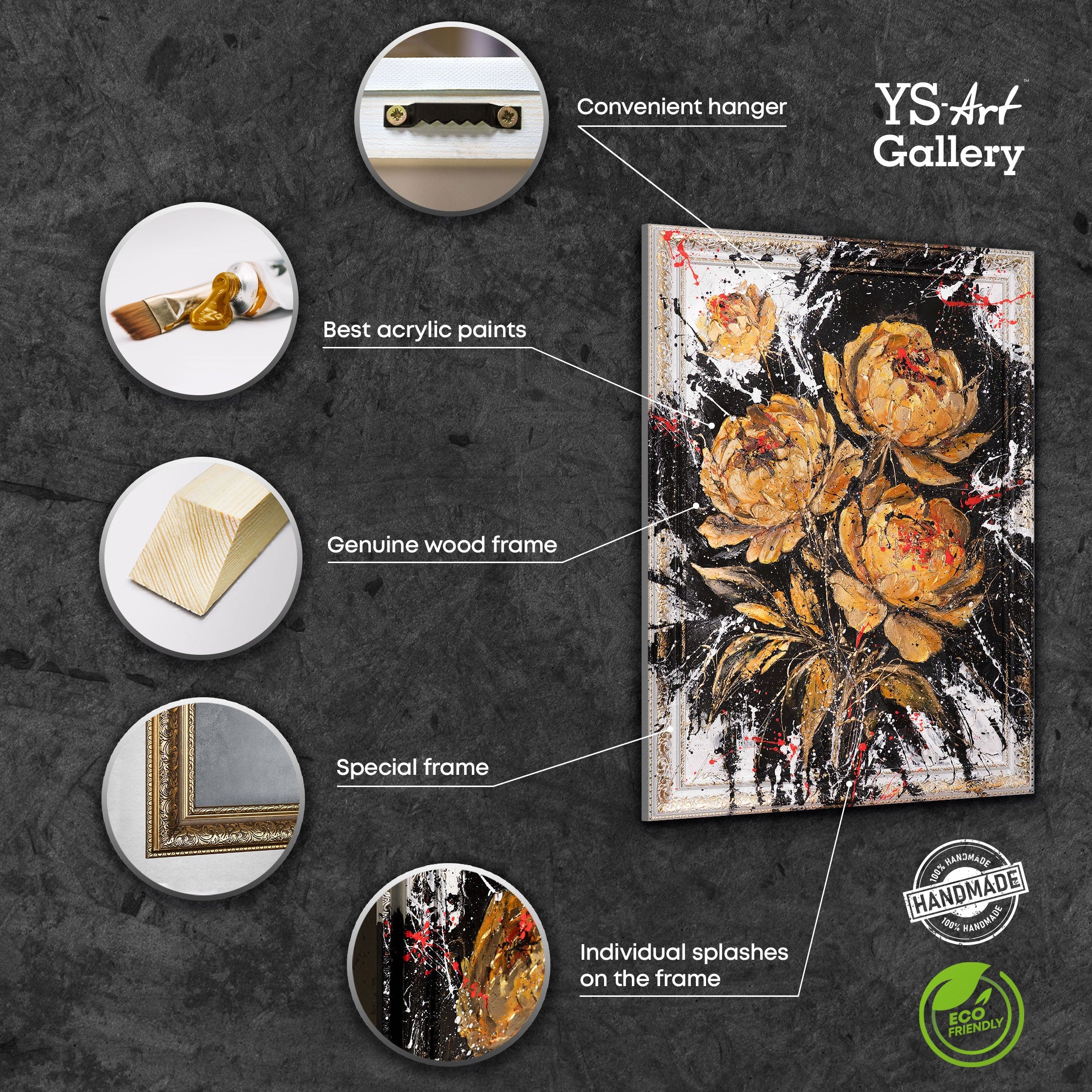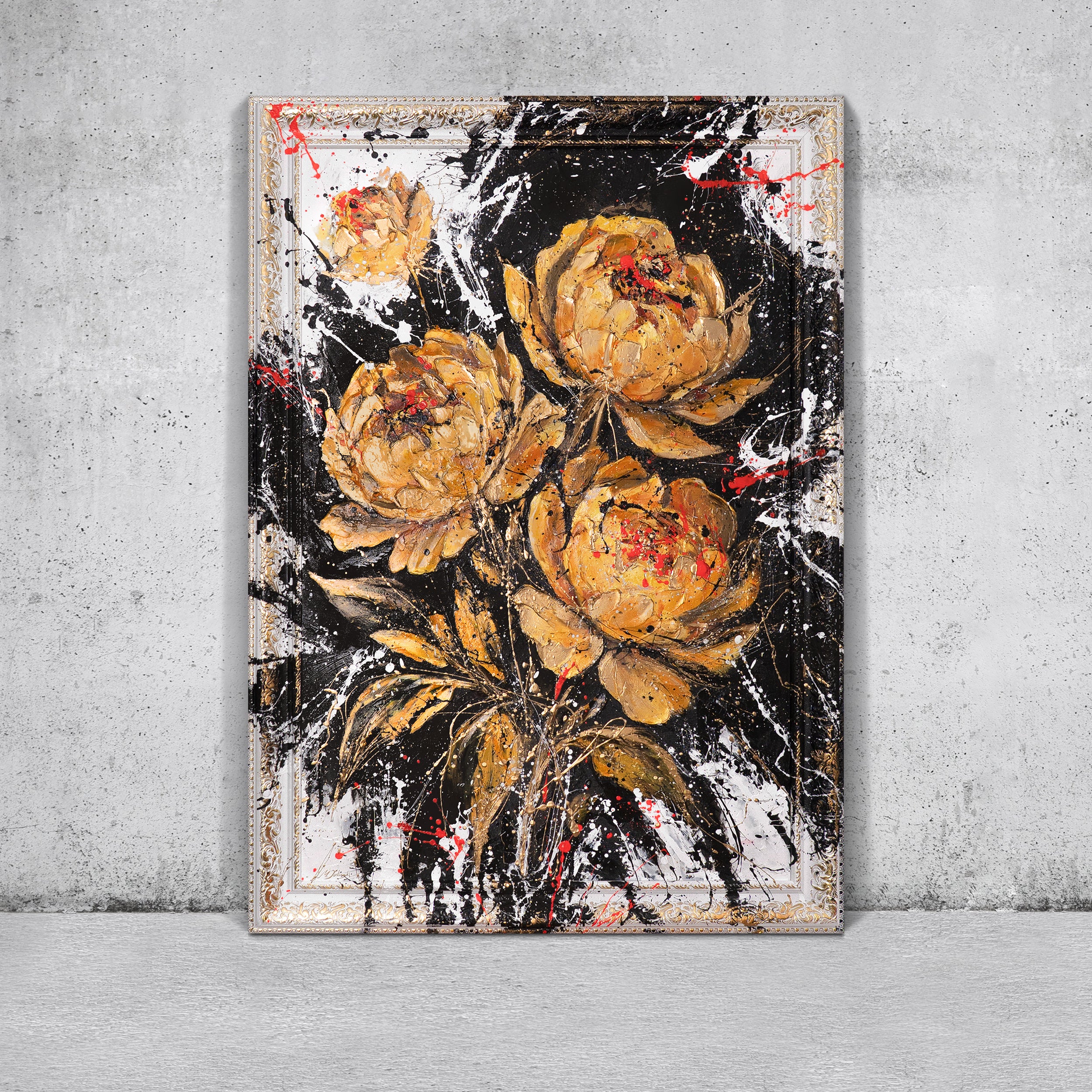 • Håndmalet akrylbillede med guldblomster – Vægkunst dekoration „Fløjlsagtig Glans“