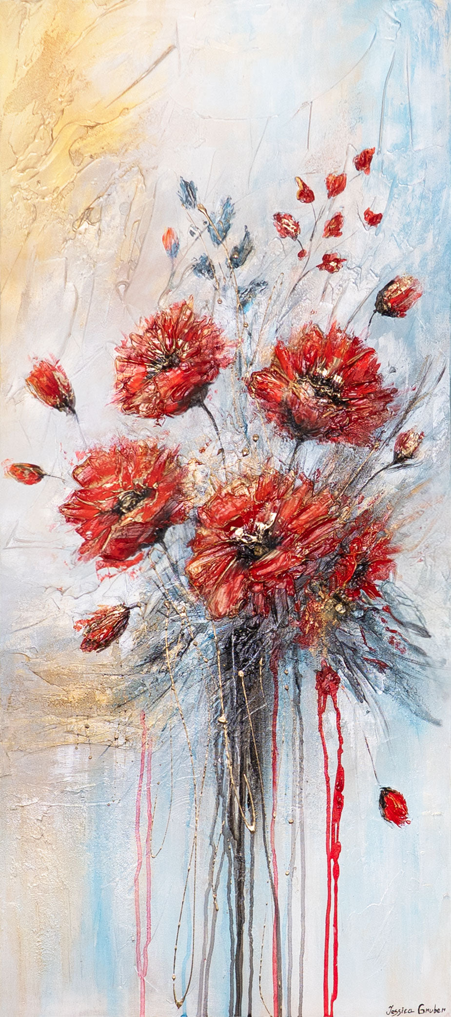 Abstrakt blomsterbillede med valmuer på lærred "Røde Mohnblumen" imponerer med levende farver og struktureret maleteknik. De røde valmueblomster står i kontrast til en lys baggrund i blide beige, grå og blå nuancer. Gyldne accenter fremhæver udtrykket og tilfører værket en elegant varme.