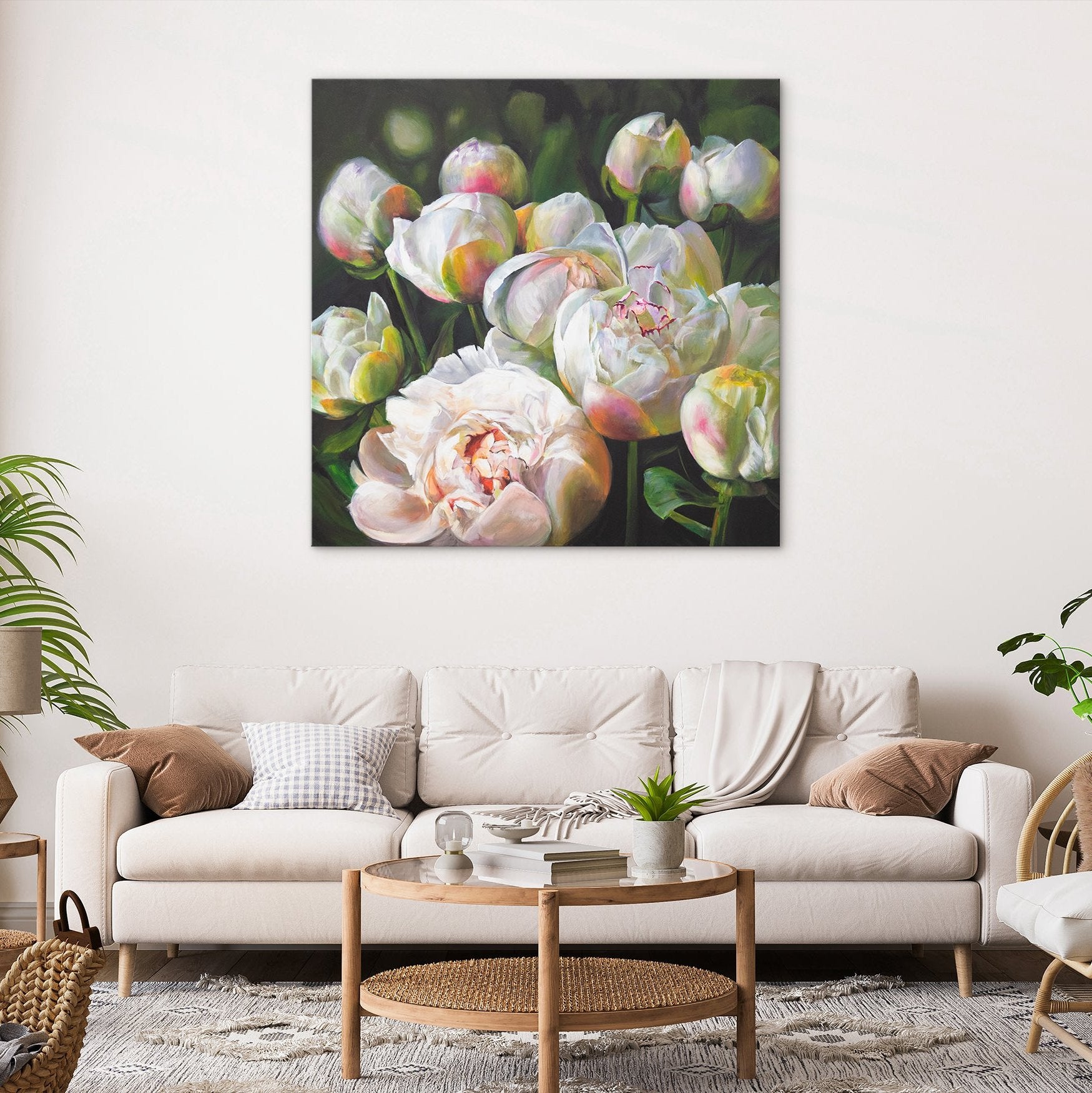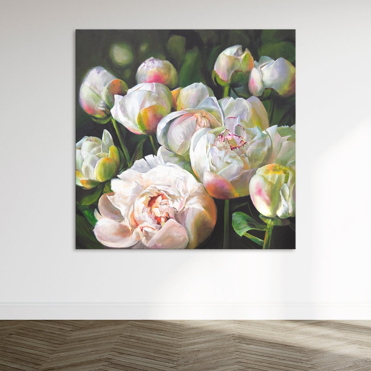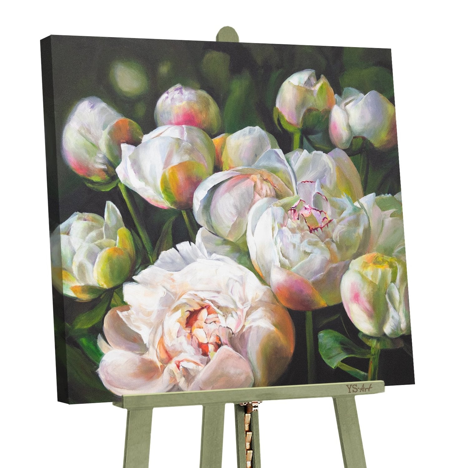 Dette udsøgte håndmalede blomsterbillede viser smukke pæoner i fuldt flor. Akrylmaleriet fremhæver de sarte detaljer og de levende farver i blomsterne på en imponerende måde. De omhyggeligt udformede kronblade og det dybe grønne i bladene skaber et harmonisk og beroligende kunstværk, der løfter enhver indretning.