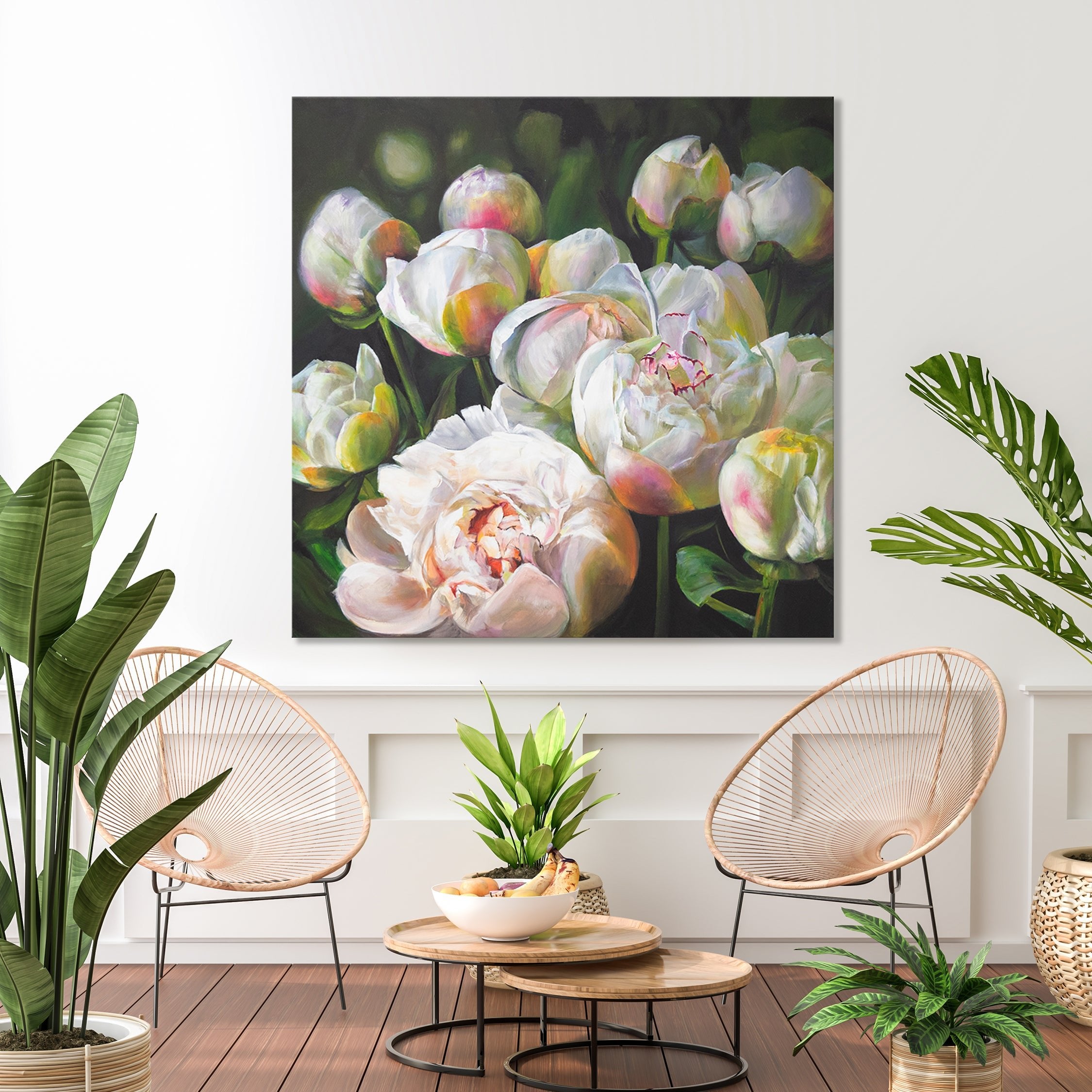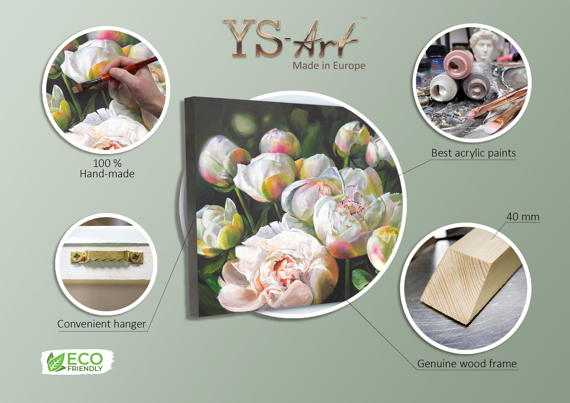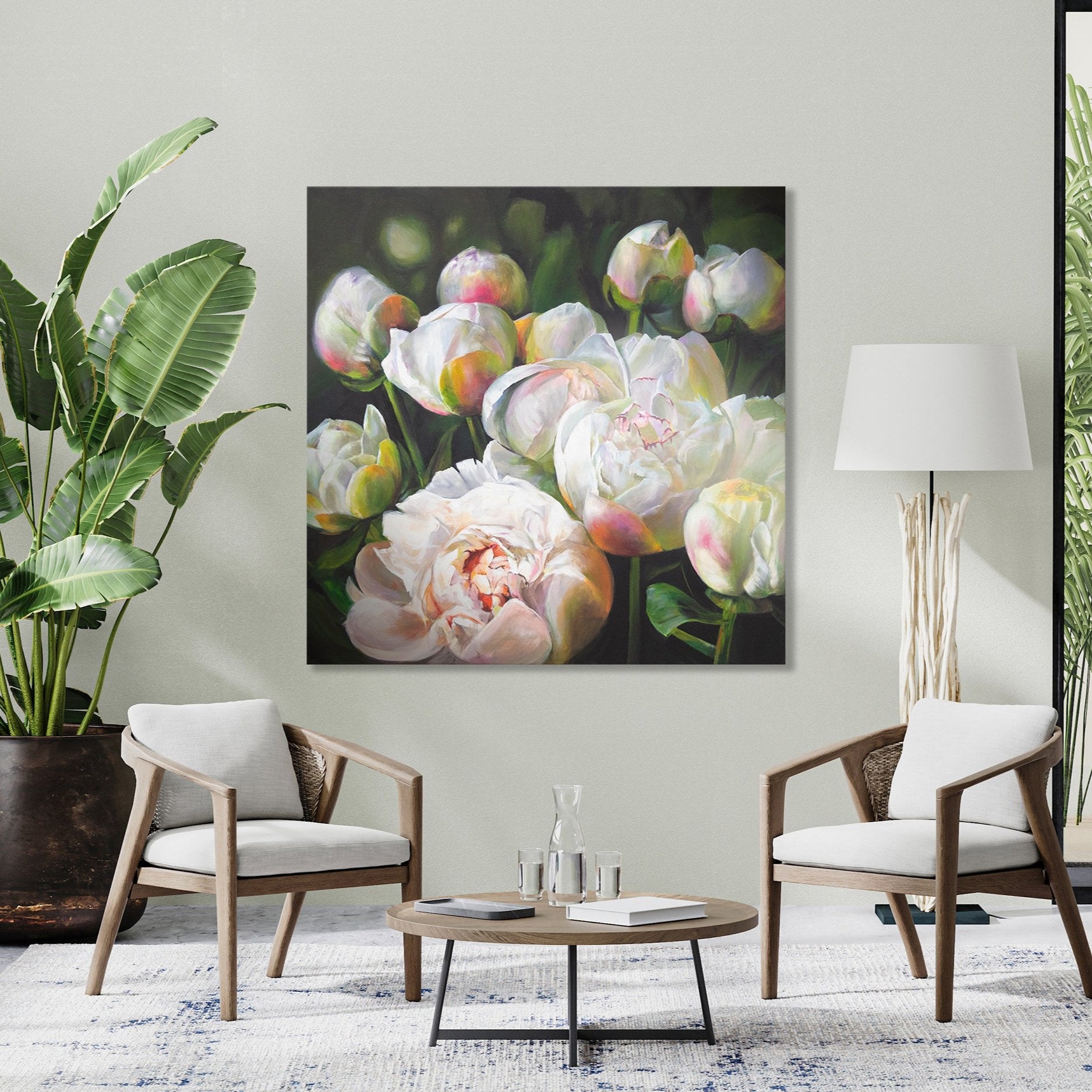 Dette udsøgte håndmalede blomsterbillede viser smukke pæoner i fuldt flor. Akrylmaleriet fremhæver de sarte detaljer og de levende farver i blomsterne på en imponerende måde. De omhyggeligt udformede kronblade og det dybe grønne i bladene skaber et harmonisk og beroligende kunstværk, der løfter enhver indretning.