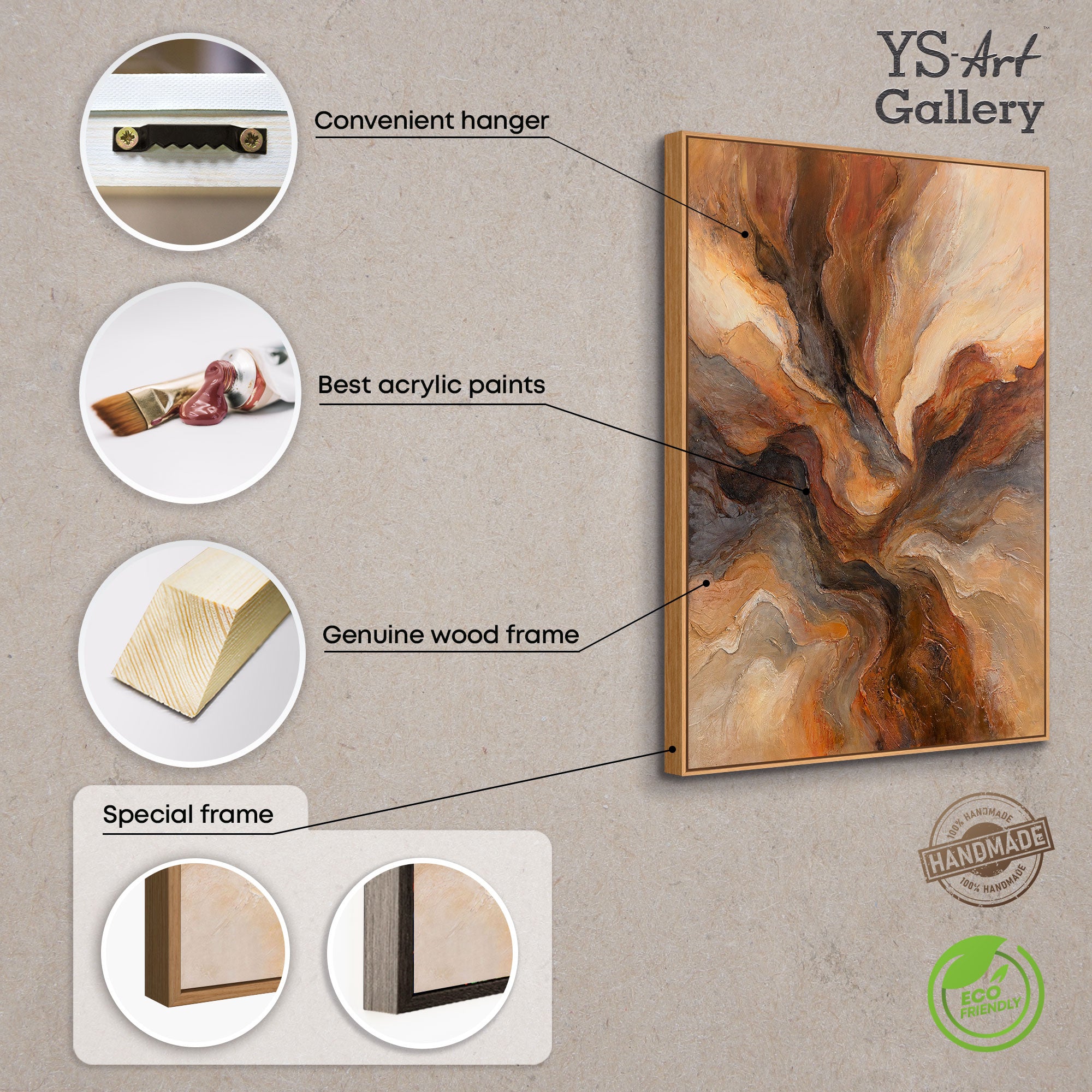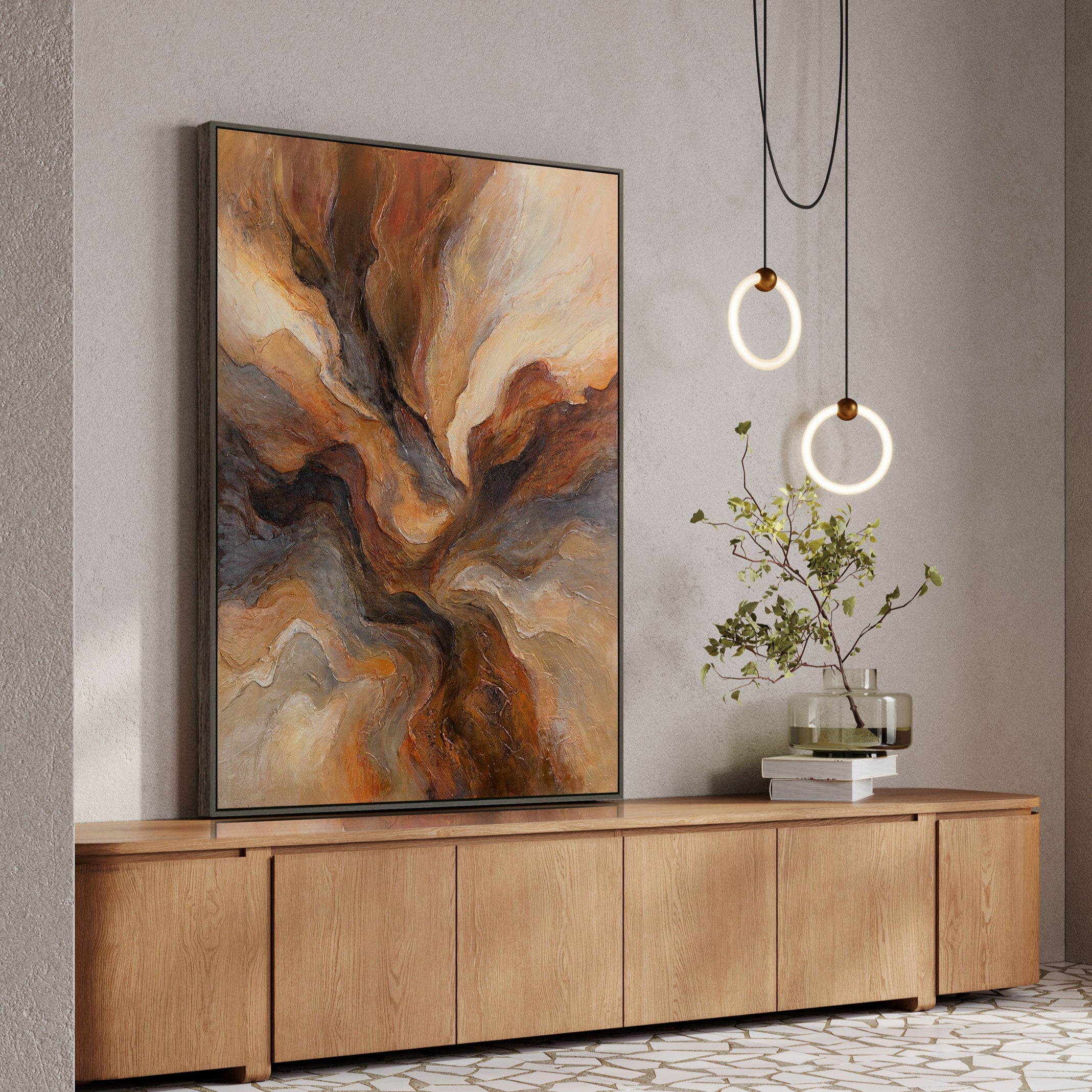 "Evighedens lyn" er et håndmalet akrylmaleri, der imponerer med sine jordnære nuancer og levende strukturer. Varme brun-, rød- og beigefarver smelter sammen i dynamiske bevægelser, der fremkalder intens energi og kraftfuld dybde. Den strukturerede overflade giver værket en plastisk dimension og en særlig udtrykskraft.