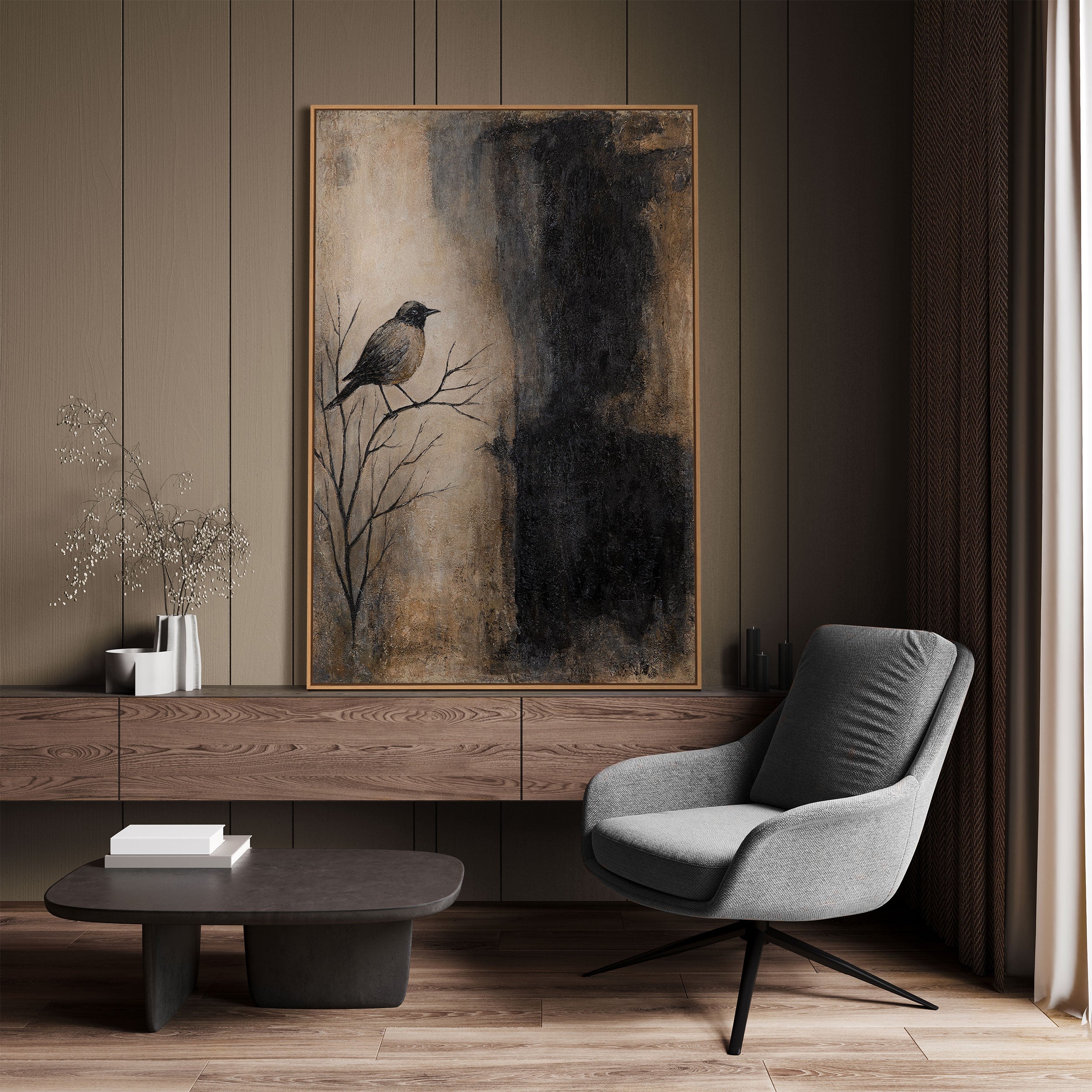 "Gren og skygge" er et håndmalet akrylmaleri, der imponerer med sit udtryksfulde naturmotiv. En ensom fugl sidder på nøgne grene, indrammet af en kontrastfuld komposition i varme beige- og brune nuancer samt dyb sort. Den strukturerede overflade giver værket dybde og en levende taktil kvalitet, der fanger øjet.
