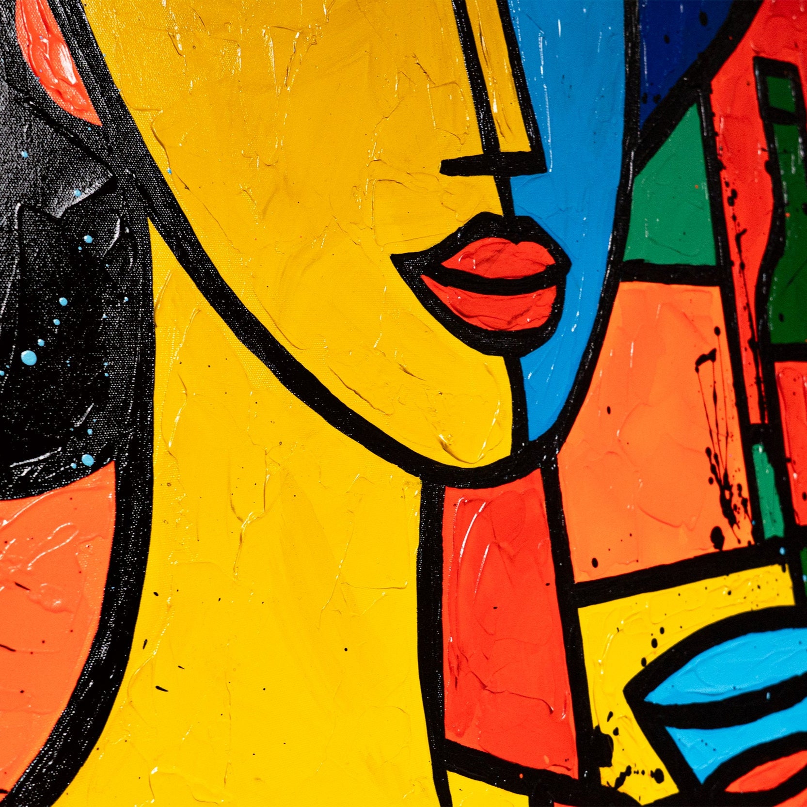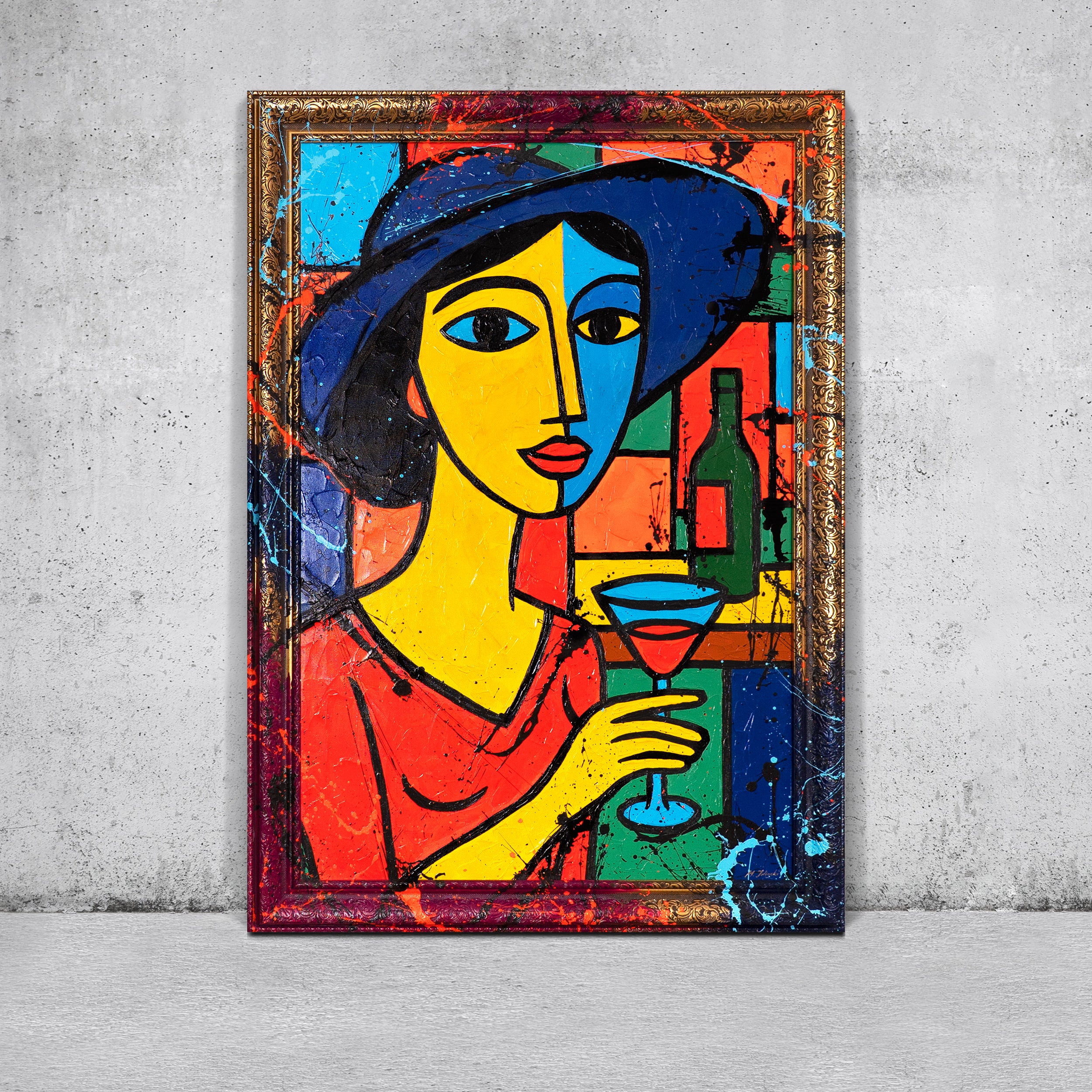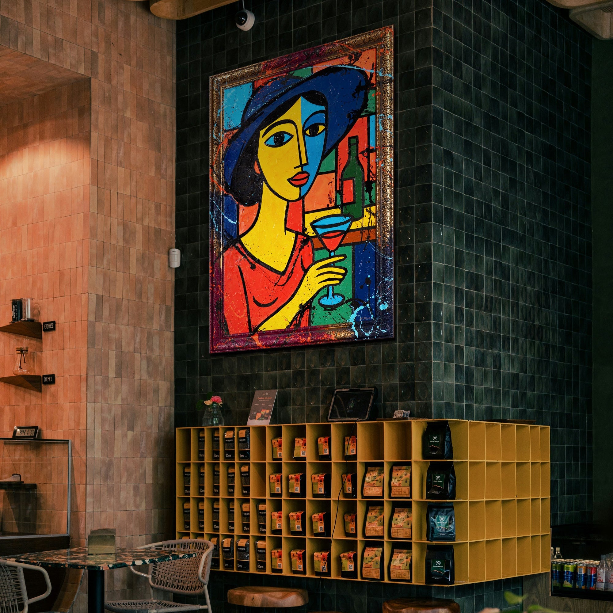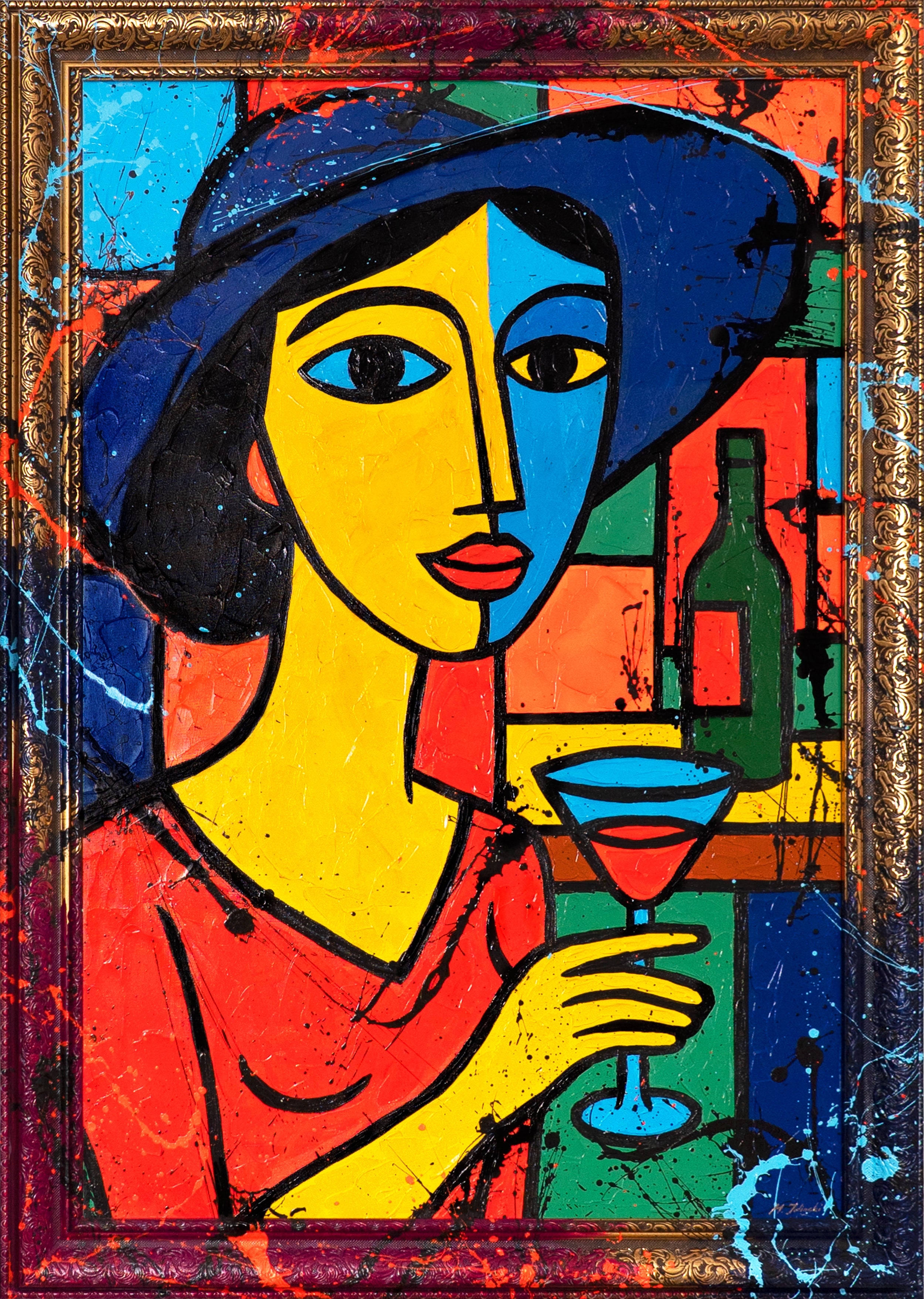 „Dame i baren“ viser en stiliseret kvinde med hat og glas i kubistisk-inspireret pop-art-stil. Klare linjer, kraftige farver og kontrastfulde former giver maleriet en unik tilstedeværelse. Baggrunden med lysende farvefelter, flaske og glas understreger det moderne udtryk.