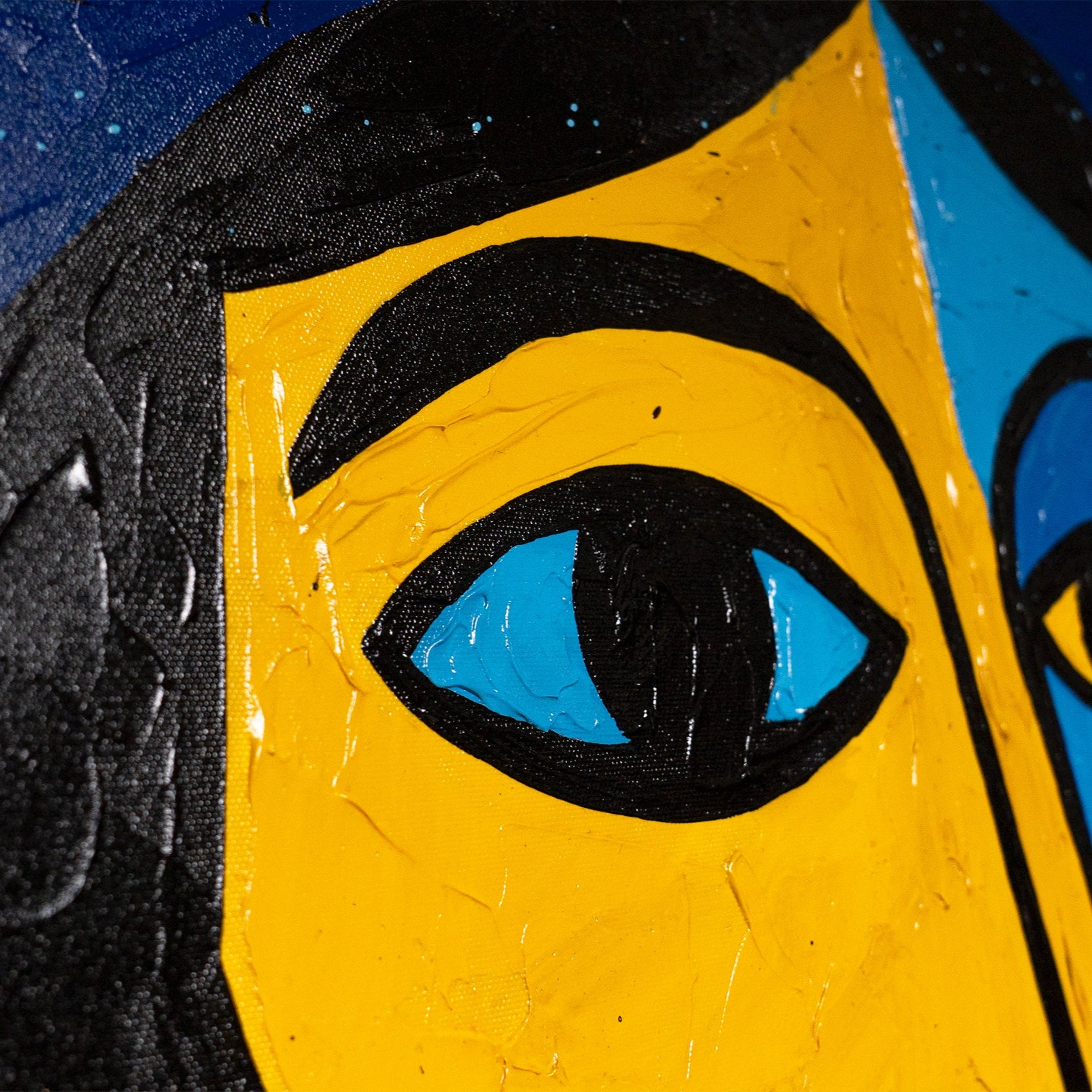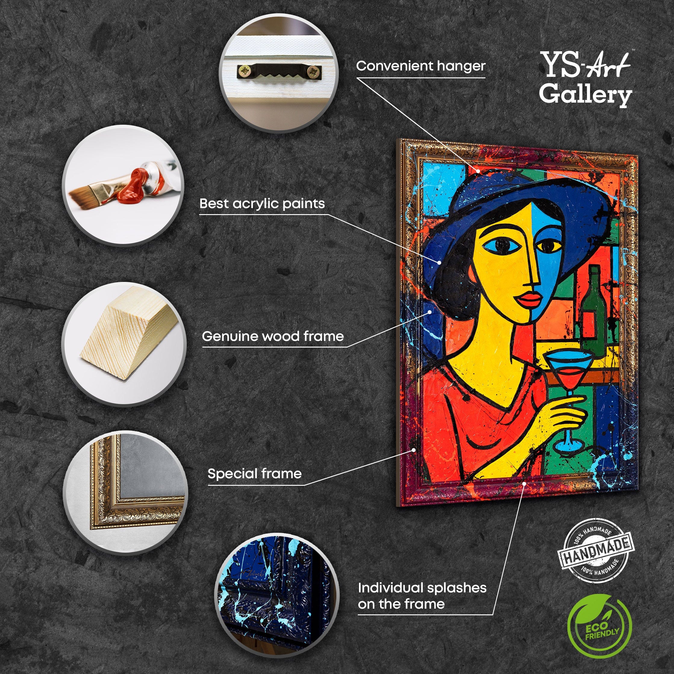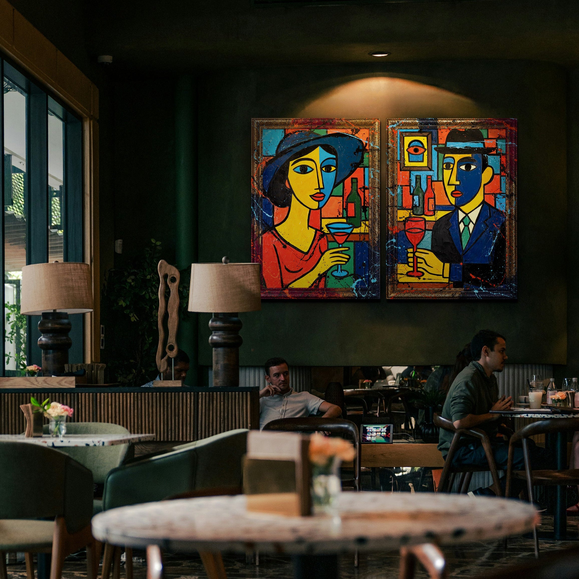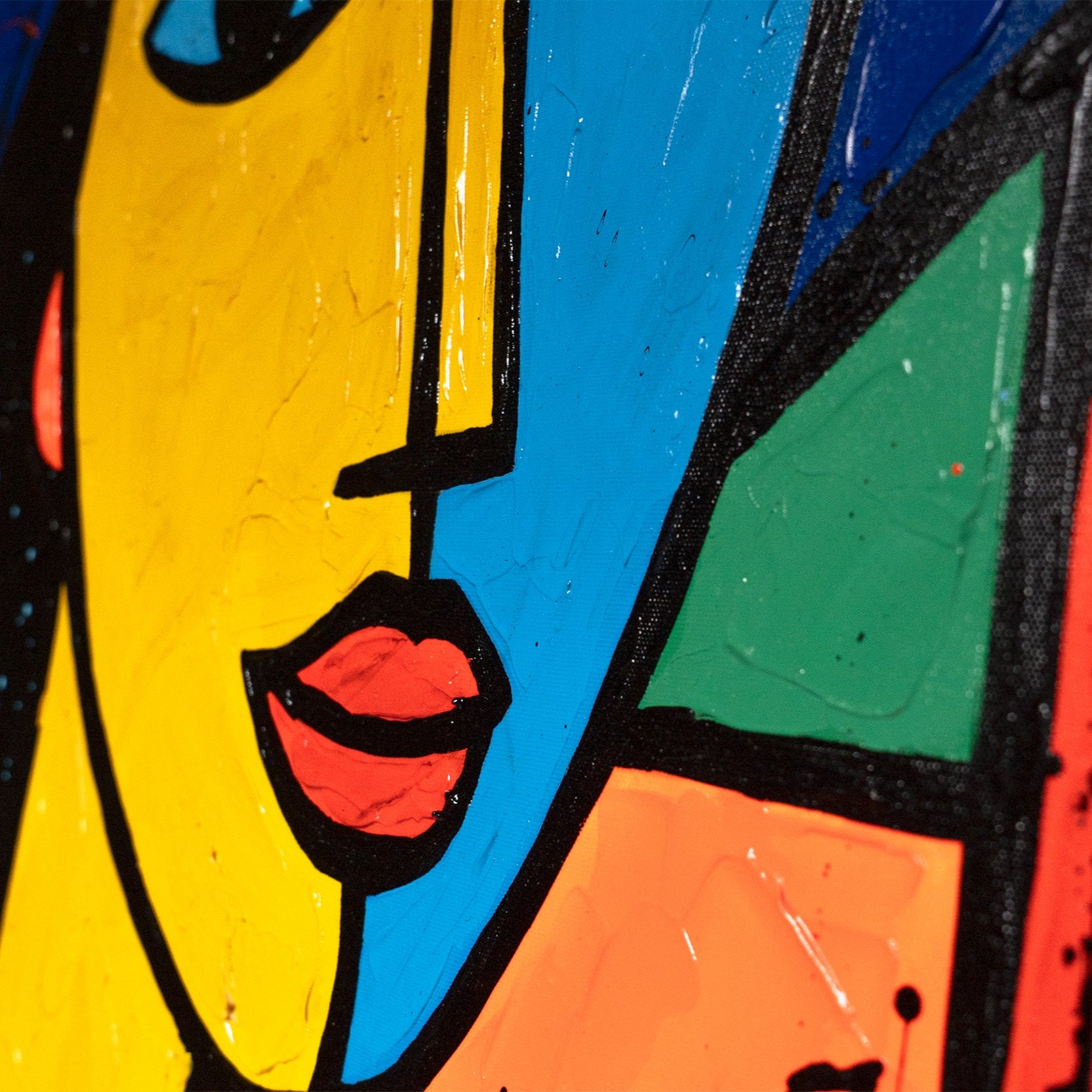 „Dame i baren“ viser en stiliseret kvinde med hat og glas i kubistisk-inspireret pop-art-stil. Klare linjer, kraftige farver og kontrastfulde former giver maleriet en unik tilstedeværelse. Baggrunden med lysende farvefelter, flaske og glas understreger det moderne udtryk.