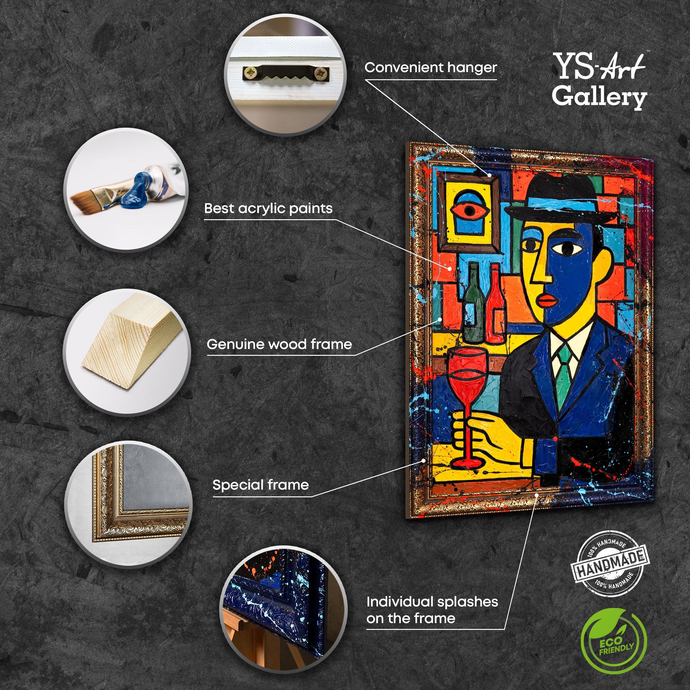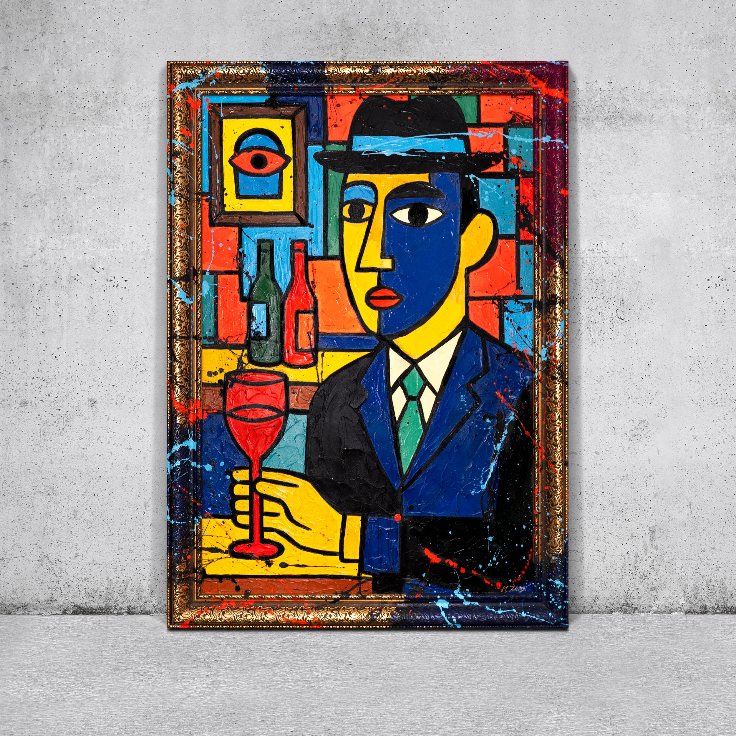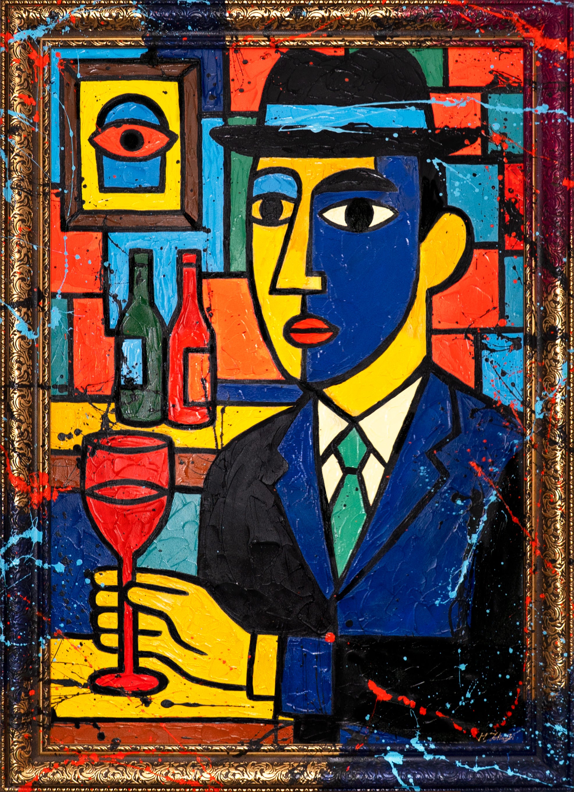 „Bar“ viser portrættet af en mand i kubistisk pop-art stil – i stærke gule, blå og orange nuancer, suppleret med grønne accenter. I hånden holder han et glas rødvin, mens flasker og et symbolsk billede med et øje i baggrunden kompletterer værket. De klare linjer og kontrastfulde farvefelter gør dette maleri til et urbant statement i moderne kunst.