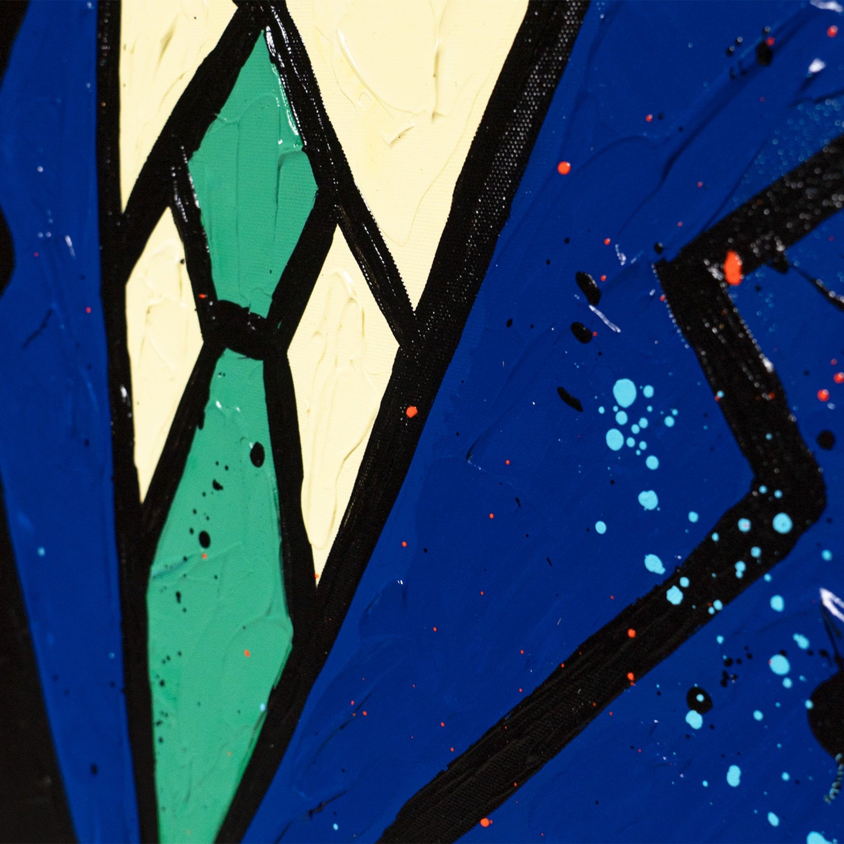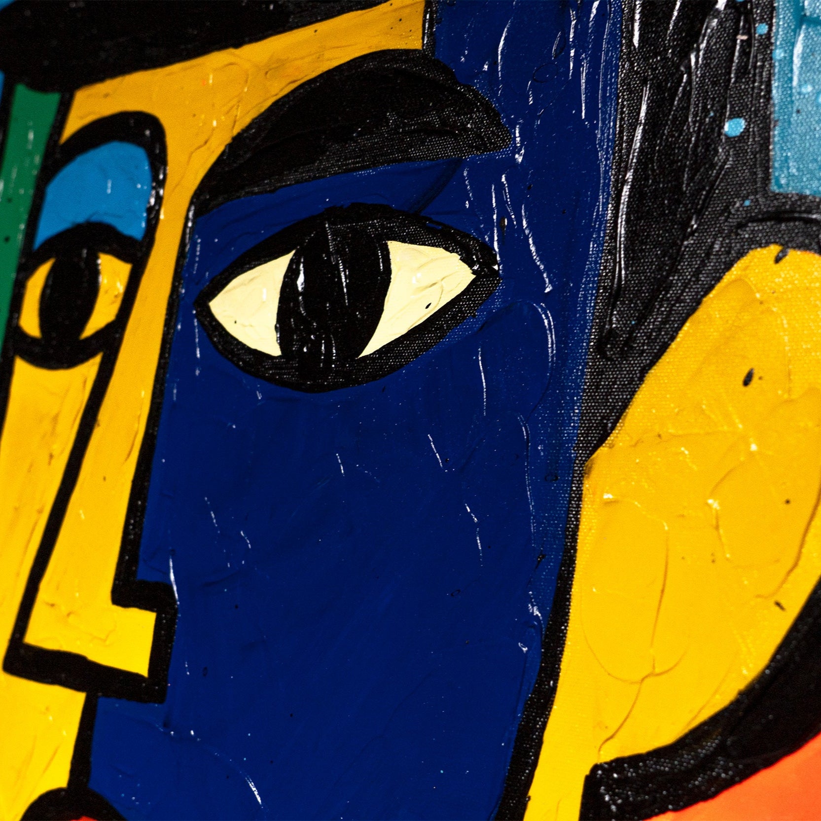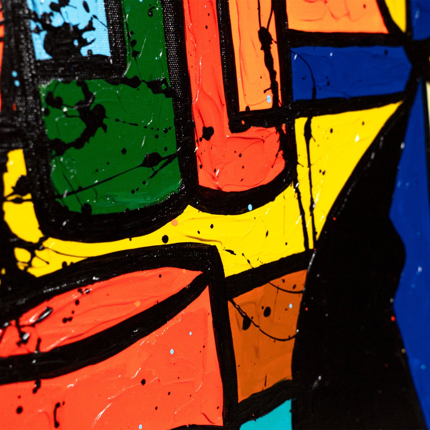 „Bar“ viser portrættet af en mand i kubistisk pop-art stil – i stærke gule, blå og orange nuancer, suppleret med grønne accenter. I hånden holder han et glas rødvin, mens flasker og et symbolsk billede med et øje i baggrunden kompletterer værket. De klare linjer og kontrastfulde farvefelter gør dette maleri til et urbant statement i moderne kunst.