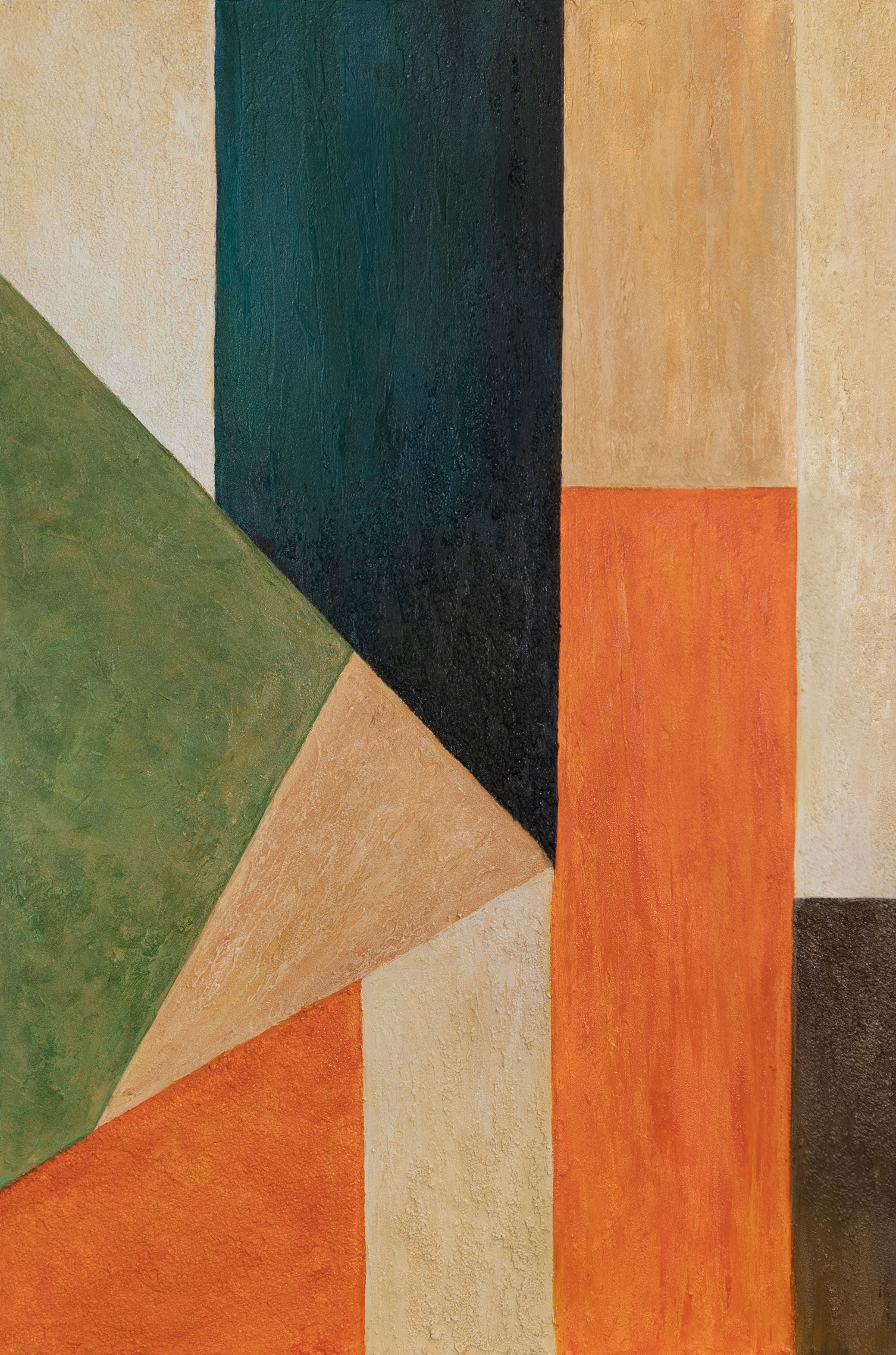 "Orden og bevægelse" forener klare linjer med livlige farveaccenter. Geometriske flader i orange, grøn, beige og sort danner et spændingsfyldt samspil mellem stabilitet og dynamik. Den strukturerede acryloverflade giver værket dybde og en taktil, kunstnerisk energi, der tilfører rummet karakter.