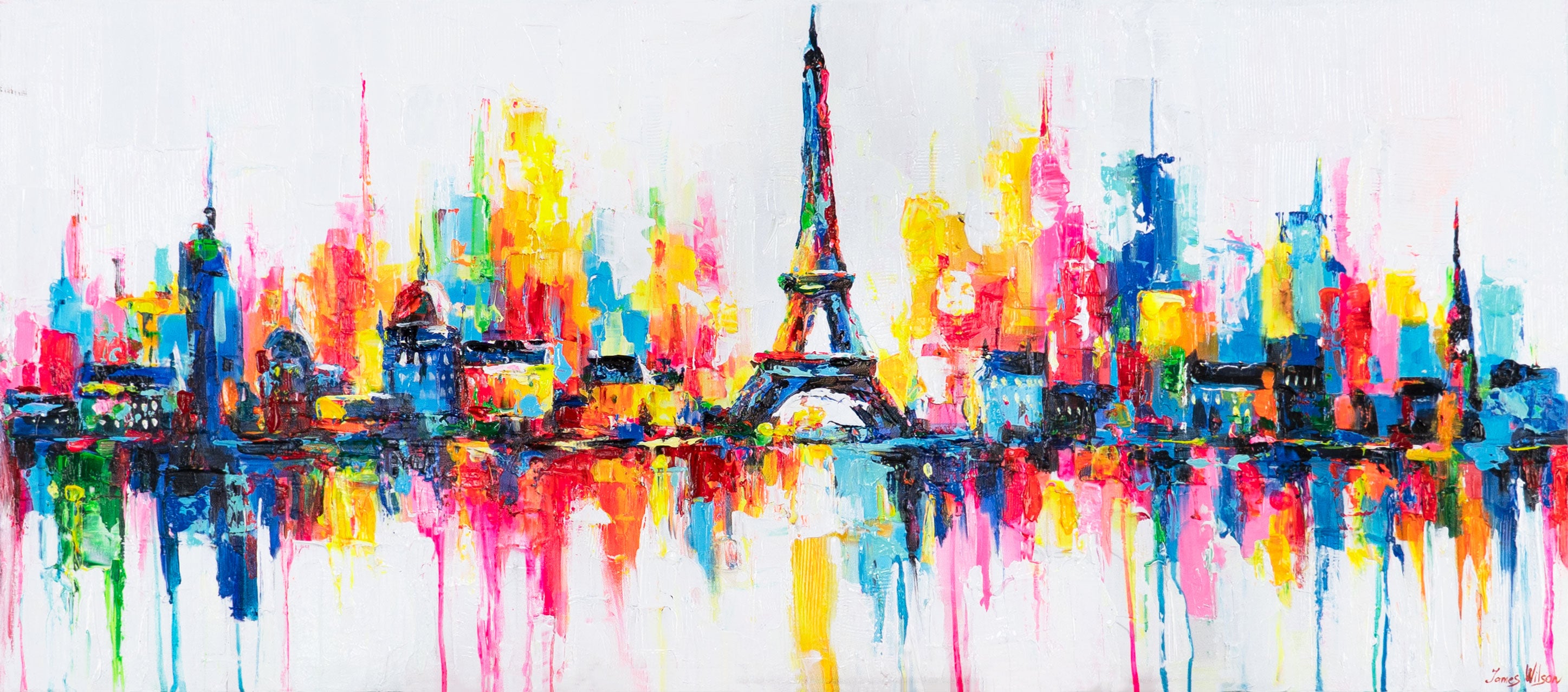 Håndmalet akrylmaleri på lærred "Inspiration fra Paris" viser en abstrakt Paris-skyline i levende pink, blå og gule toner. Expressive penselstrøg og kraftfulde farvesprøjt skaber dybde og dynamik.