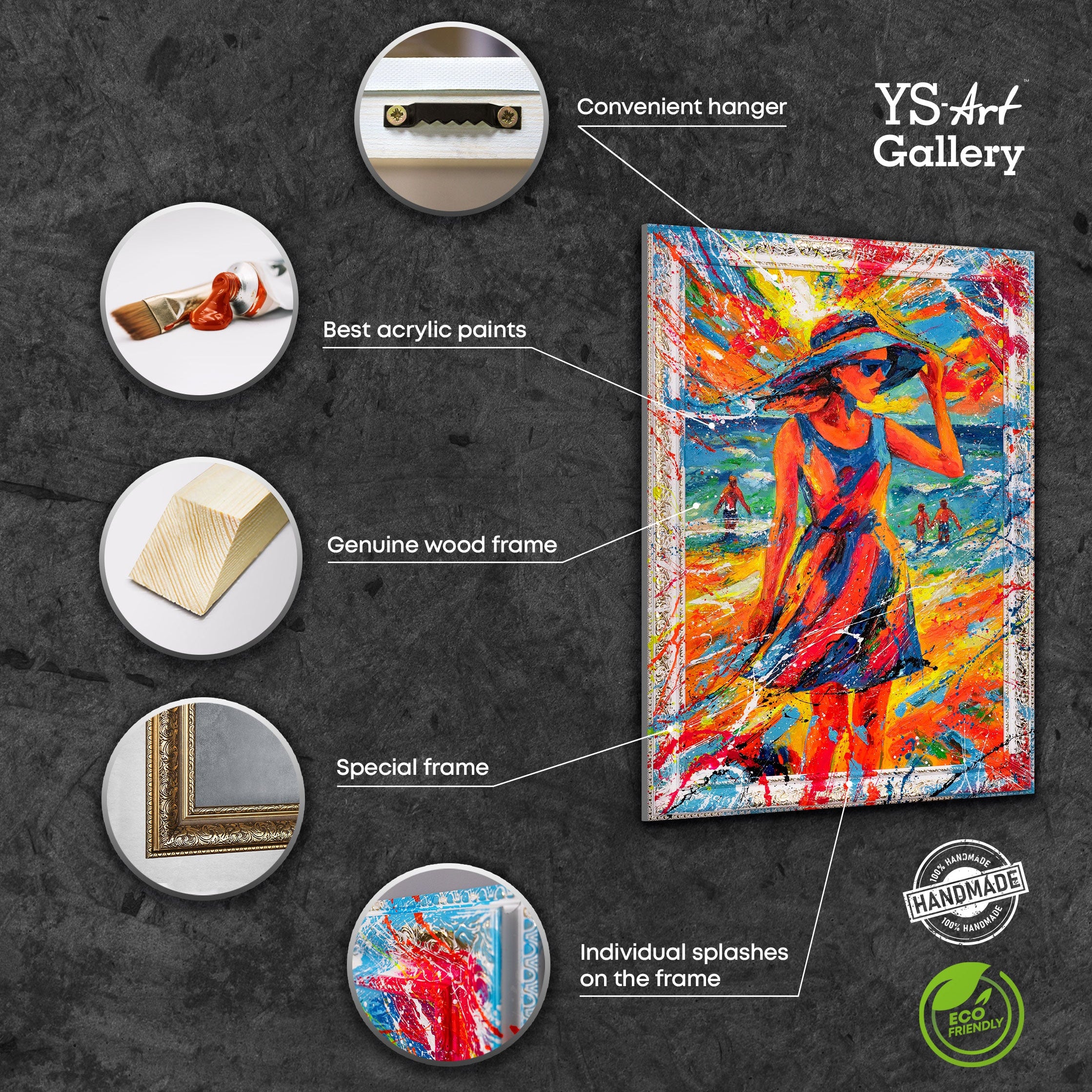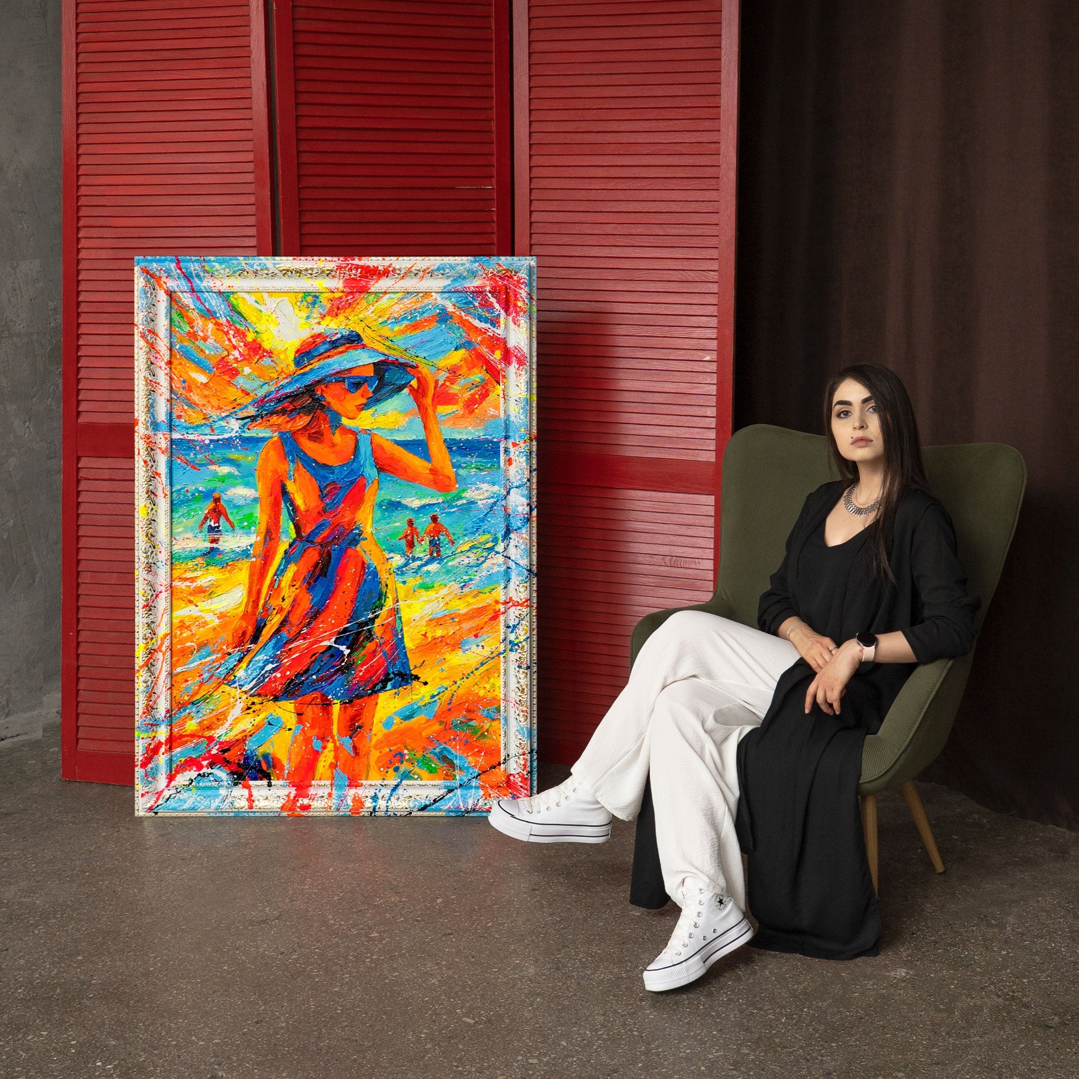 „Sommerlig Ynde“ indfanger letheden og elegancen på en sommerdag: En kvinde i en farverig kjole, med solhat og briller, står ved havet, mens bølger, sol og lys eksploderer bag hende. De levende farver – blå, orange, rød og gul – udstråler energi, frihed og feriestemning. Hvert penselstrøg er håndmalet, og hver farvestribe er et udtryk for kunstnerisk kraft.