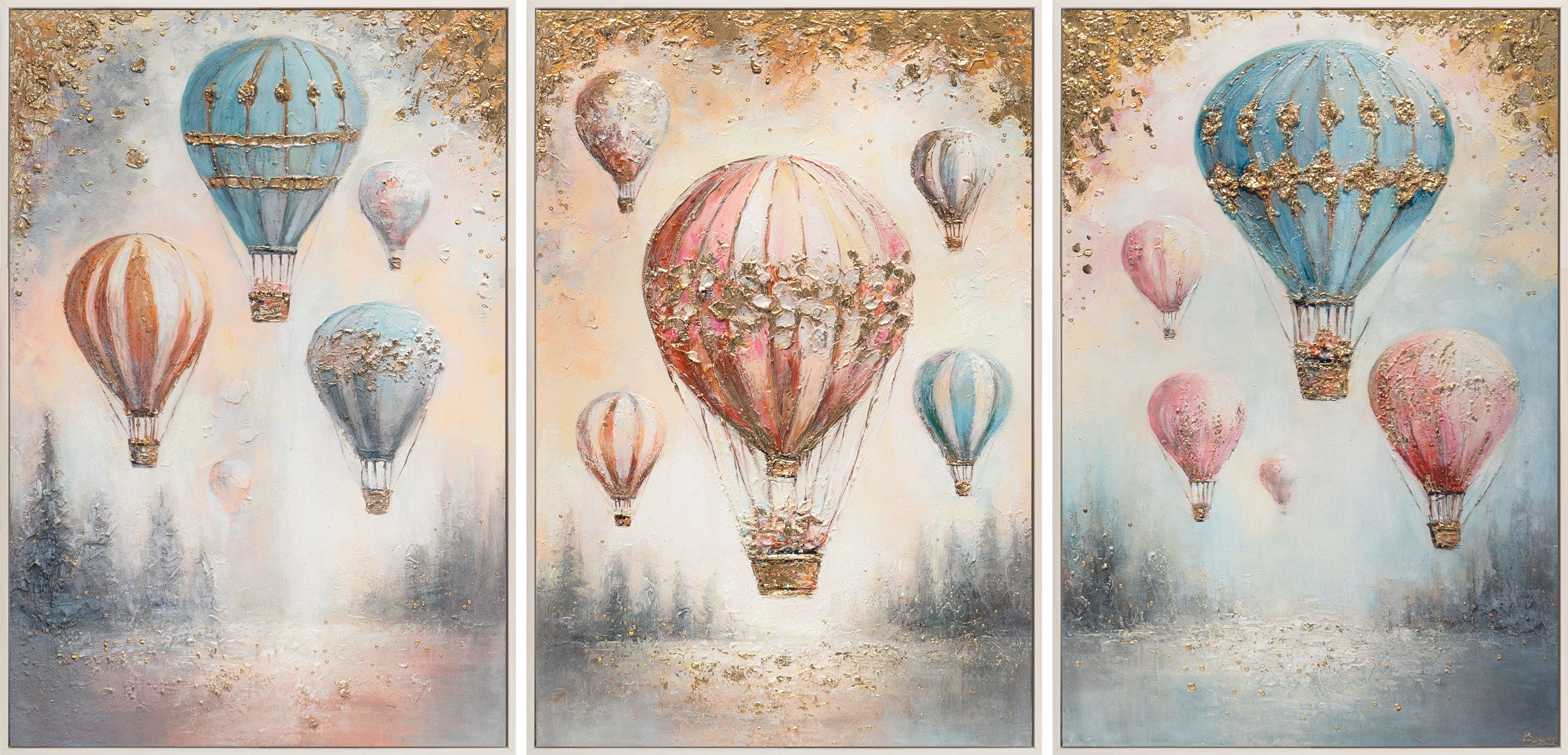 Kolmiosainen triptyykki kankaalle „Ilmavat Unelmat“ on lumoava akryylitriptyykki, joka pastellisävyillä ja rakkaudella maalatuilla ilmapalloaiheilla luo unenomaisen tunnelman lastenhuoneisiin ja vauvanhuoneisiin. Käsinmaalattu akryylimaalaus kankaalle antaa jokaiselle osalle elävän syvyyden ja korostaa kultakorostusten ja pehmeän pilvimaiseman hienovaraisia yksityiskohtia. Tämä taideteos tuo keveyttä ja turvallisuutta, täydellisesti pienimpien viihtyisiin lepopaikkoihin.