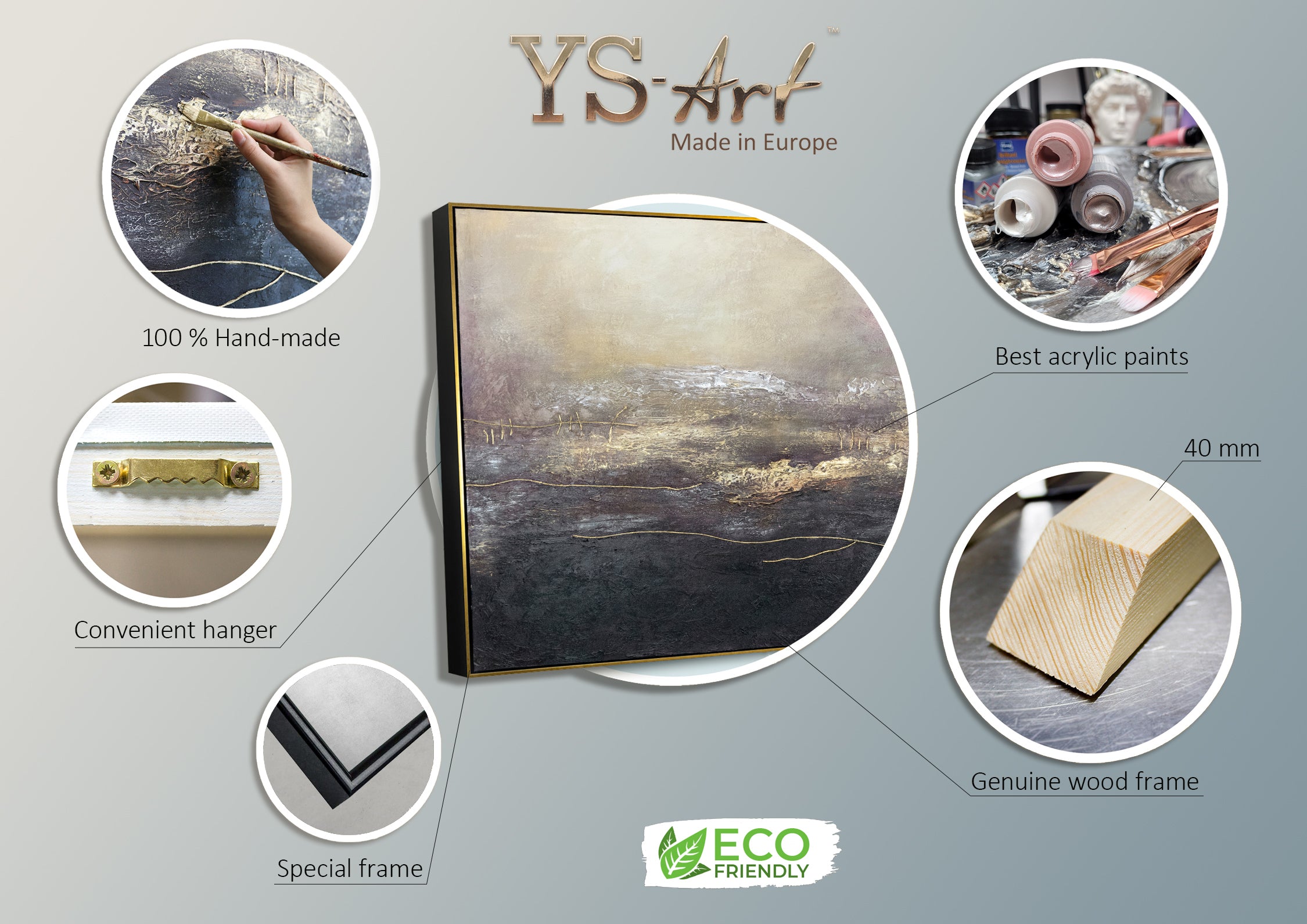 - Materialer: akryl, lærred, kilramme af naturligt træ.