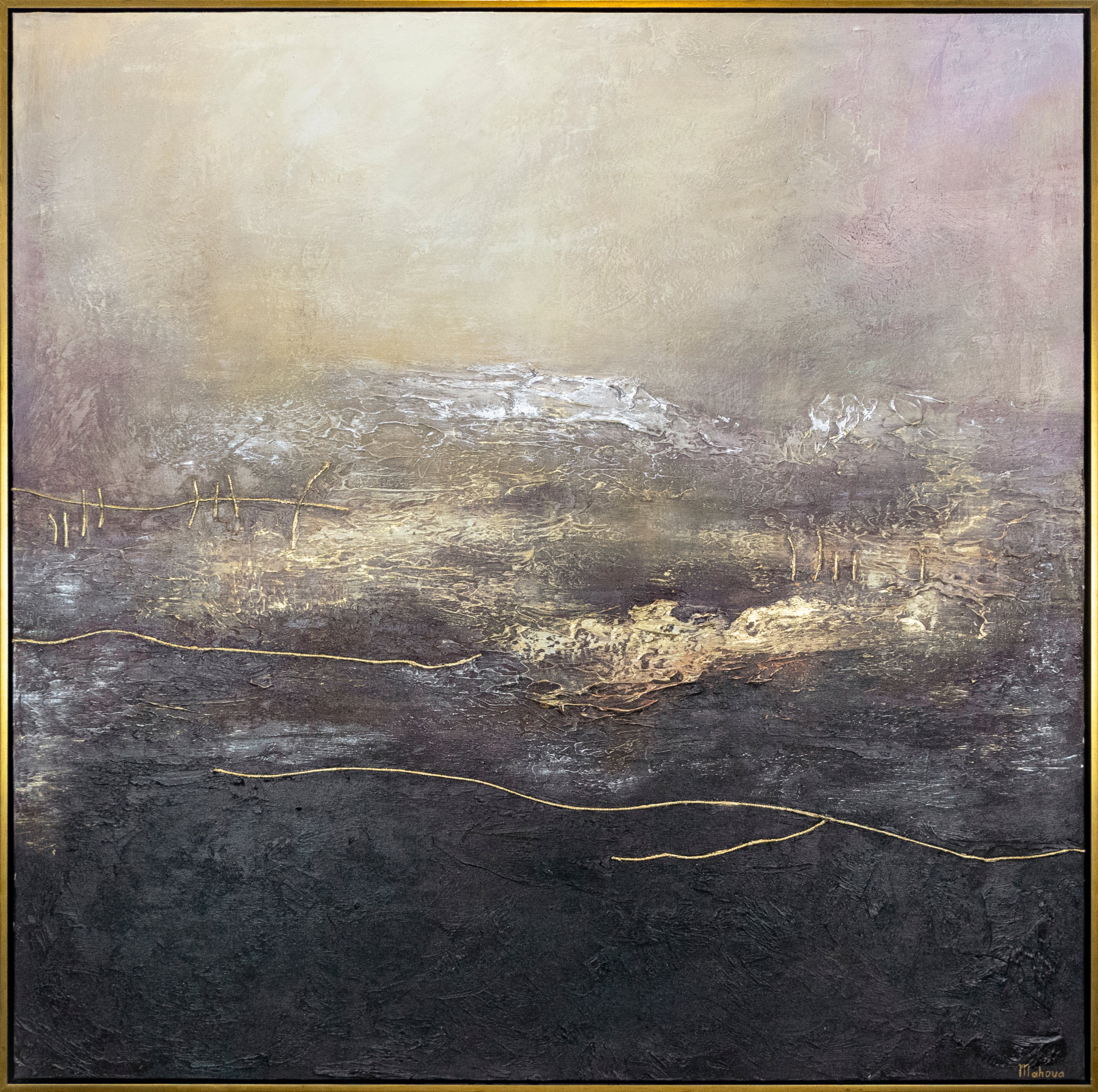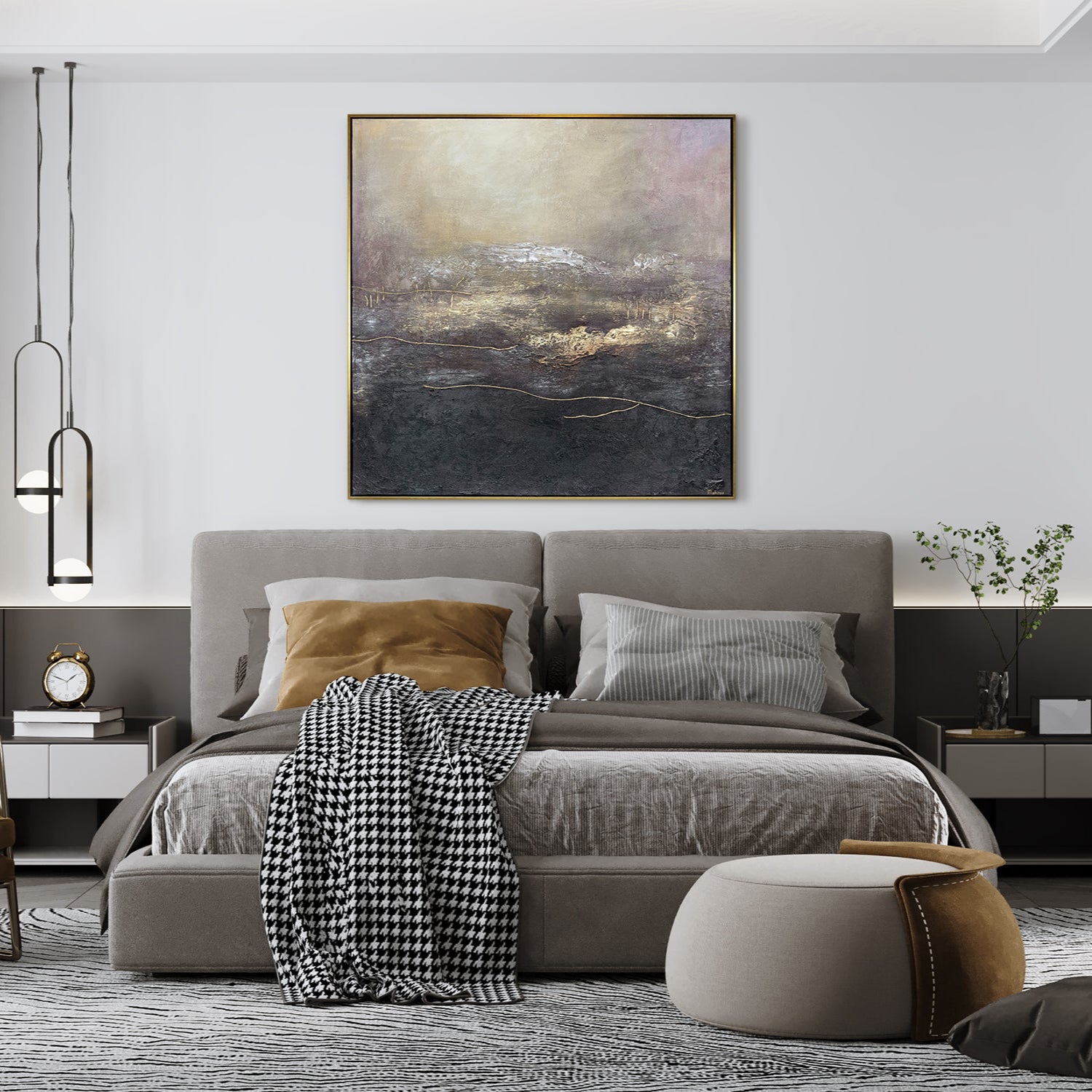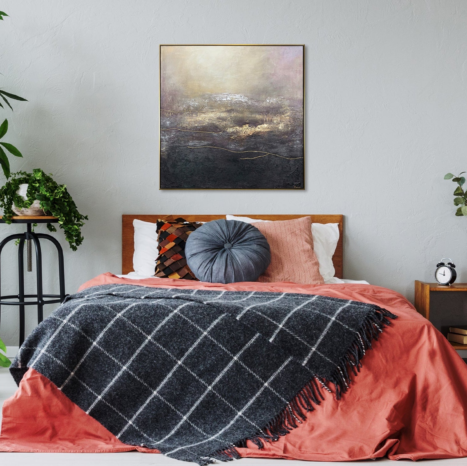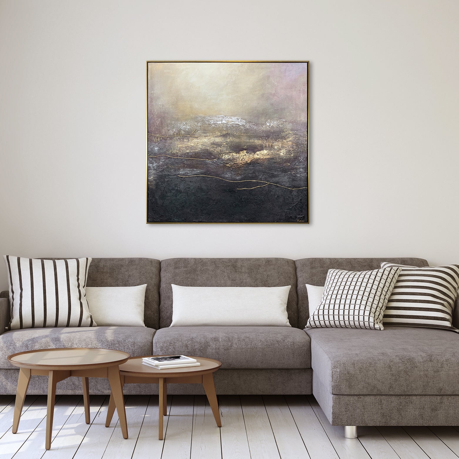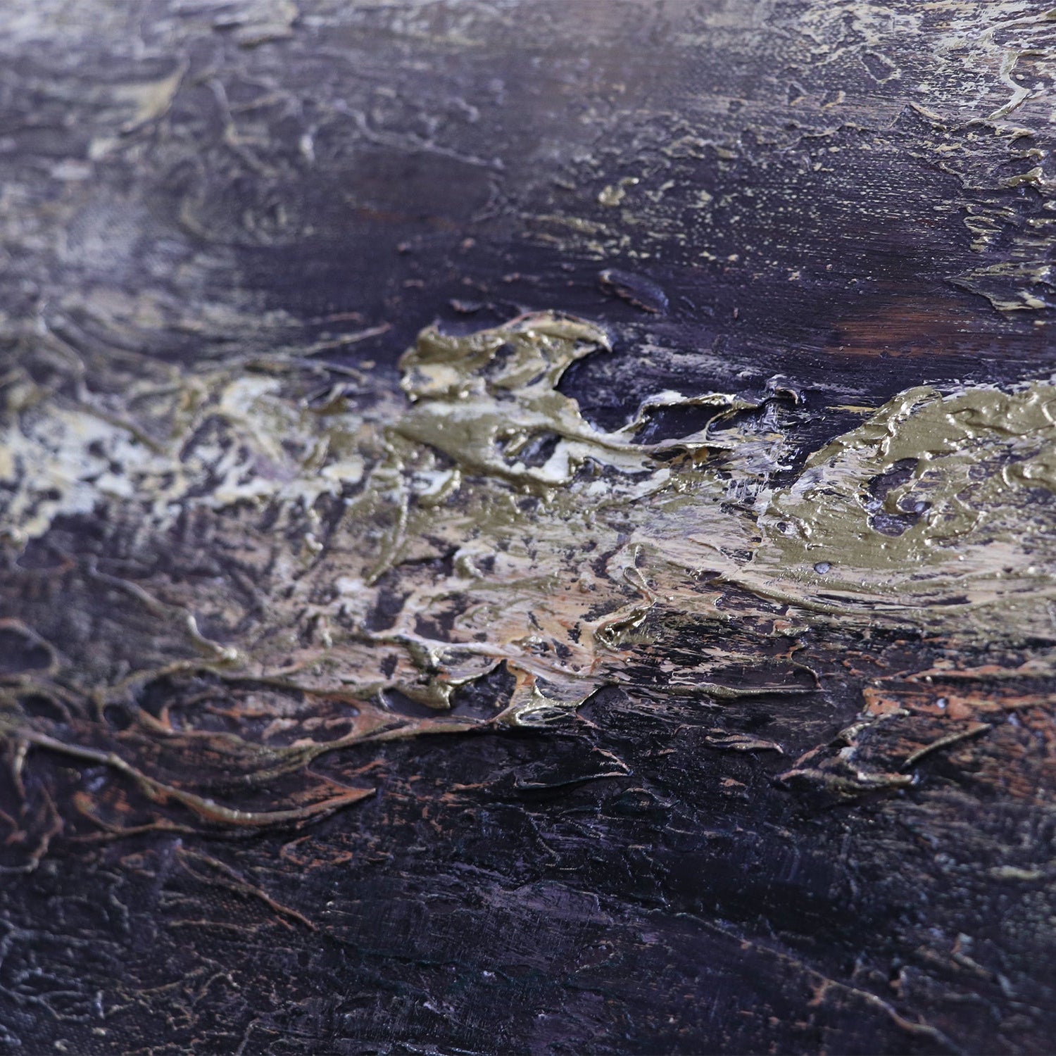 Dette abstrakte maleri med mørke nuancer og ædle bladguldsdetaljer skaber stilfulde kontraster i lyse rum og giver dit hjem en eksklusiv atmosfære. Vores kunstnere bruger kun førsteklasses materialer, der lever op til internationale kvalitetsstandarder.