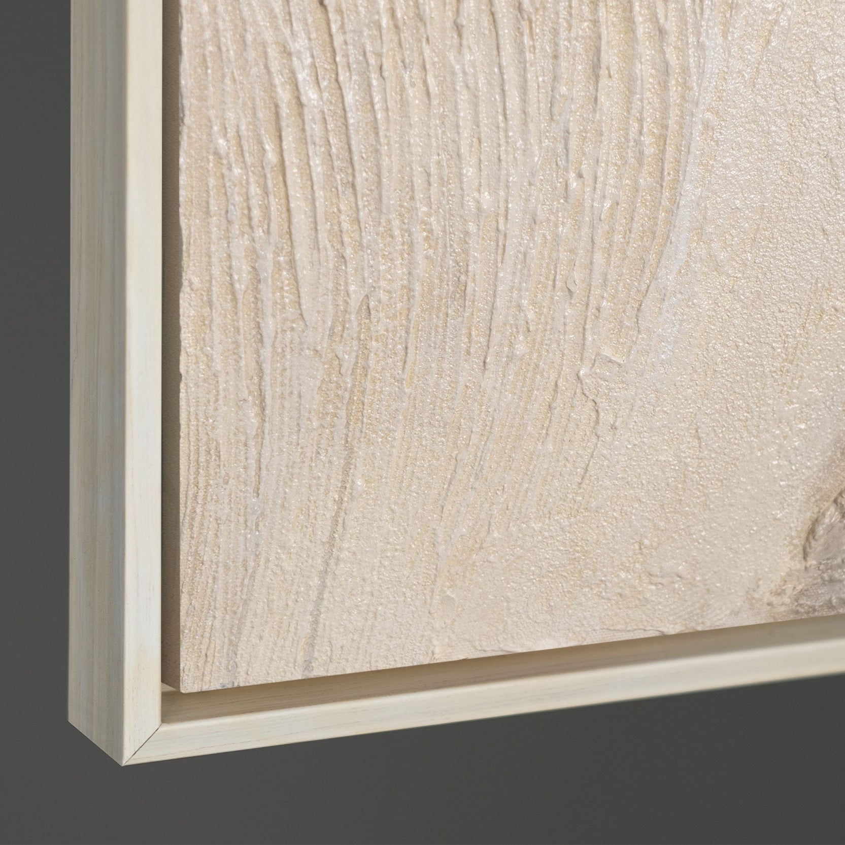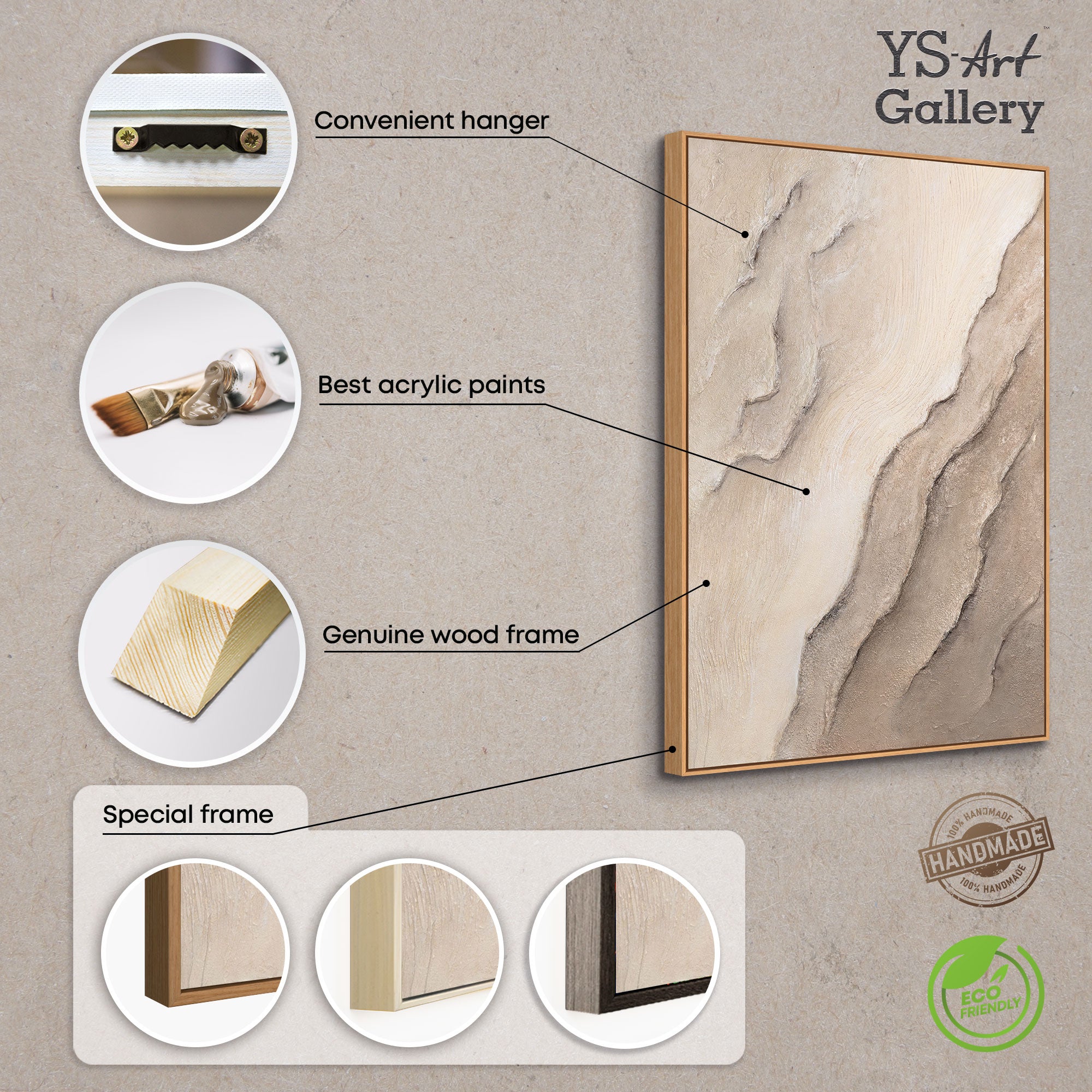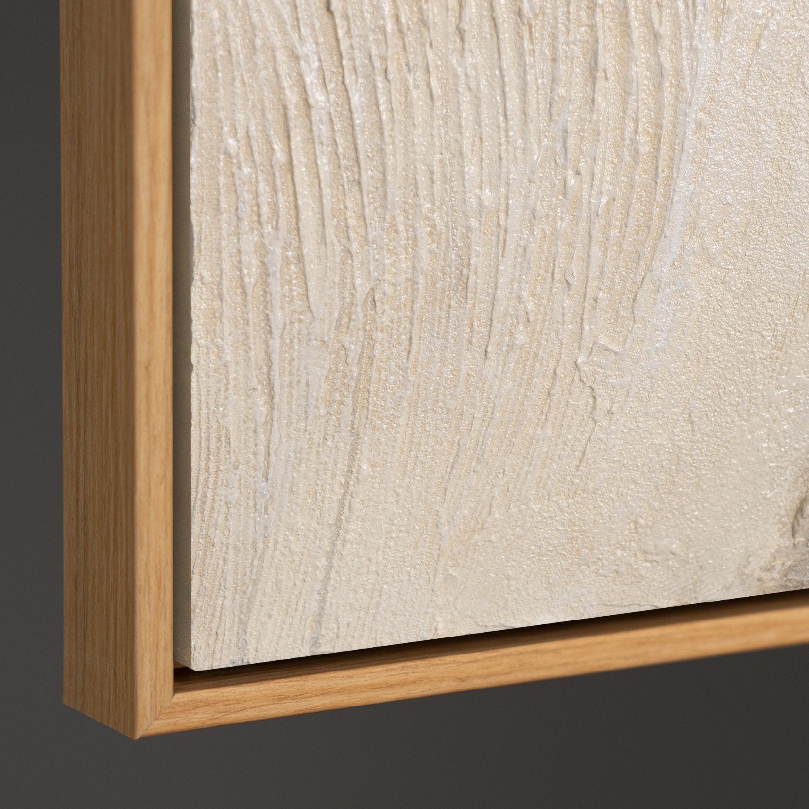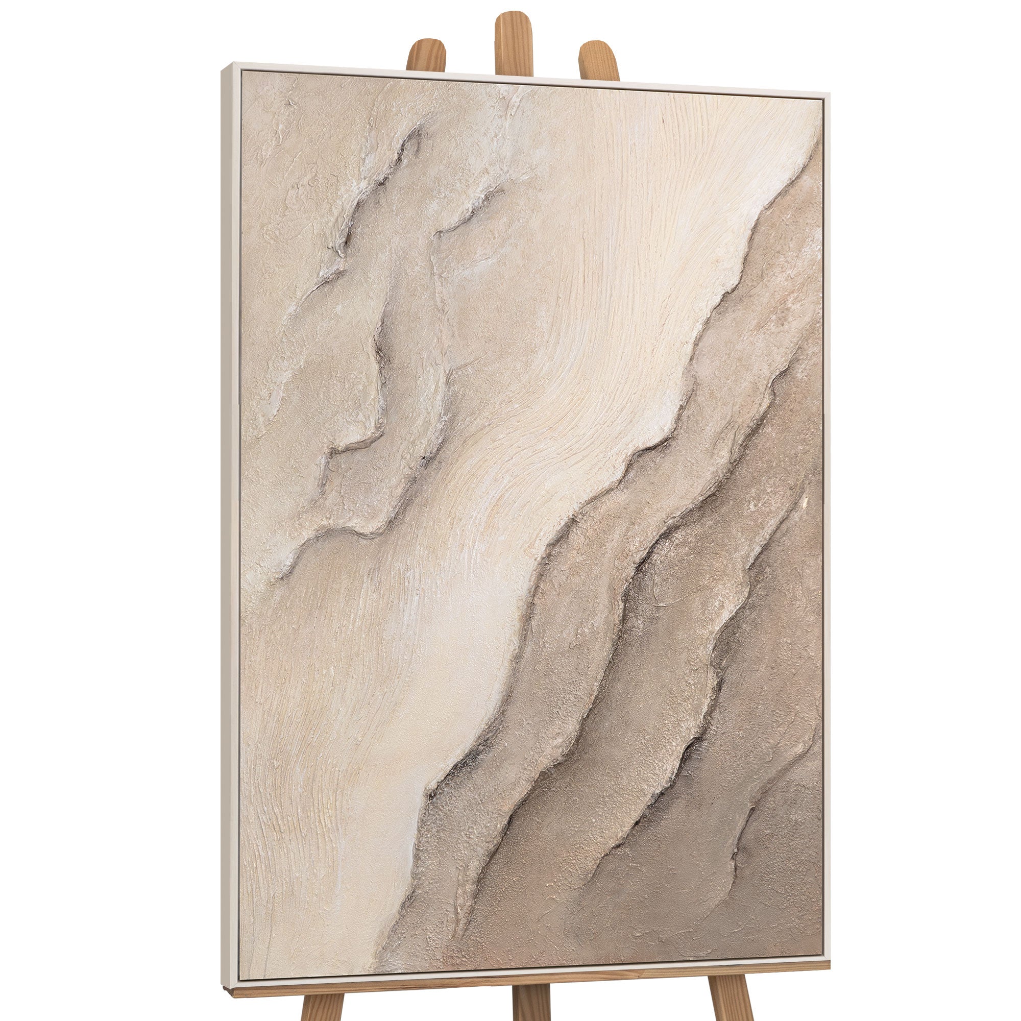 "Tidens Spor" er et håndmalet acrylmaleri, der imponerer med sine bløde linjer og harmoniske strukturer. Farvepaletten i beige-, sand- og naturtoner udstråler ro og tidløshed, mens den reliefagtige struktur tilfører værket dybde og naturlighed. Hver fine linje minder om geologiske lag og skaber en organisk, næsten meditativ virkning.