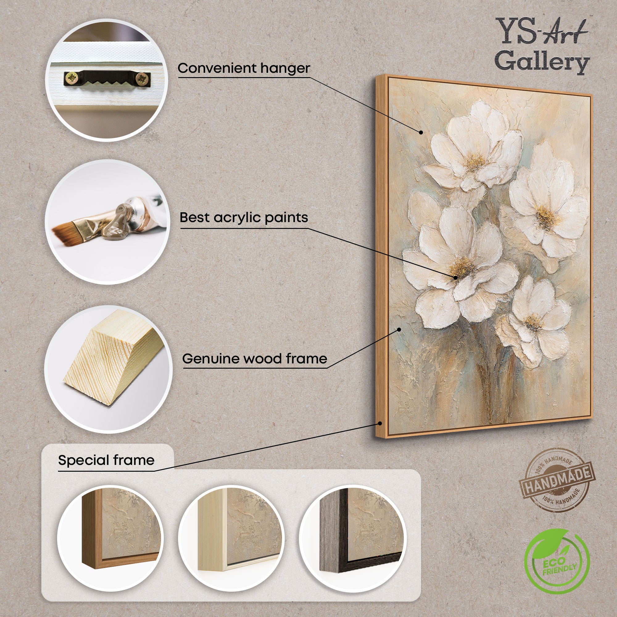 "Sløret af Ømhed" er et håndmalet acrylmaleri, der imponerer med sarte hvide blomster på en varm beige baggrund. Kronbladene fremstår særligt levende gennem den reliefagtige struktur og får en ædel dybde. Bløde farveovergange mellem creme, beige og diskrete guldnuancer giver værket et harmonisk og roligt udtryk.