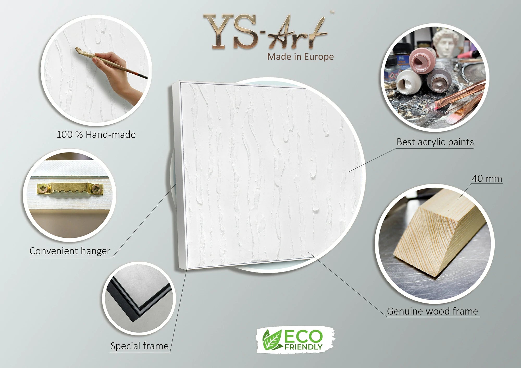 - Materialer: Akryl, lærred, blindramme i naturtræ