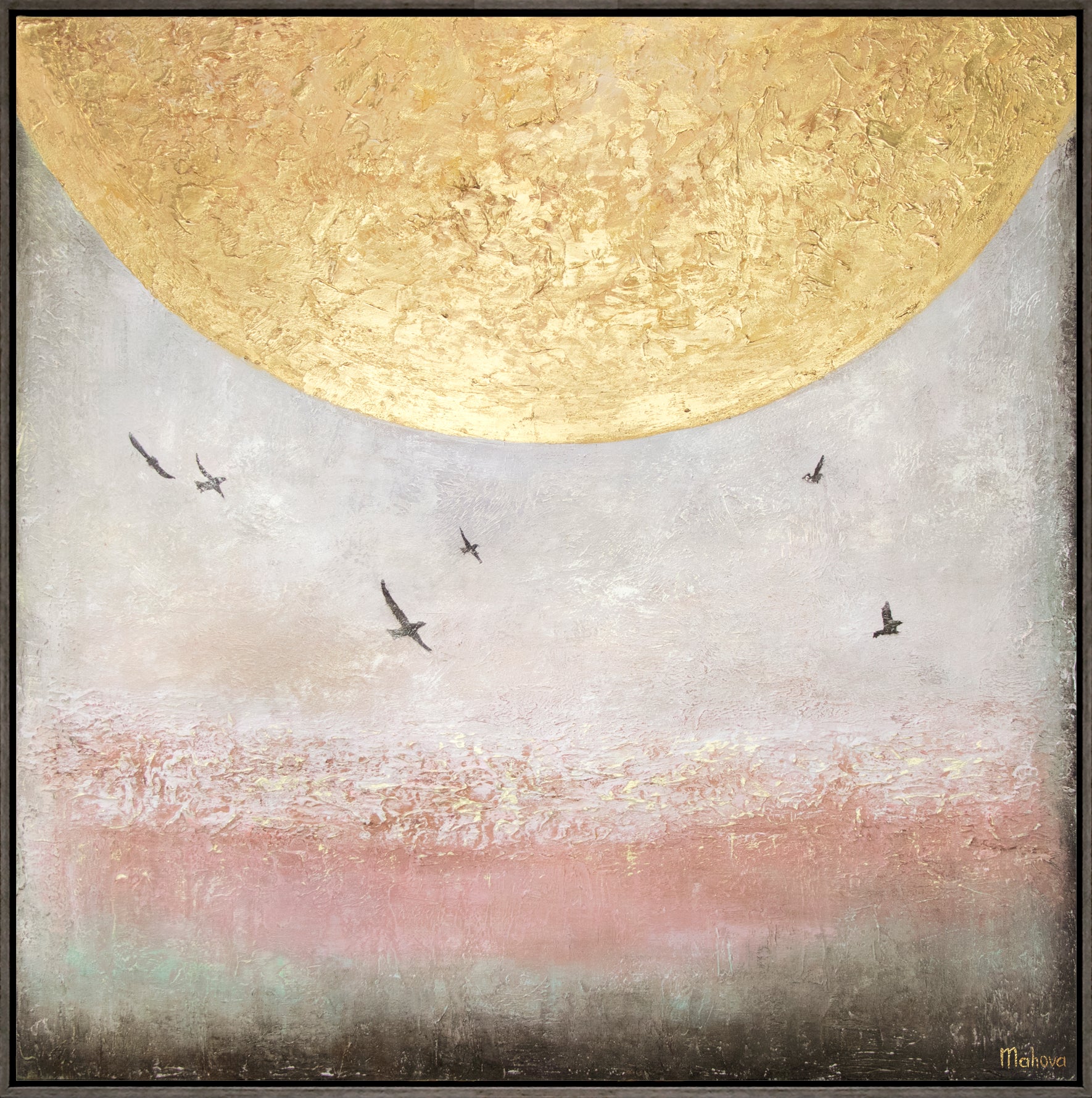 Dette imponerende akrylmaleri forener den beroligende skønhed fra et landskab med den elegante glans fra gyldne detaljer. Den gyldne halvcirkel, der strækker sig over hele billedets bredde, symboliserer den nedgående sol og tilfører værket en majestætisk udstråling. I forgrunden ses blide pastelfarver, der skaber en fredelig stemning, mens de fine detaljer af flyvende fugle bringer maleriet til live. Dette kunstværk er perfekt for alle, der søger en raffineret og beroligende dekoration til hjemmet eller kontoret.