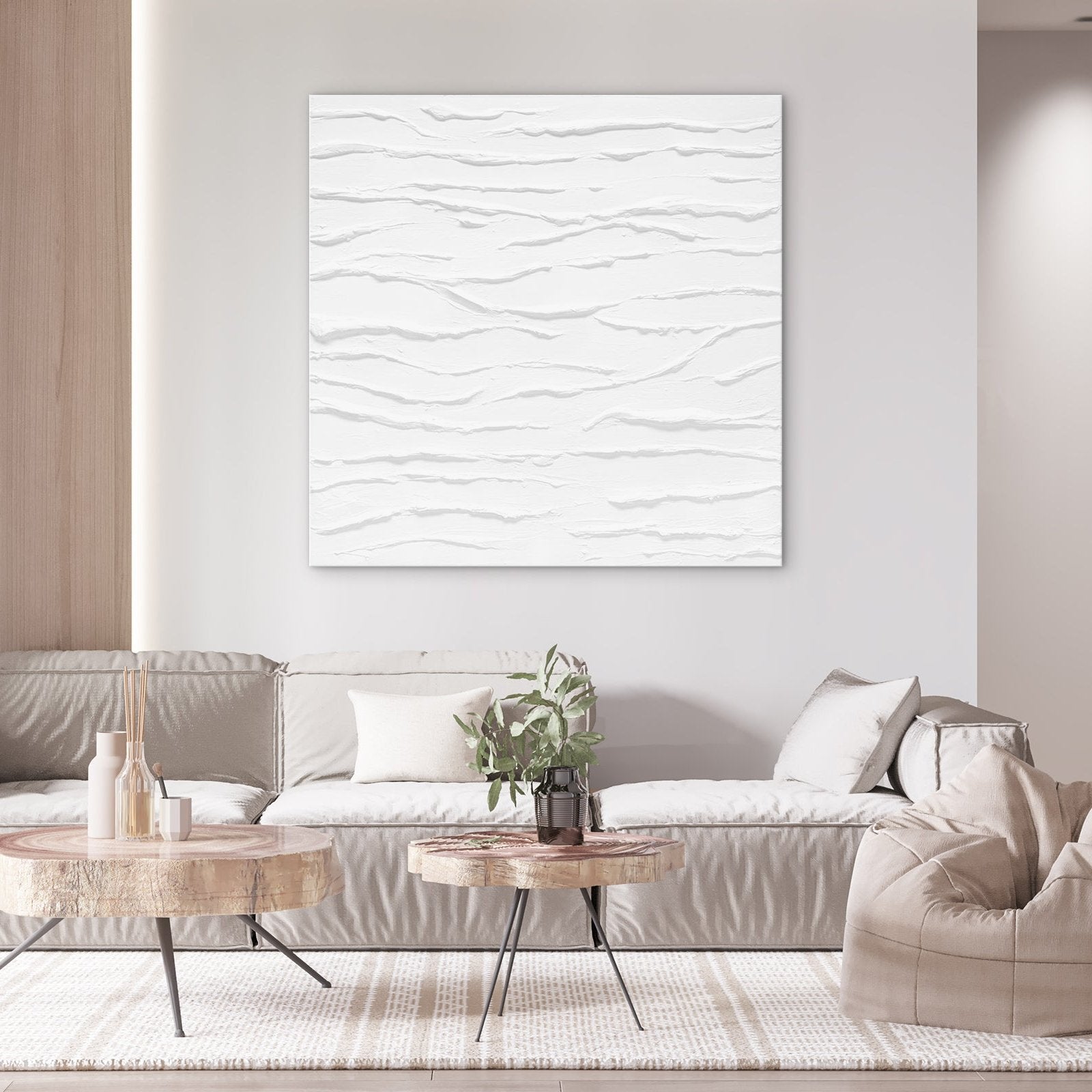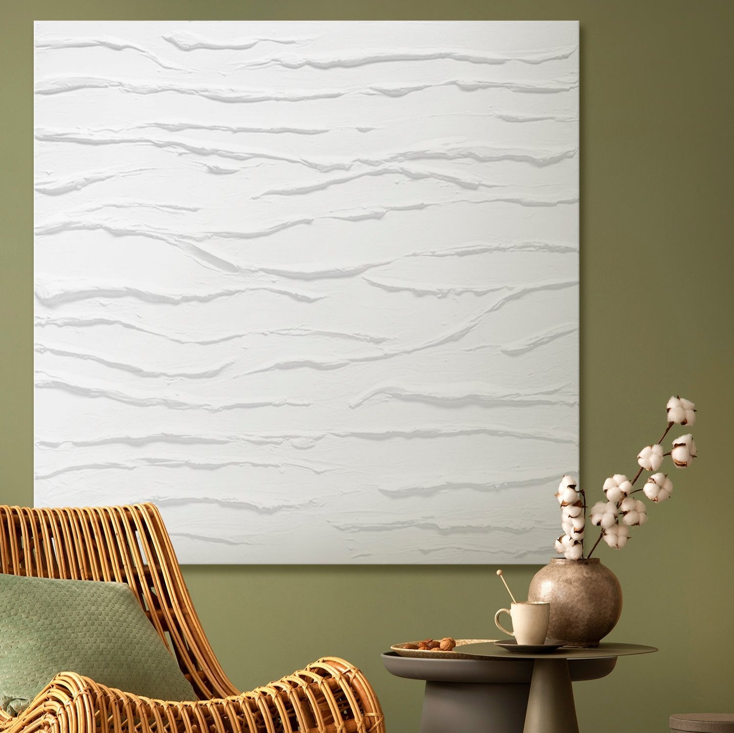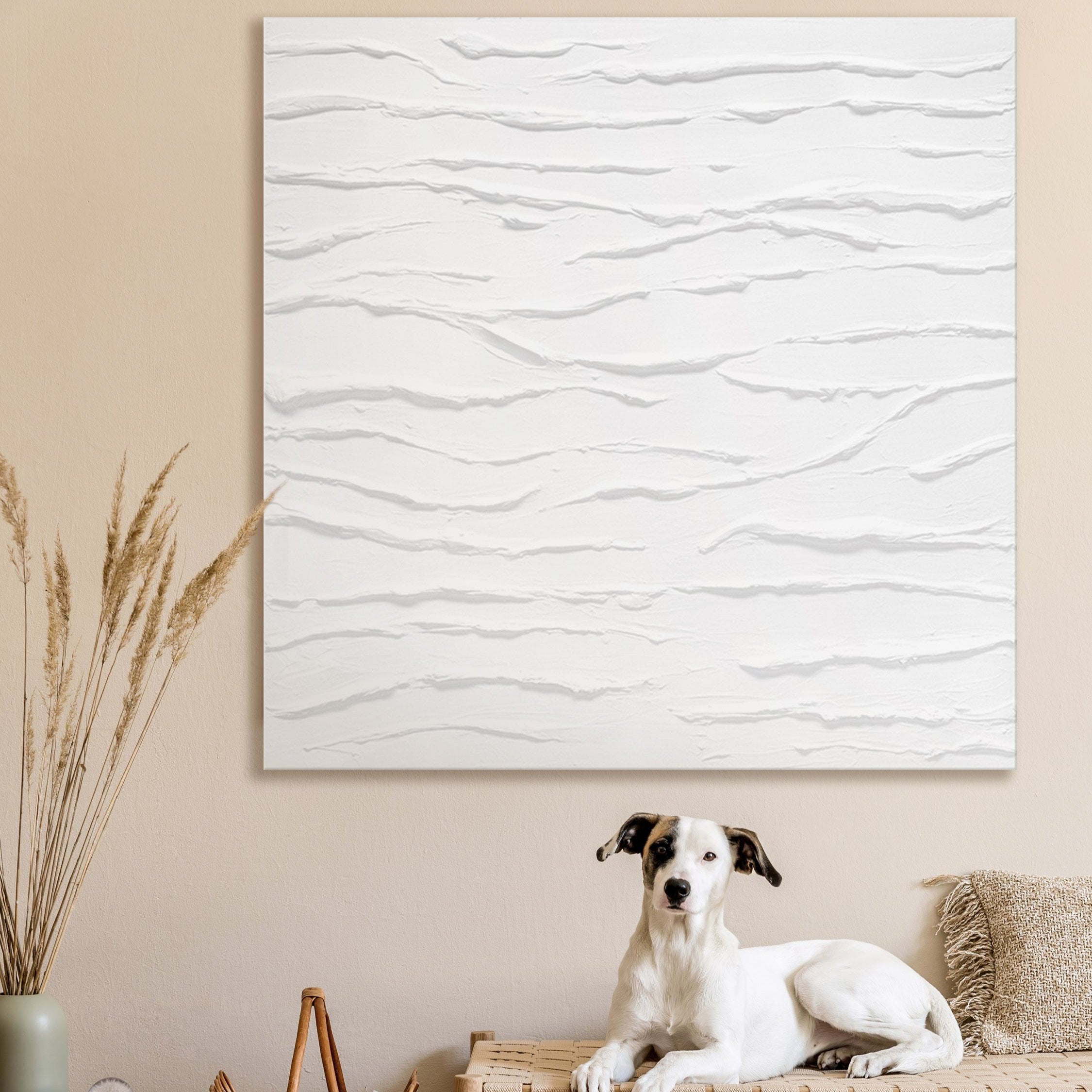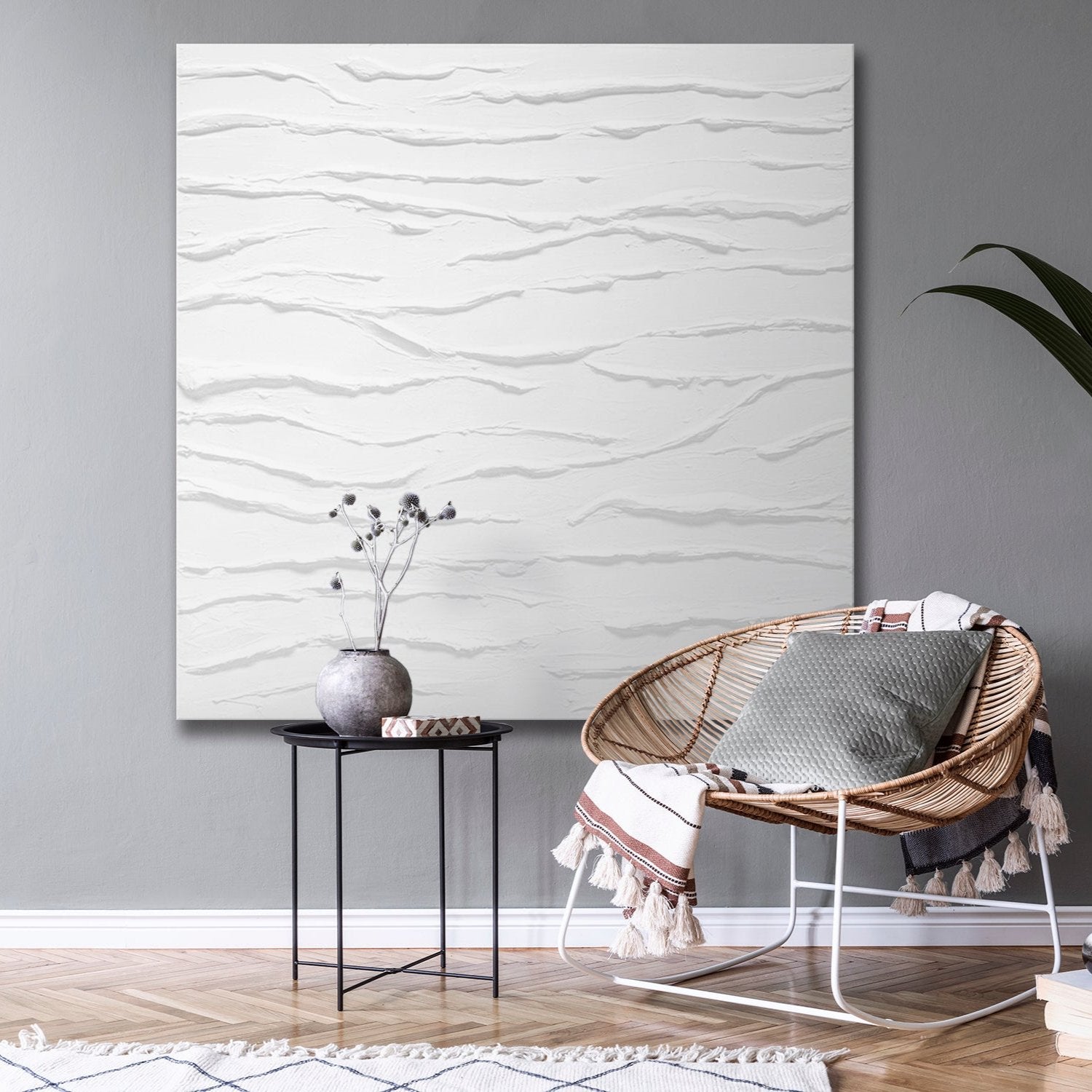 Dette håndmalede kunstværk imponerer med sin klare, hvide struktur, der skaber en beroligende og moderne stemning. De fine teksturer og bølgede mønstre på lærredet giver maleriet en særlig dybde, som skaber harmoni i ethvert rum. Et perfekt kunstværk til minimalistisk kunst og moderne interiør.