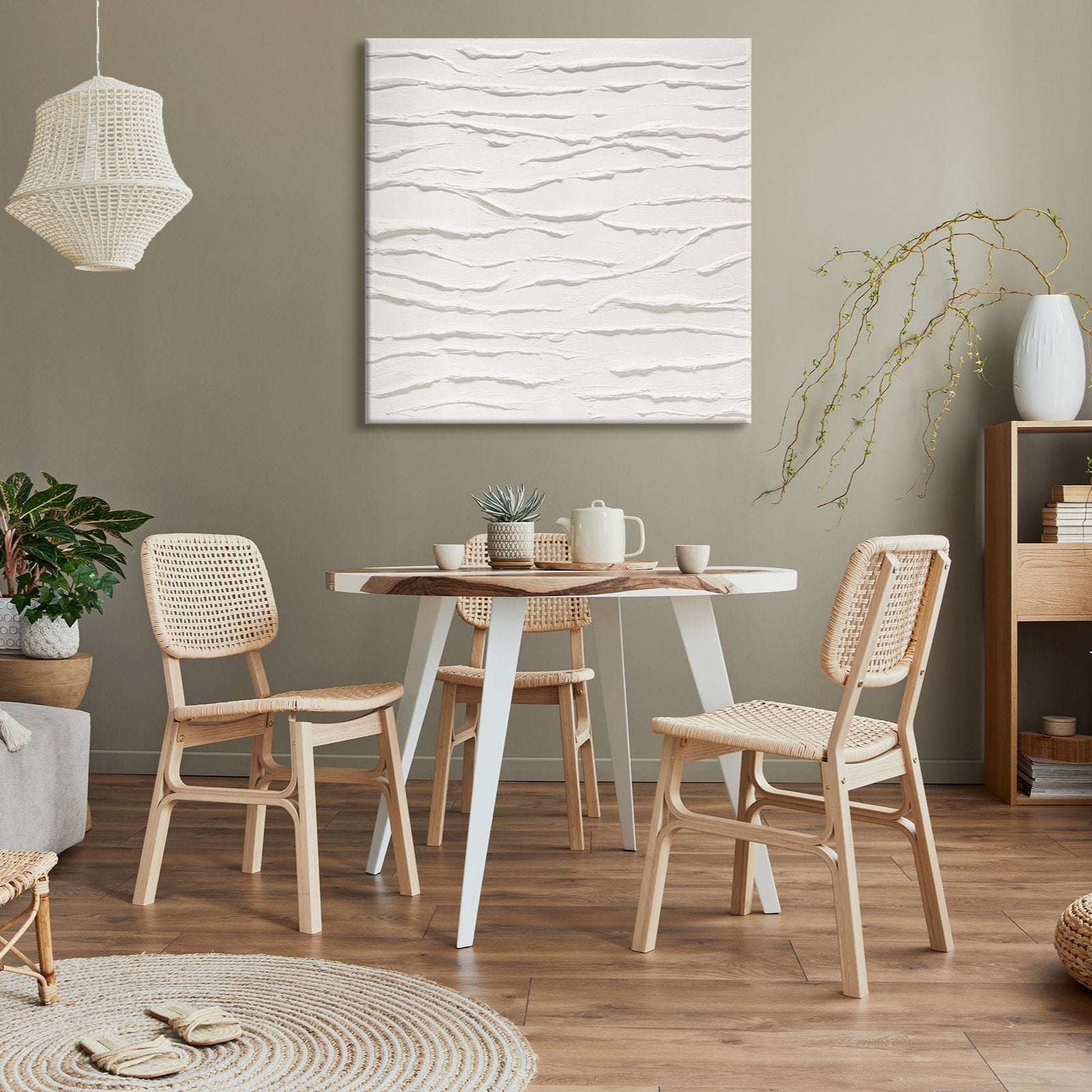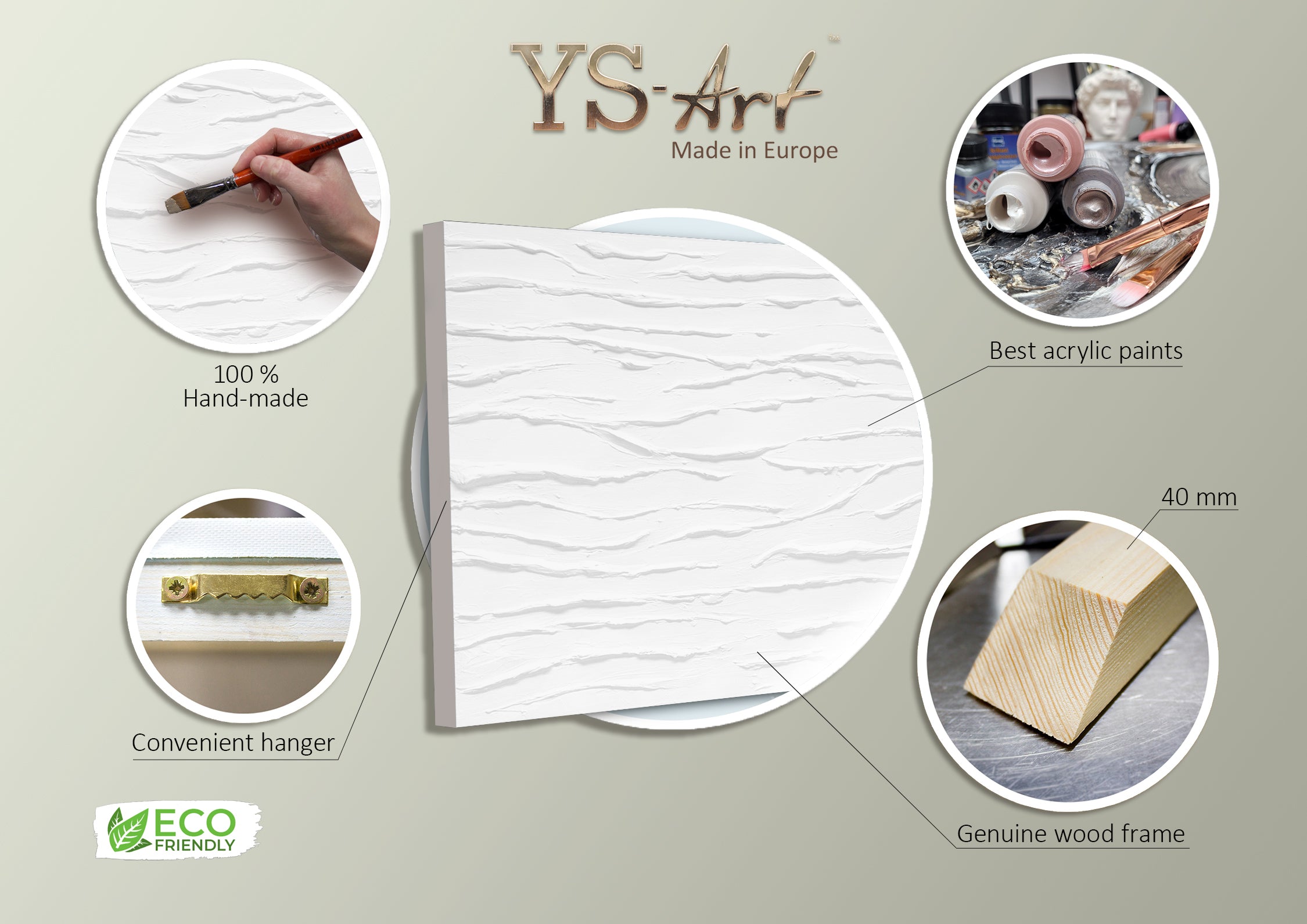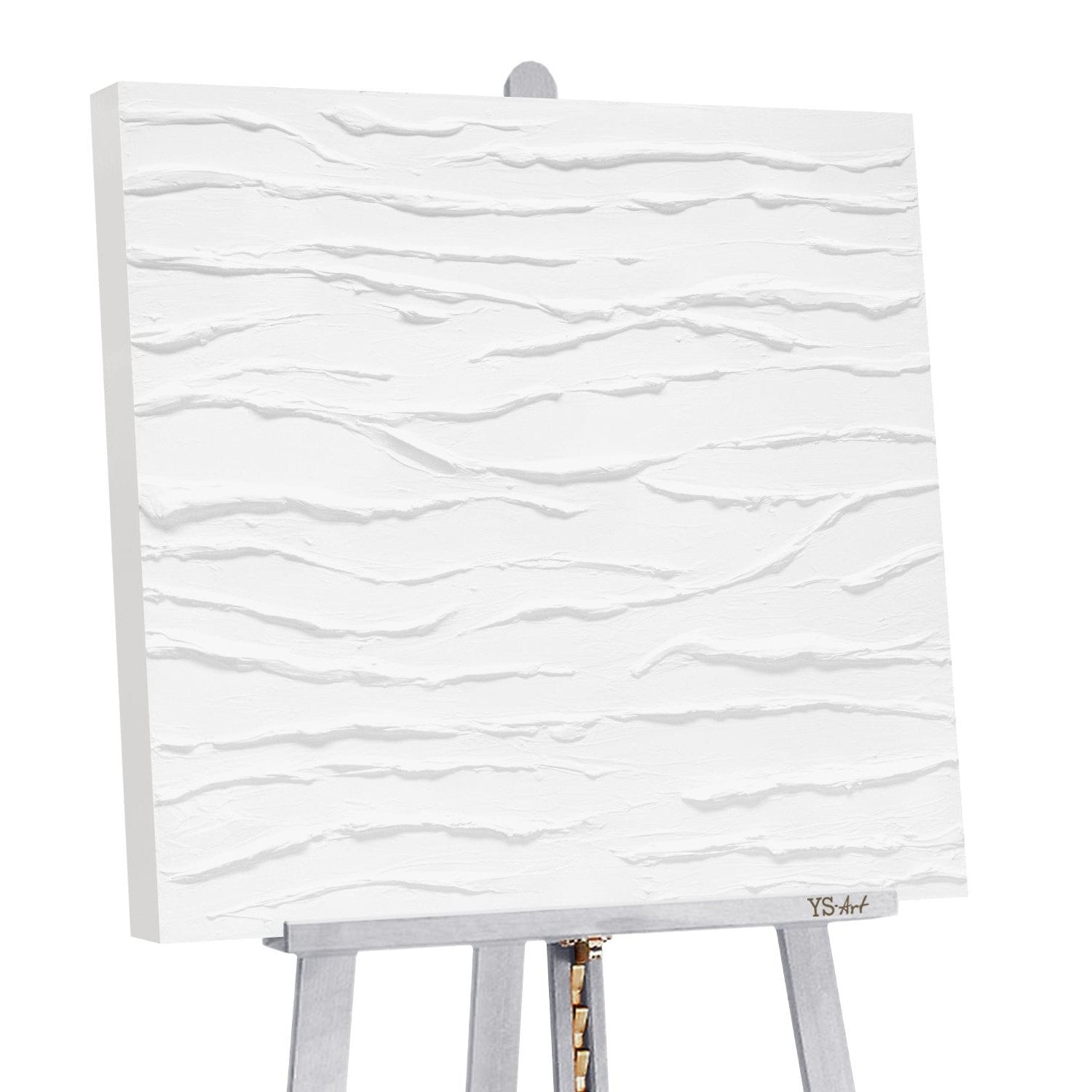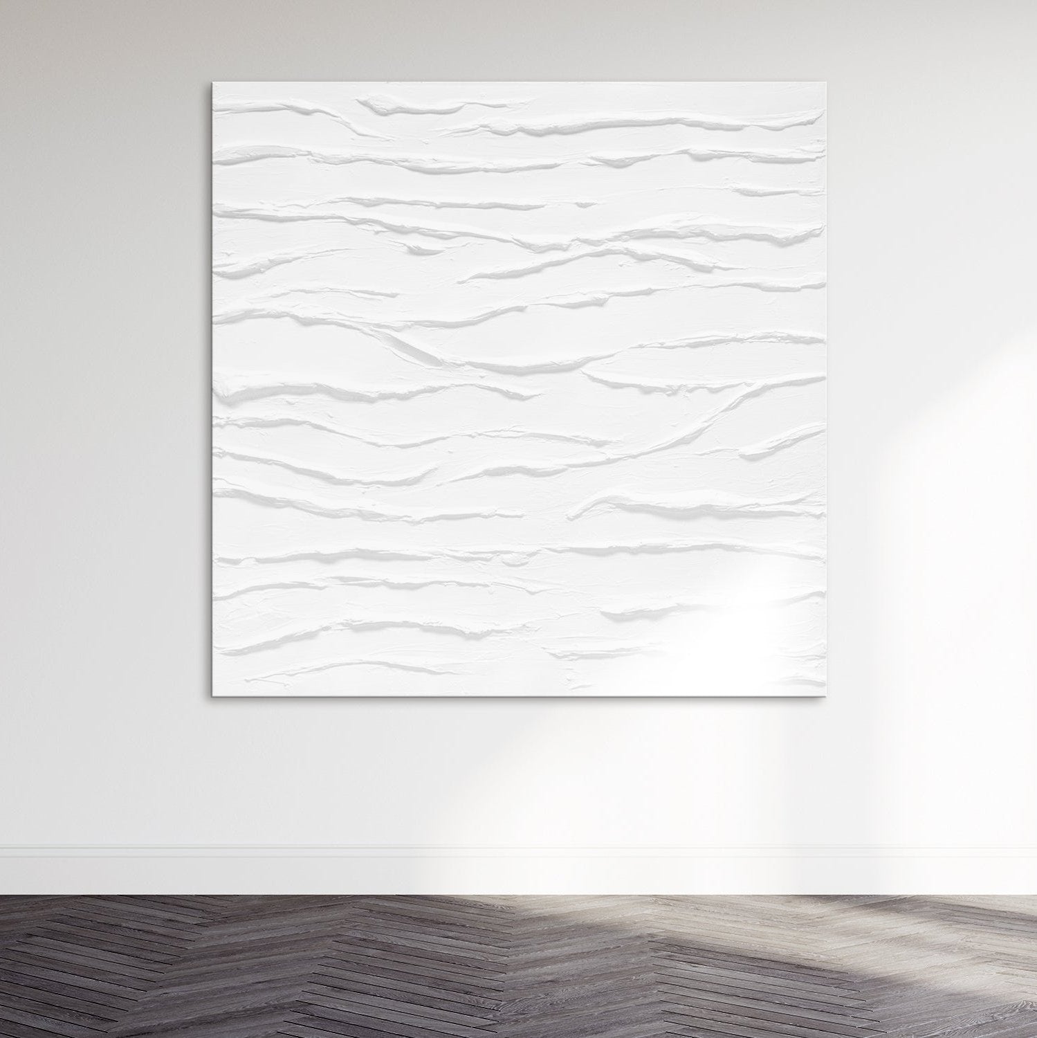 Dette håndmalede kunstværk imponerer med sin klare, hvide struktur, der skaber en beroligende og moderne stemning. De fine teksturer og bølgede mønstre på lærredet giver maleriet en særlig dybde, som skaber harmoni i ethvert rum. Et perfekt kunstværk til minimalistisk kunst og moderne interiør.