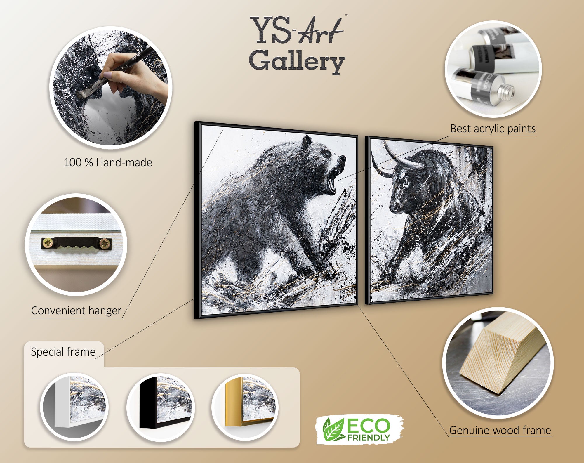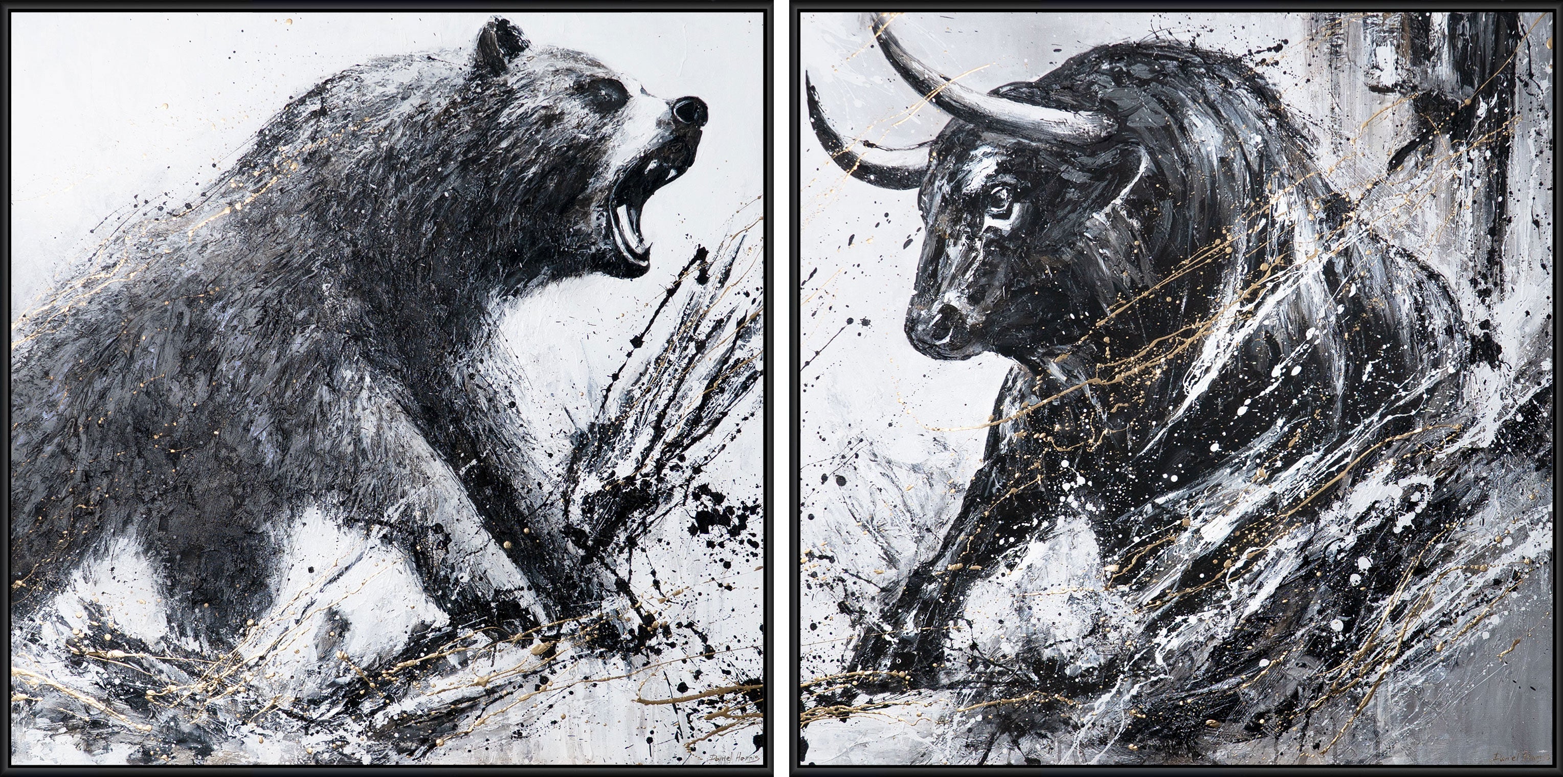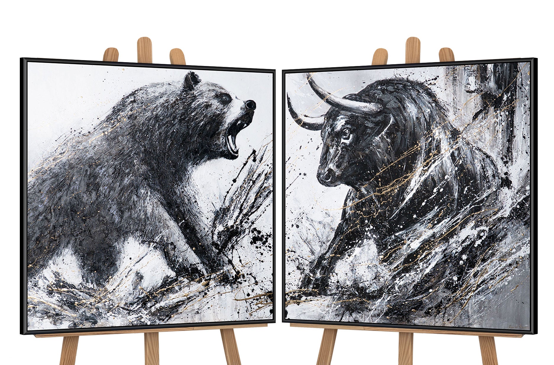 Tämä vaikuttava canvas taulu esittää kaksi voimakasta markkinoiden symbolia: karhun, joka karjuu, ja hyökkäävän härän. Kontrastikkaassa mustavalkoisessa sävyssä, joissa on kultaisia yksityiskohtia, nämä kaksi kangasta heijastavat paitsi eläinvoimaa myös tunteellisia vastakohtia, kuten hyökkäys ja puolustus, kontrolli ja impulssi. Siveltimenvedot ja dynaamiset väriroiskeet tuovat aiheisiin lisää jännitettä ja ilmaisukykyä.